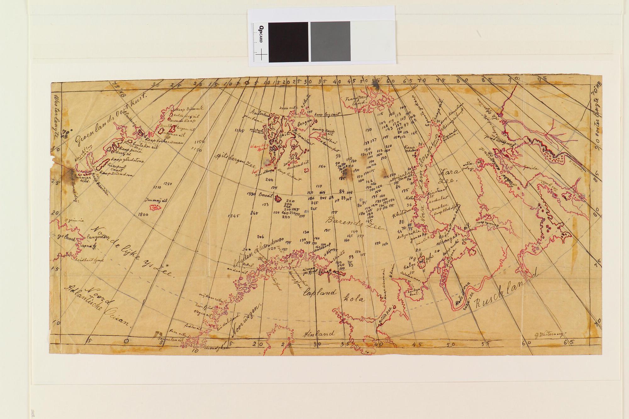 Tekening van een kaart met daarop afgebeeld de zeeën en landen in het gebied van de expeditie met de Willem Barents. Uit een serie tekeningen gemaakt tijdens de tochten met de poolschoener Willem Barents van 1878 tot 1884.