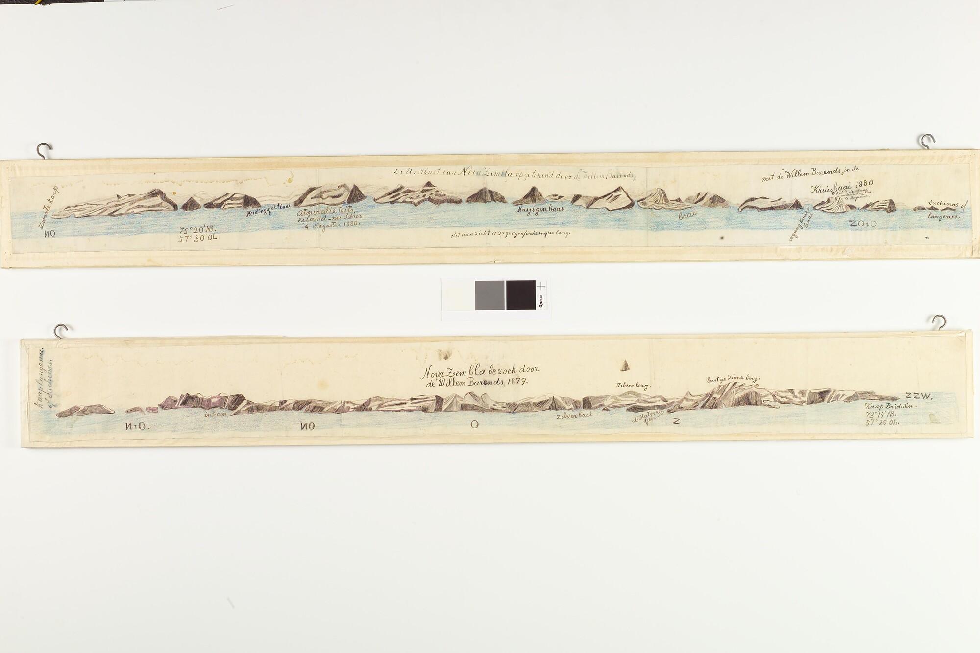 Tekening op een plank met een panorama van de westkust van Nova Zembla. Uit een serie tekeningen gemaakt tijdens de tochten met de poolschoener Willem Barents van 1878 tot 1884.