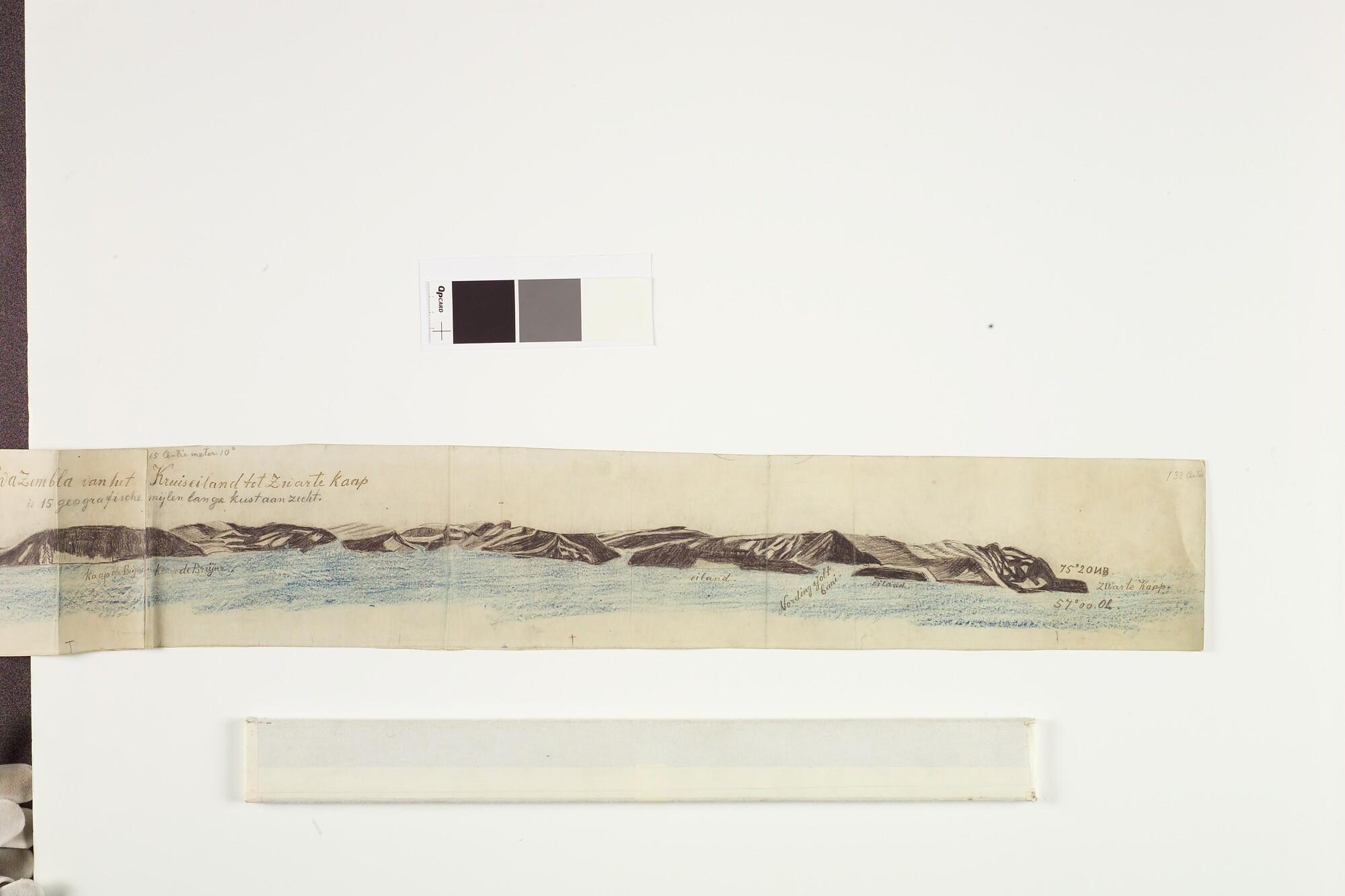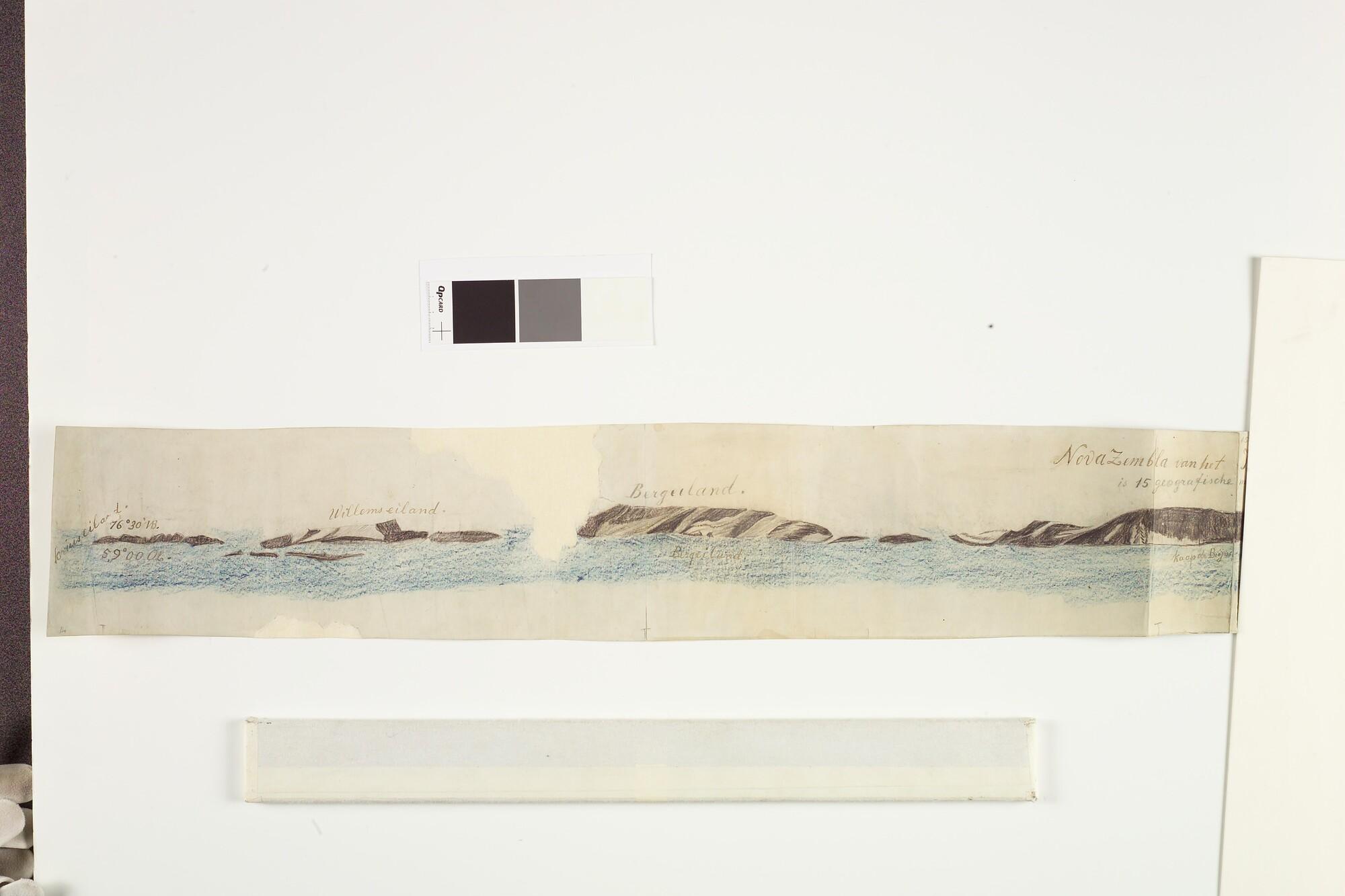 Tekening met een panorama van de kust van Nova Zembla, van het Kruiseiland tot de Zwarte Kaap. Uit een serie tekeningen gemaakt tijdens de tochten met de poolschoener Willem Barents van 1878 tot 1884.