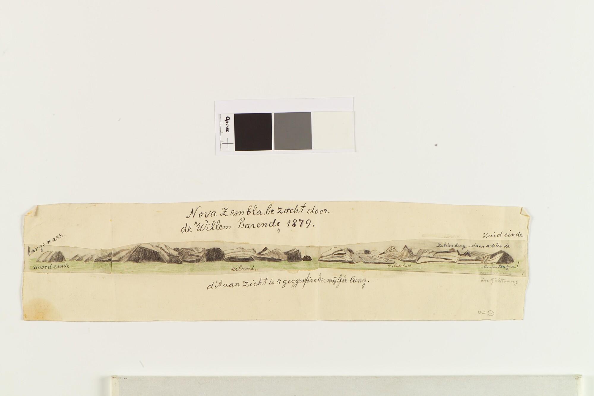 Tekening met een panorama van de kust van Nova Zembla. Uit een serie tekeningen gemaakt tijdens de tochten met de poolschoener Willem Barents van 1878 tot 1884.
