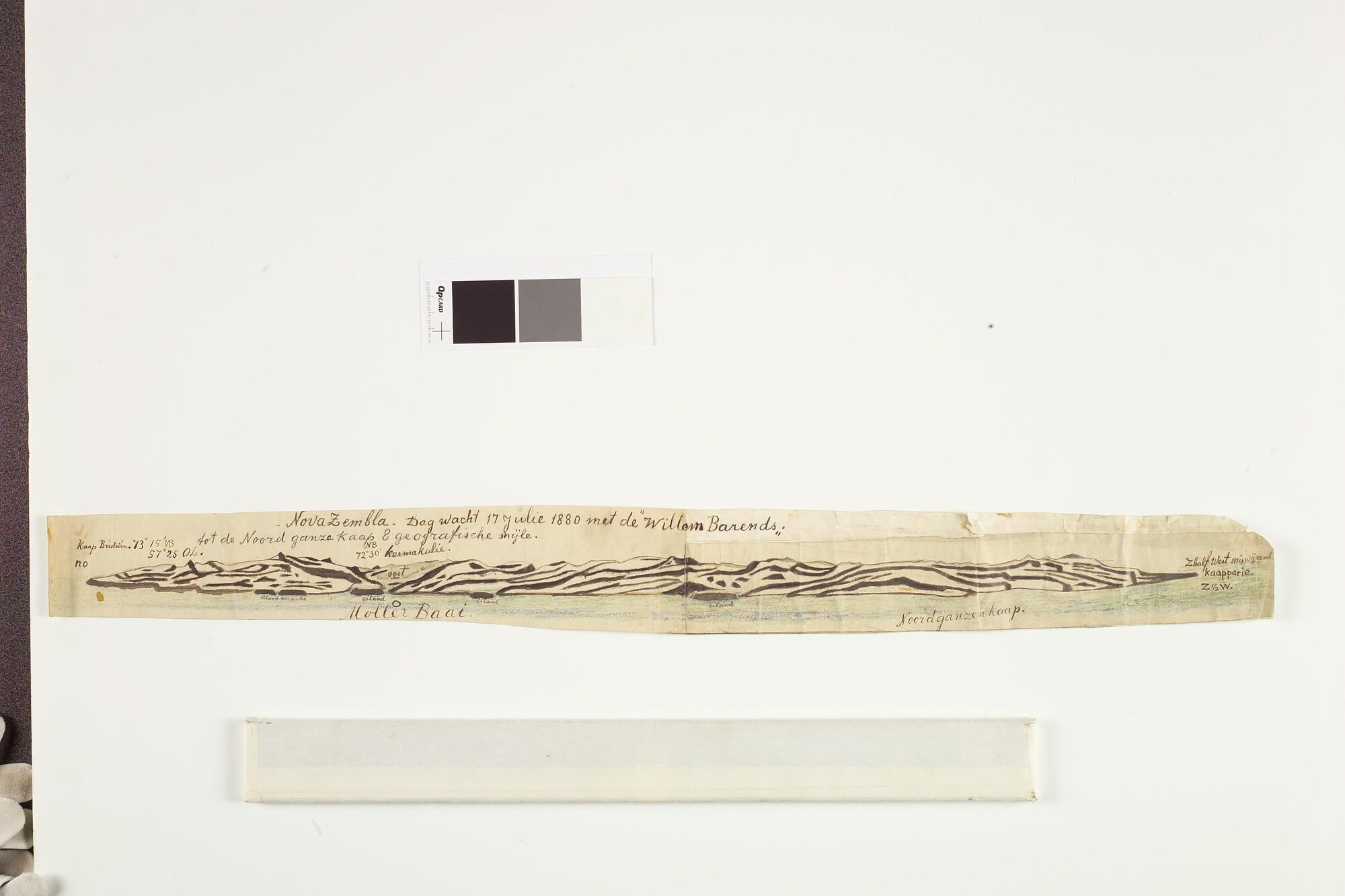 Tekening met een panorama van de kust van Nova Zembla. Uit een serie tekeningen gemaakt tijdens de tochten met de poolschoener Willem Barents van 1878 tot 1884.