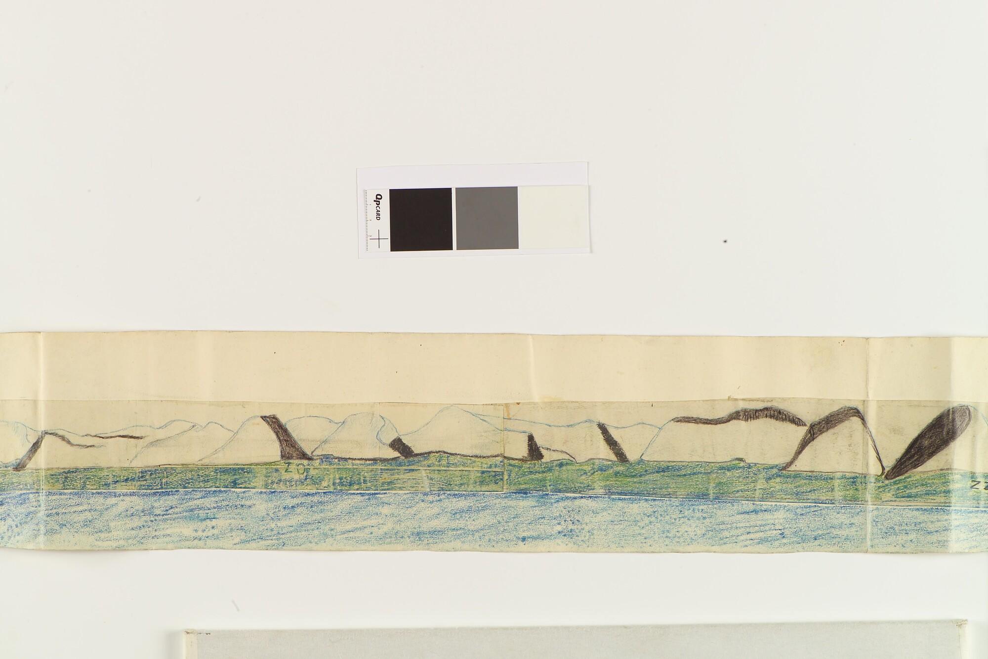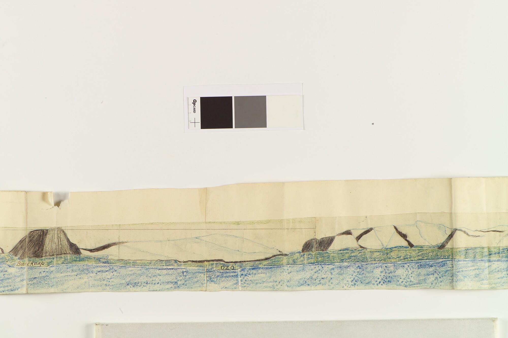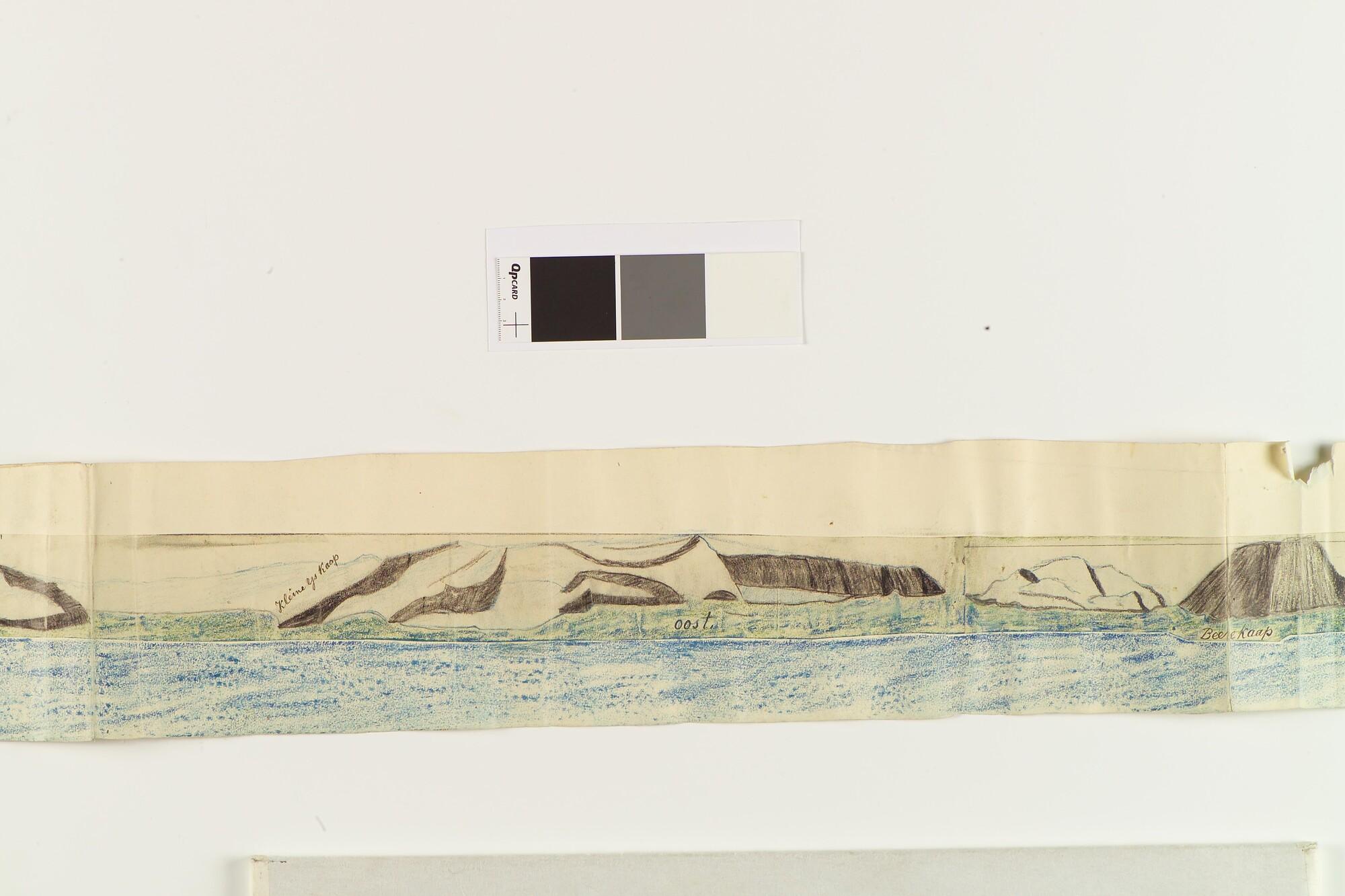 Tekening met een panorama van de kust van Nova Zembla. Uit een serie tekeningen gemaakt tijdens de tochten met de poolschoener Willem Barents van 1878 tot 1884.