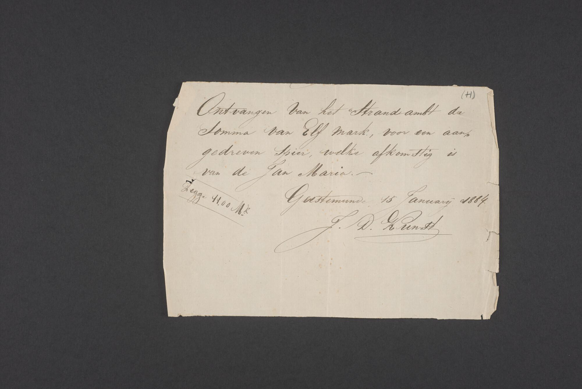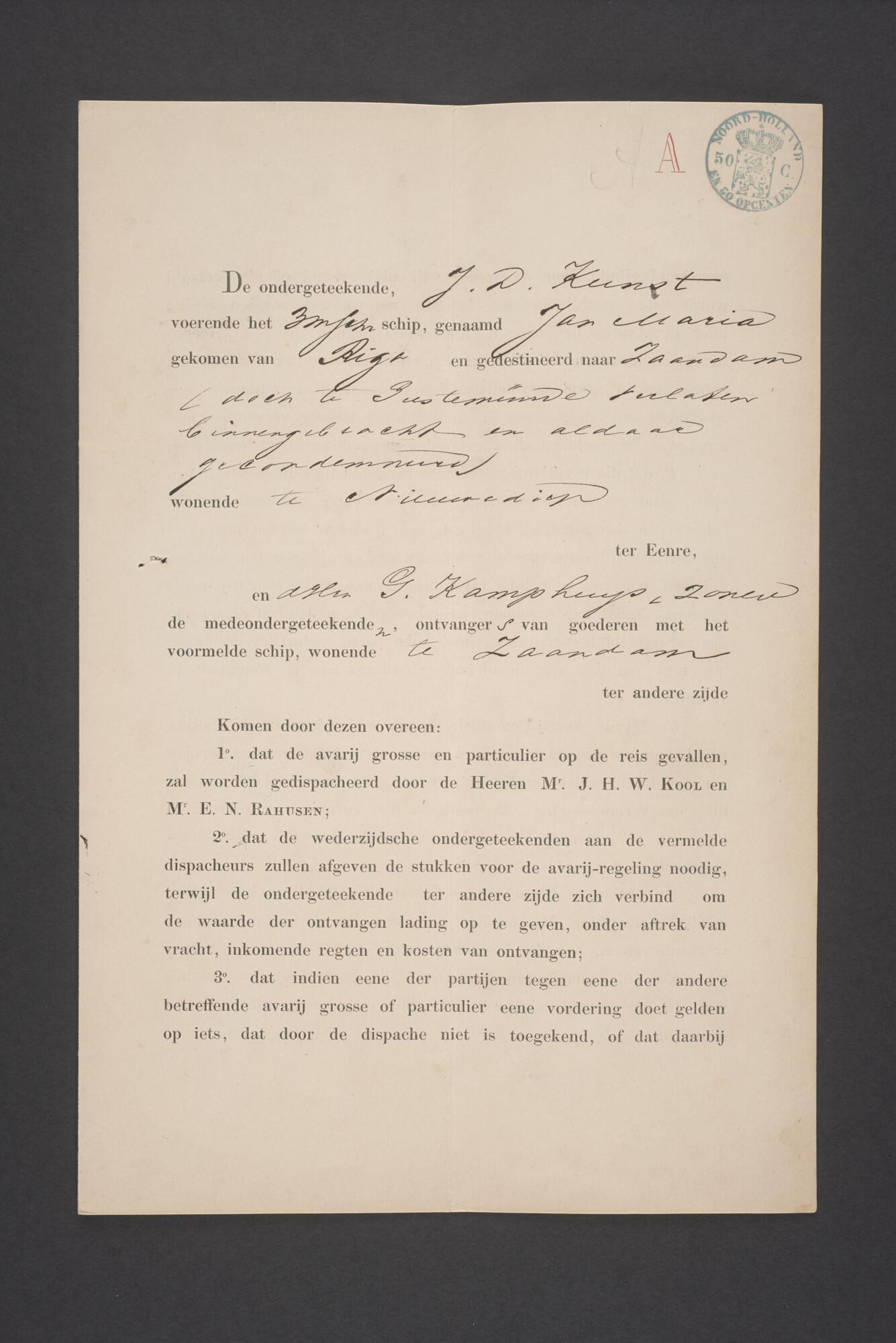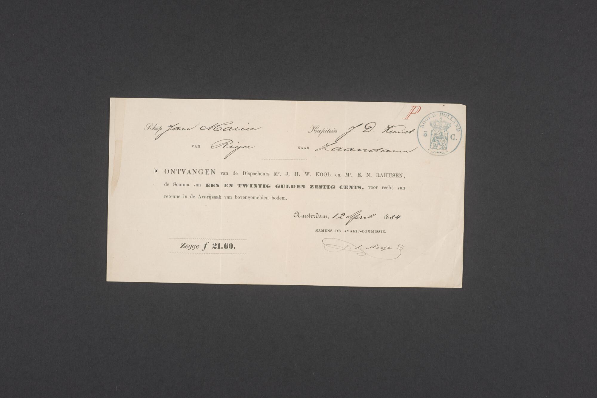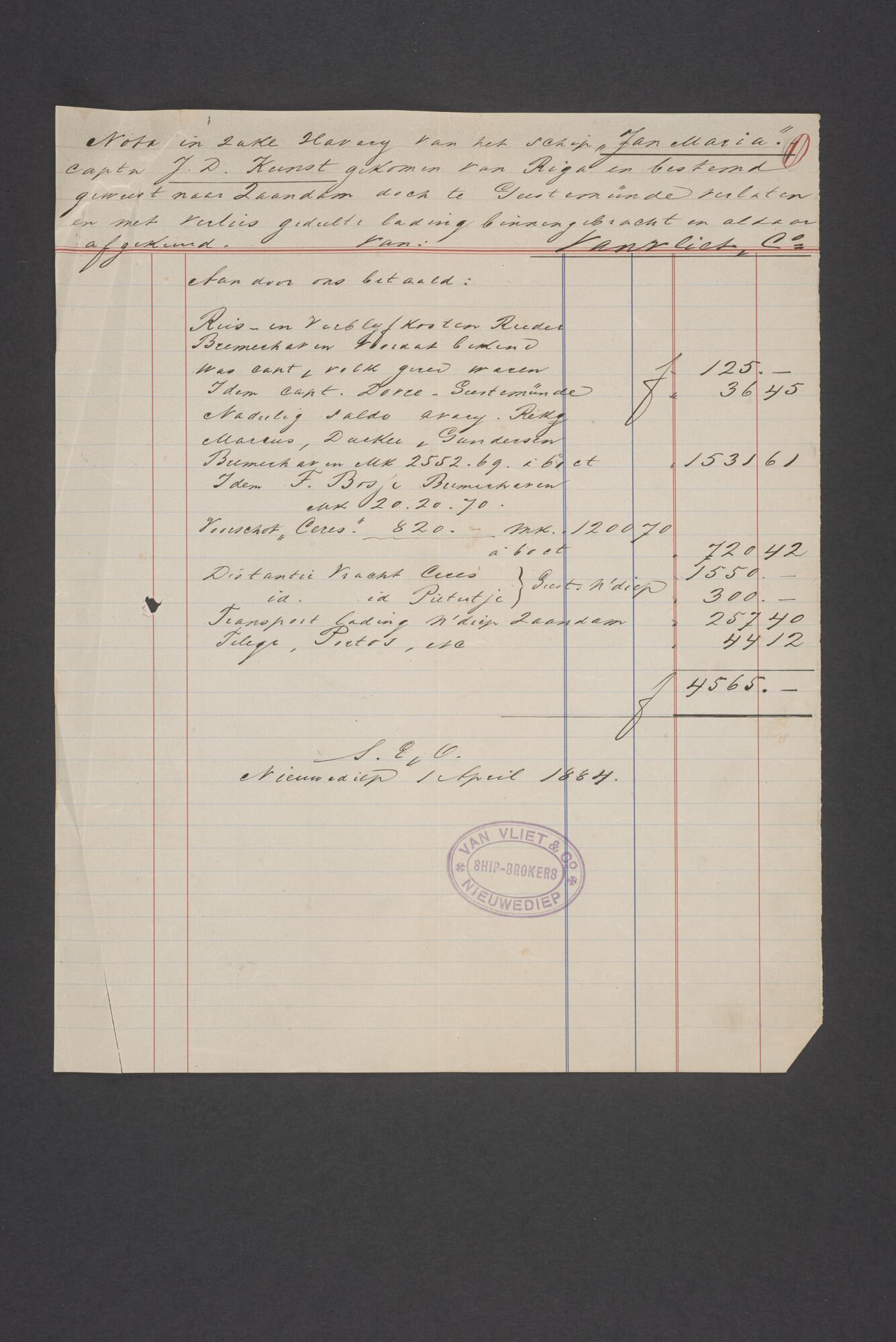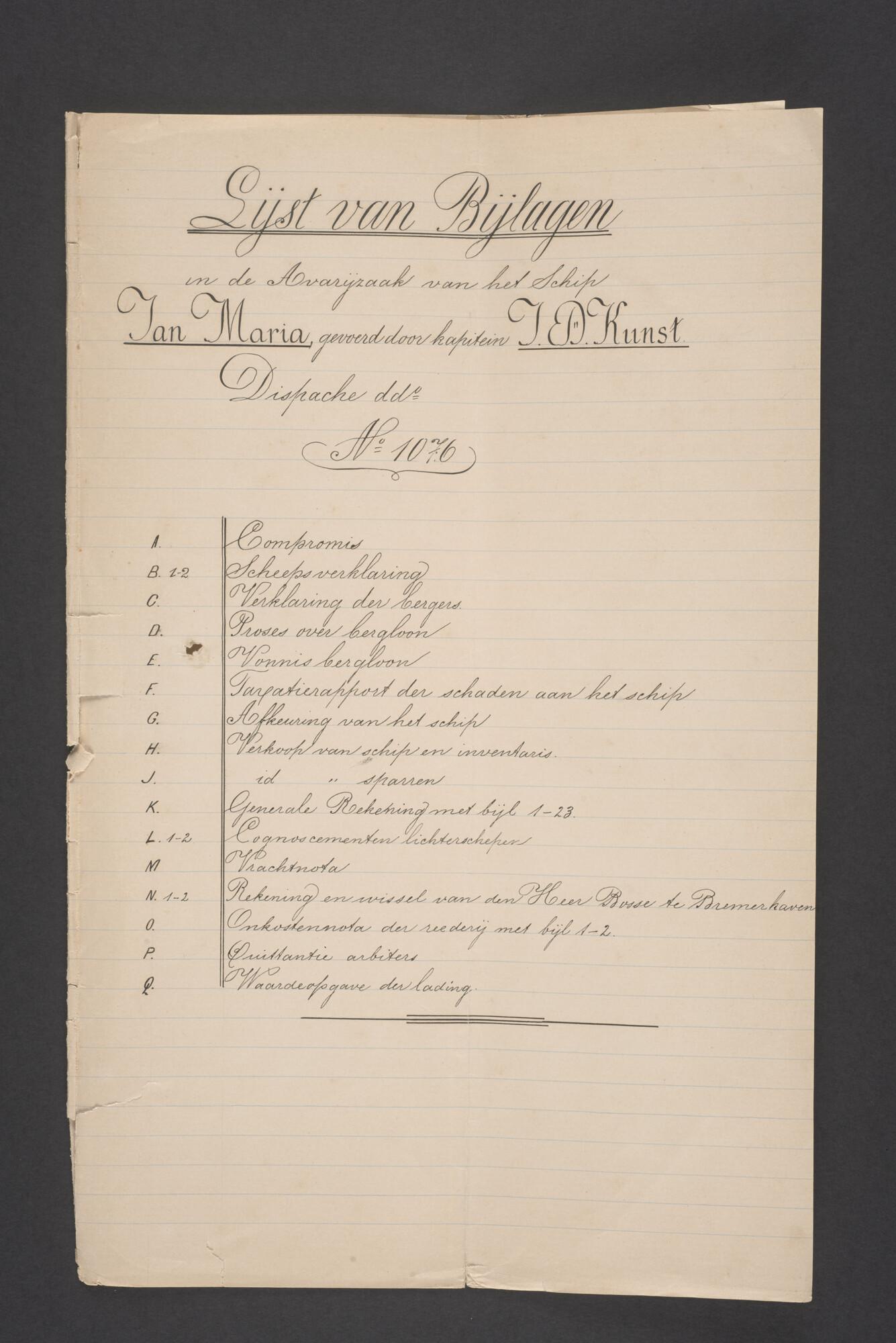 Bewijsstukken behorend bij het Reglement van Averijen over het vaststellen van de schade opgelopen aan het Nederlandse 3/m schoenerschip 'Jan Maria' gevoerd door Kapitein J. D. Kunst op de reis van Riga naar het Nieuwediep verlaten binnengebracht te Geestemünde.
