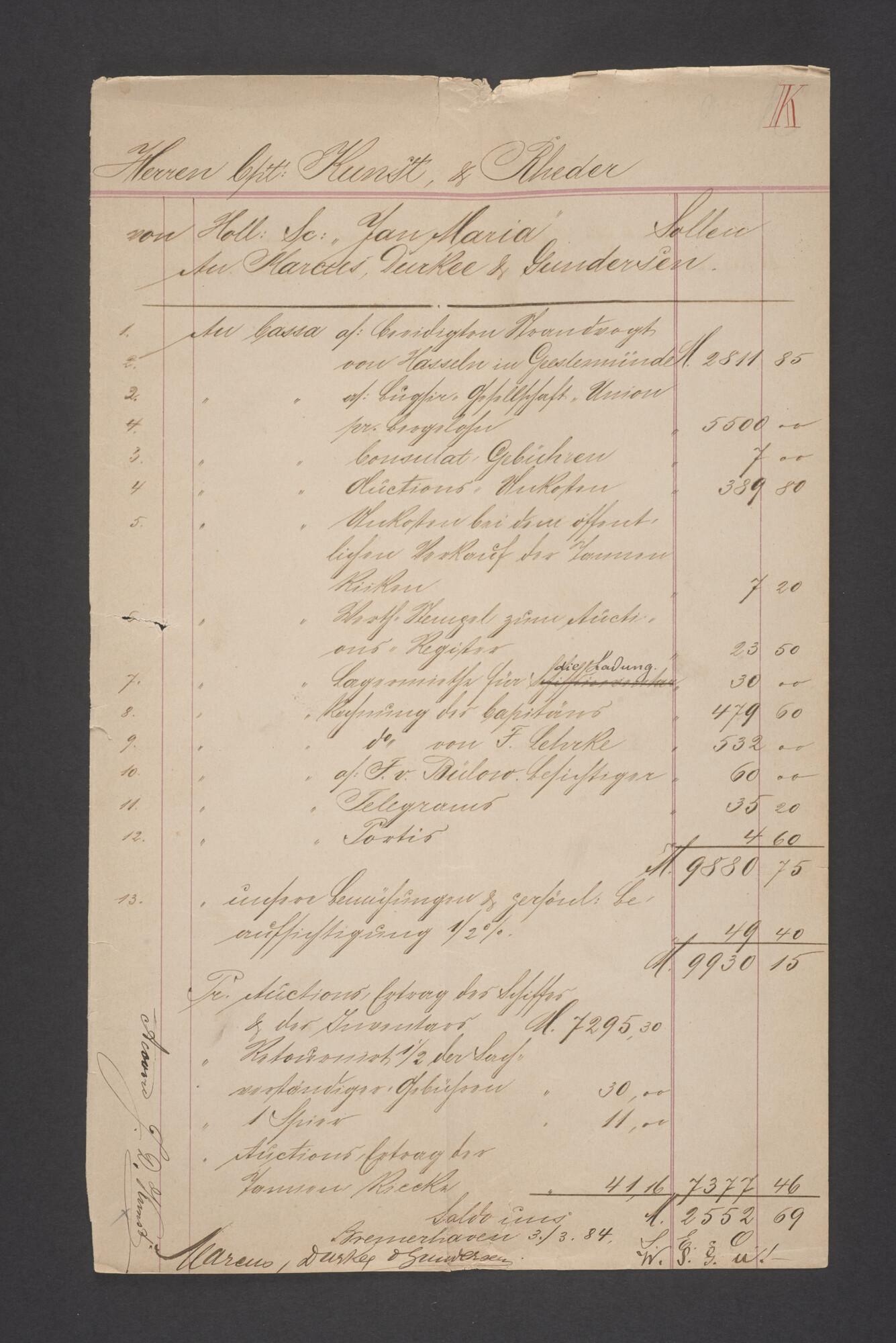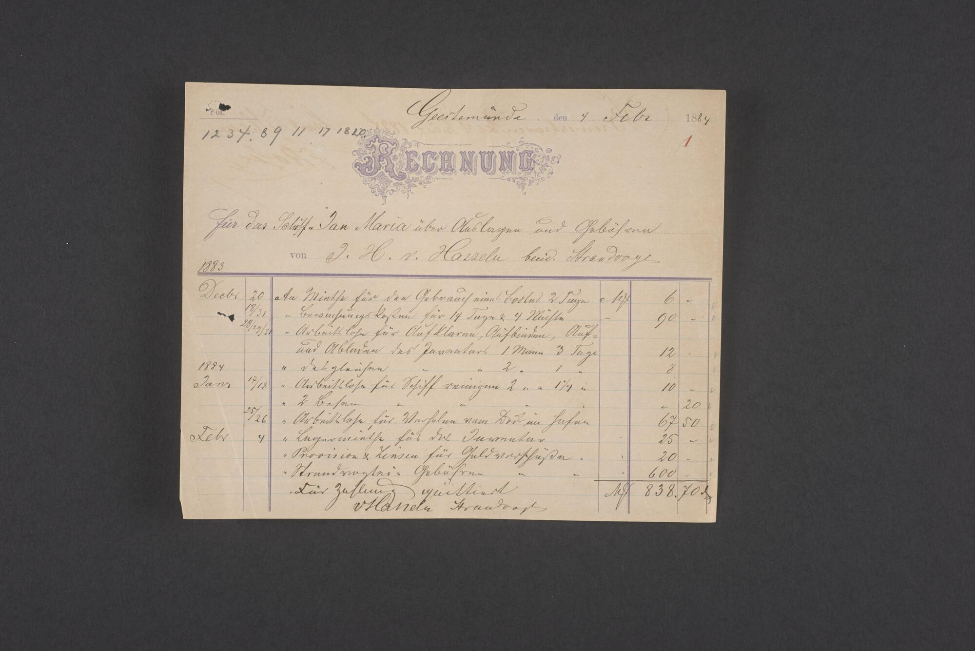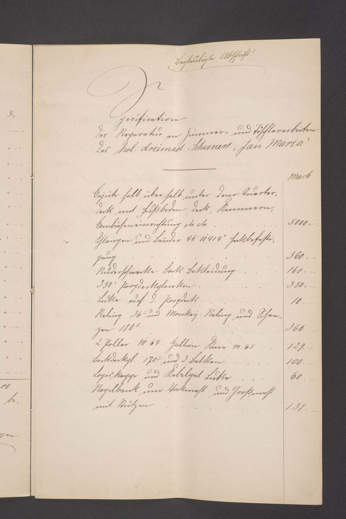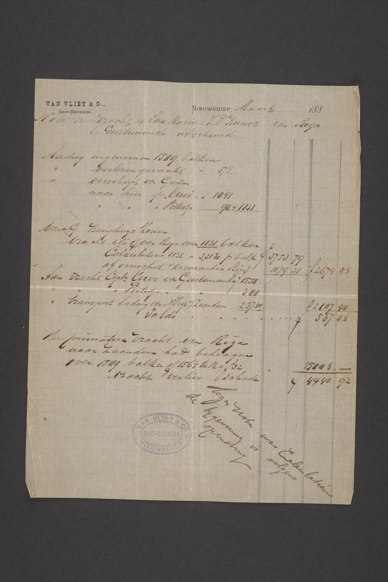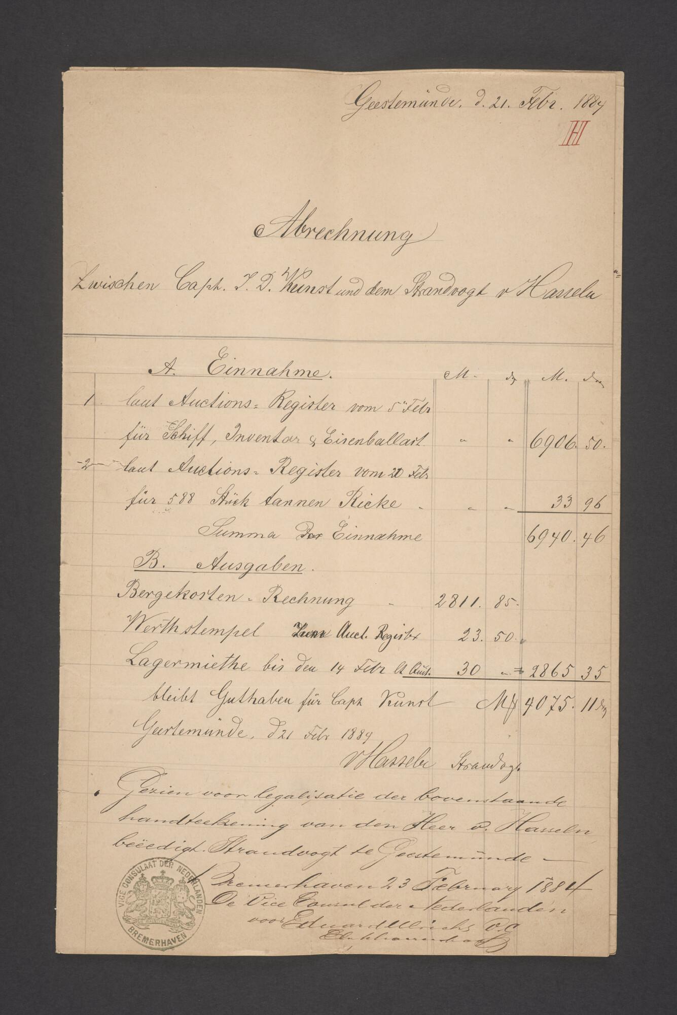 Bewijsstukken behorend bij het Reglement van Averijen over het vaststellen van de schade opgelopen aan het Nederlandse 3/m schoenerschip 'Jan Maria' gevoerd door Kapitein J. D. Kunst op de reis van Riga naar het Nieuwediep verlaten binnengebracht te Geestemünde.