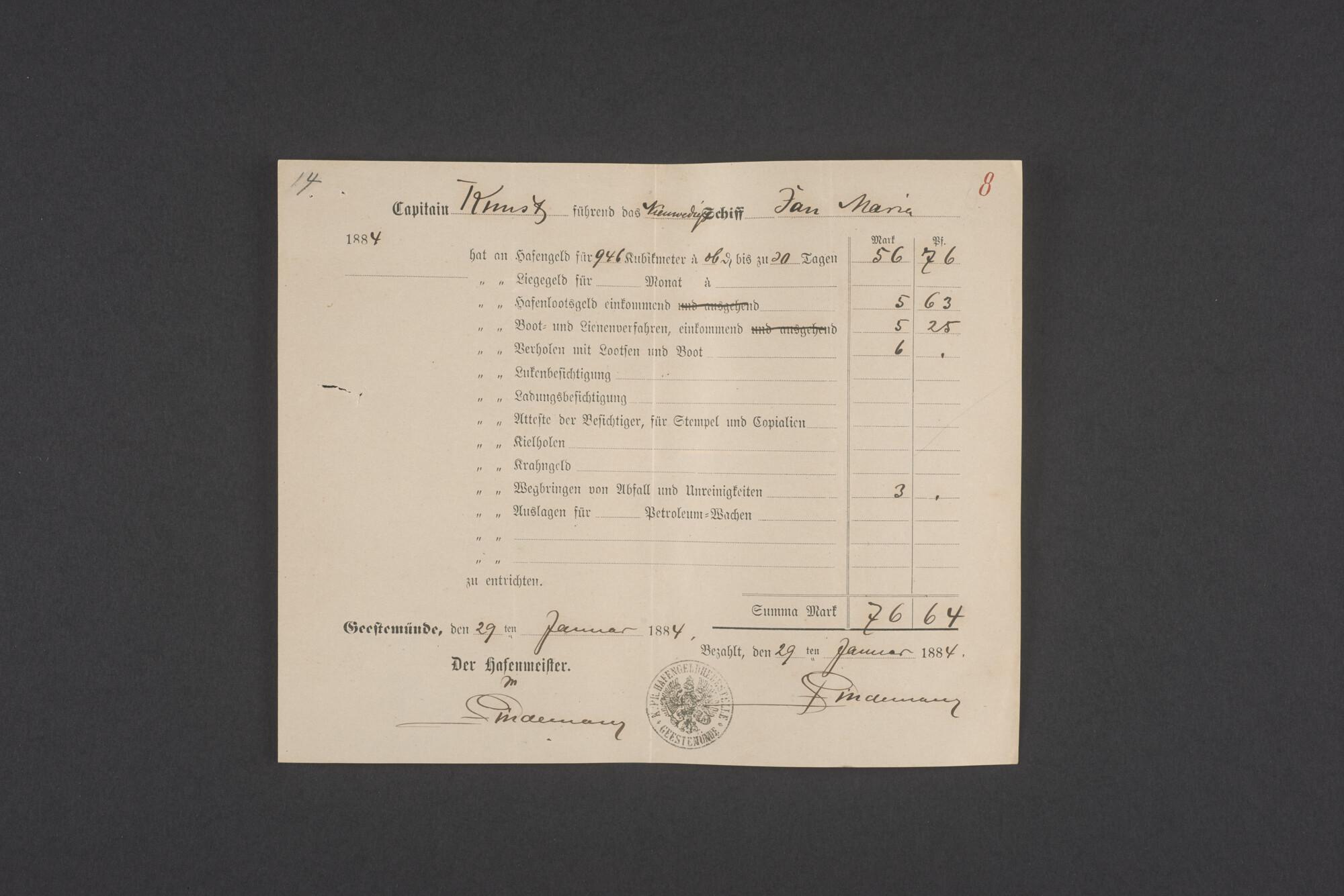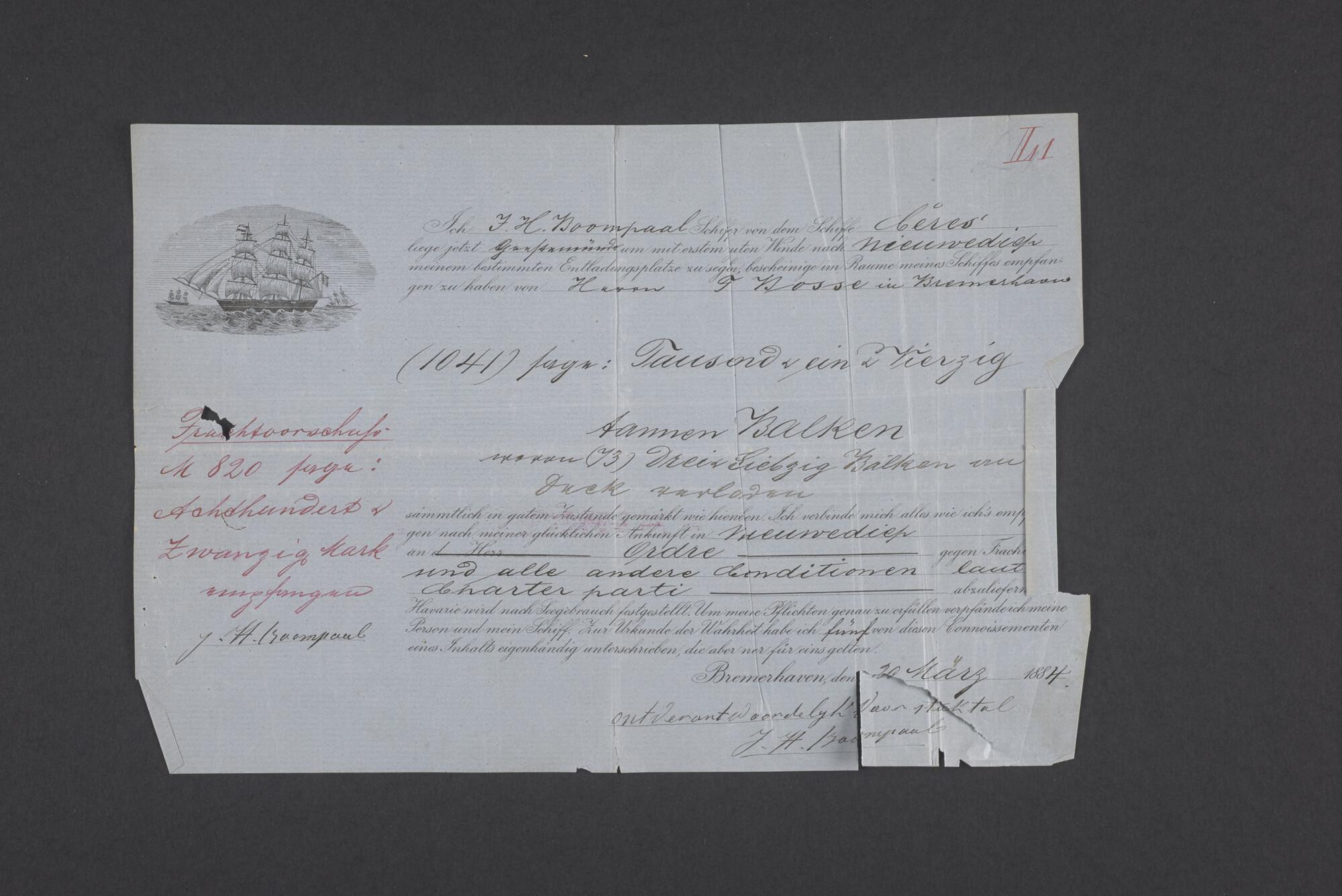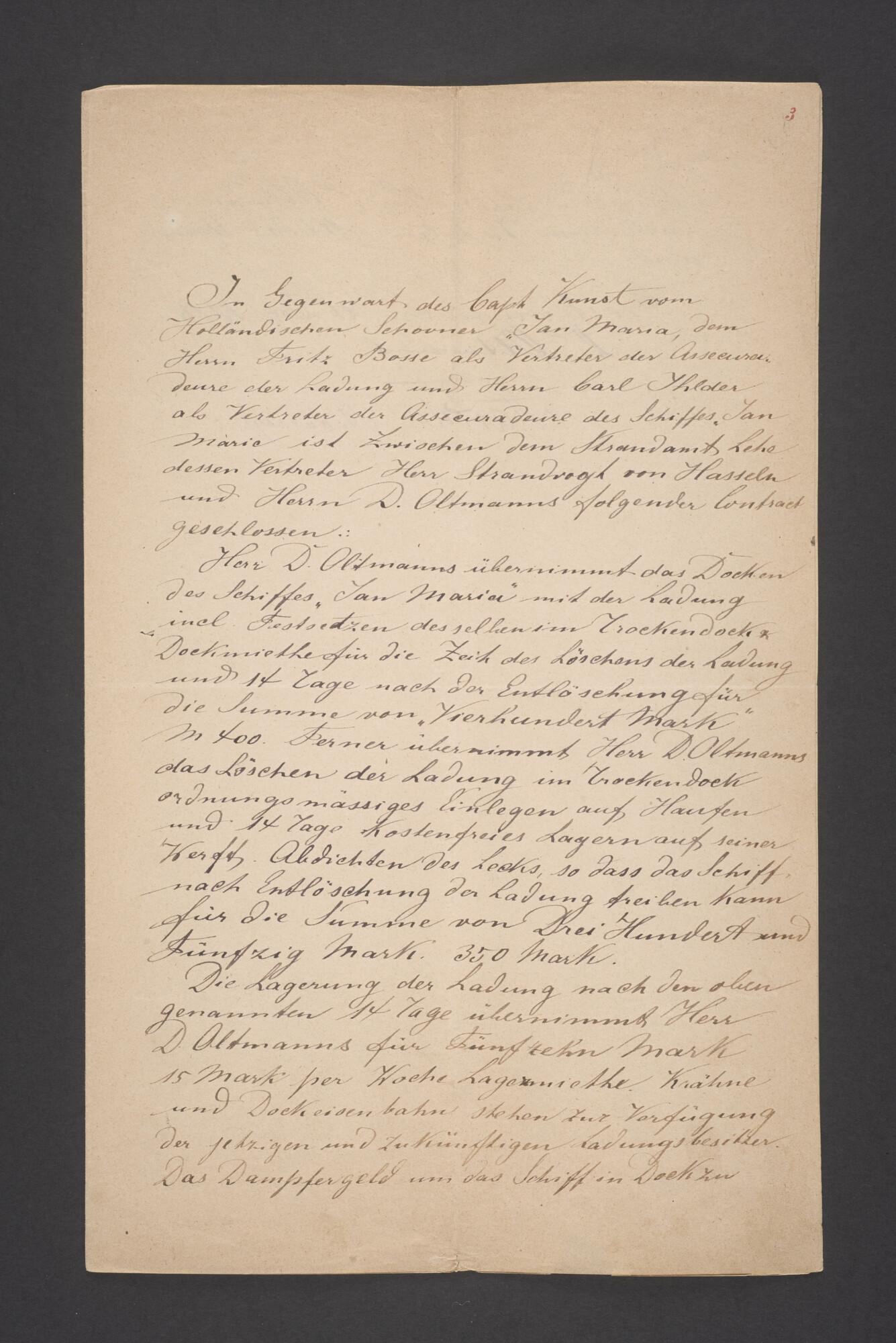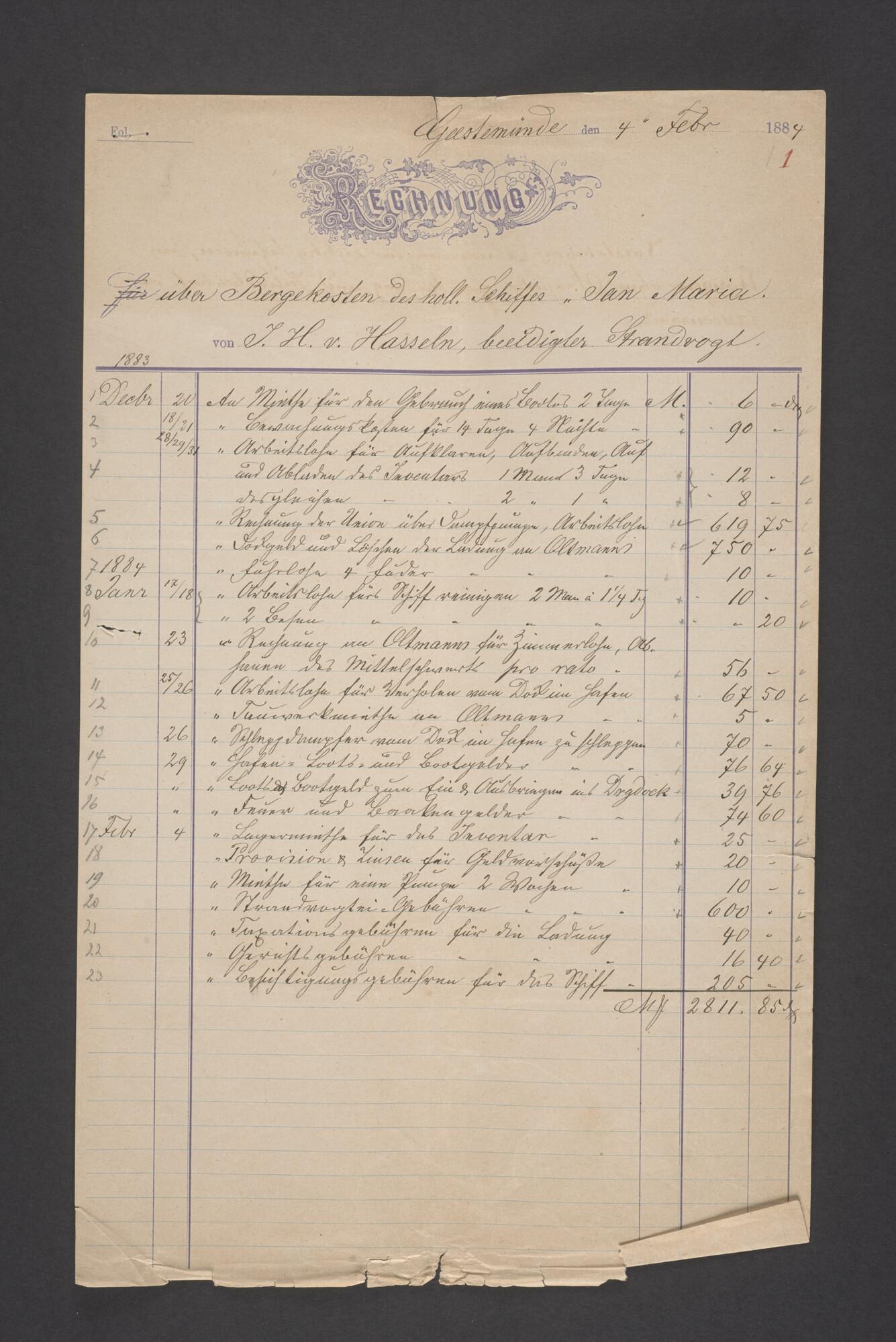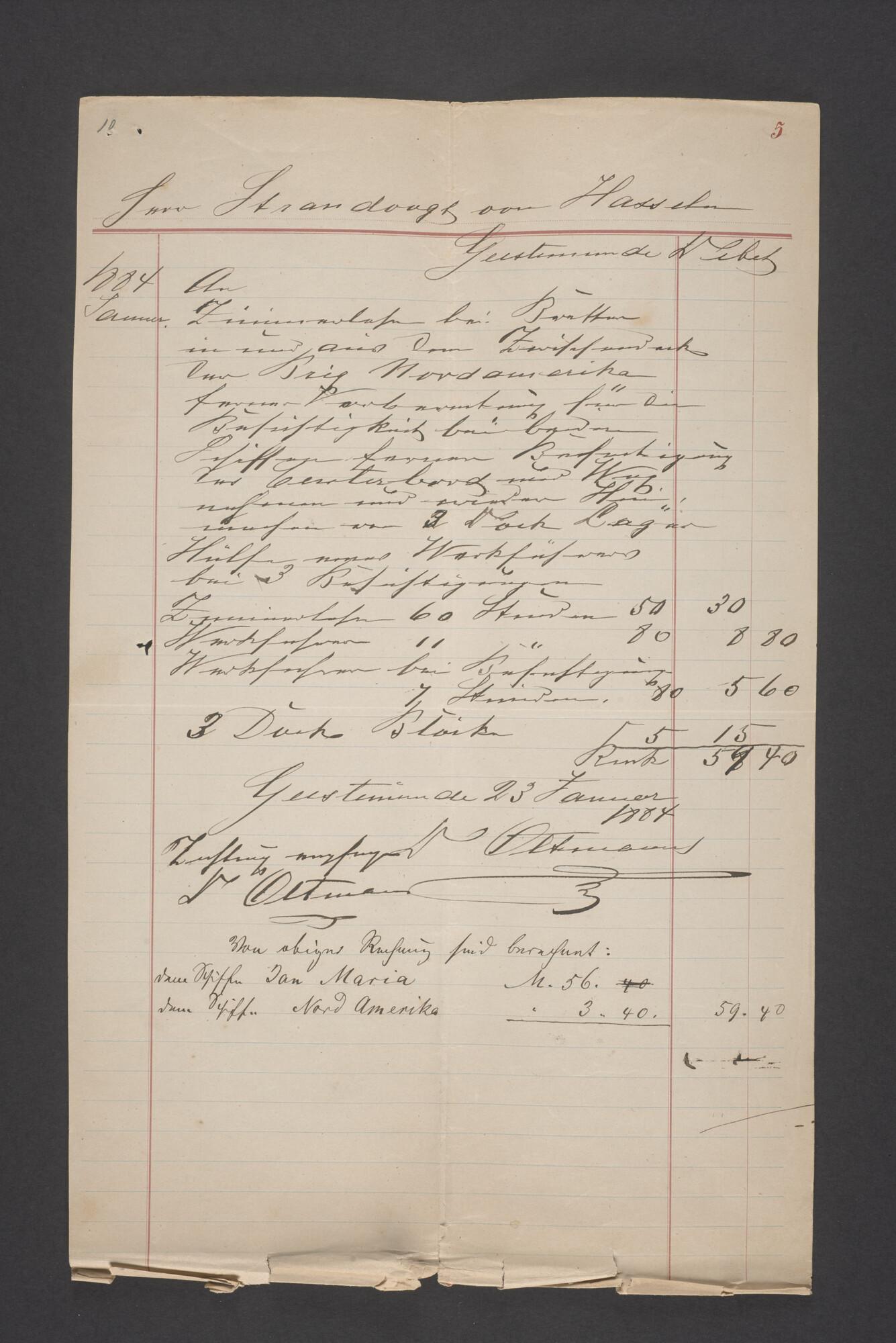 Bewijsstukken behorend bij het Reglement van Averijen over het vaststellen van de schade opgelopen aan het Nederlandse 3/m schoenerschip 'Jan Maria' gevoerd door Kapitein J. D. Kunst op de reis van Riga naar het Nieuwediep verlaten binnengebracht te Geestemünde.