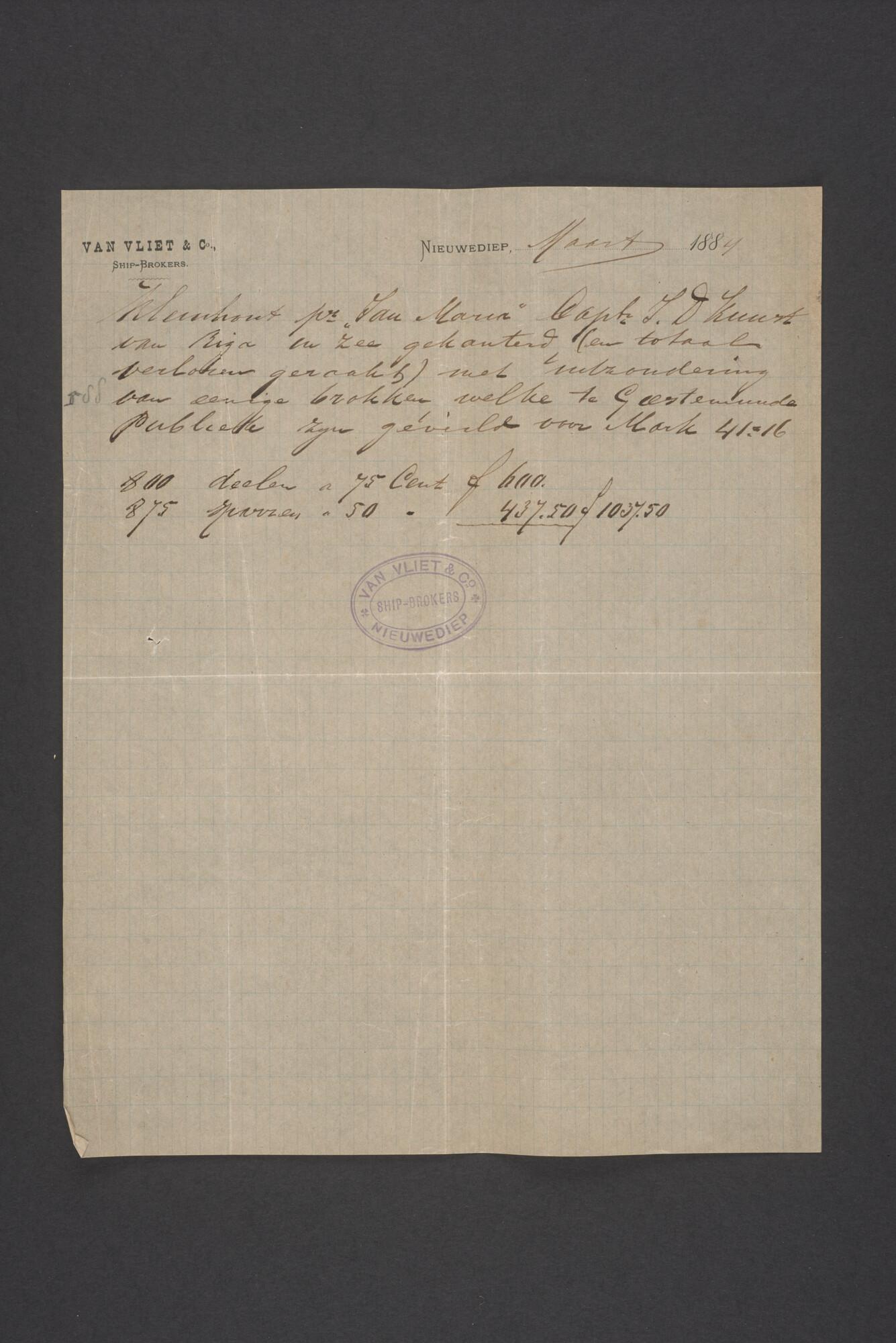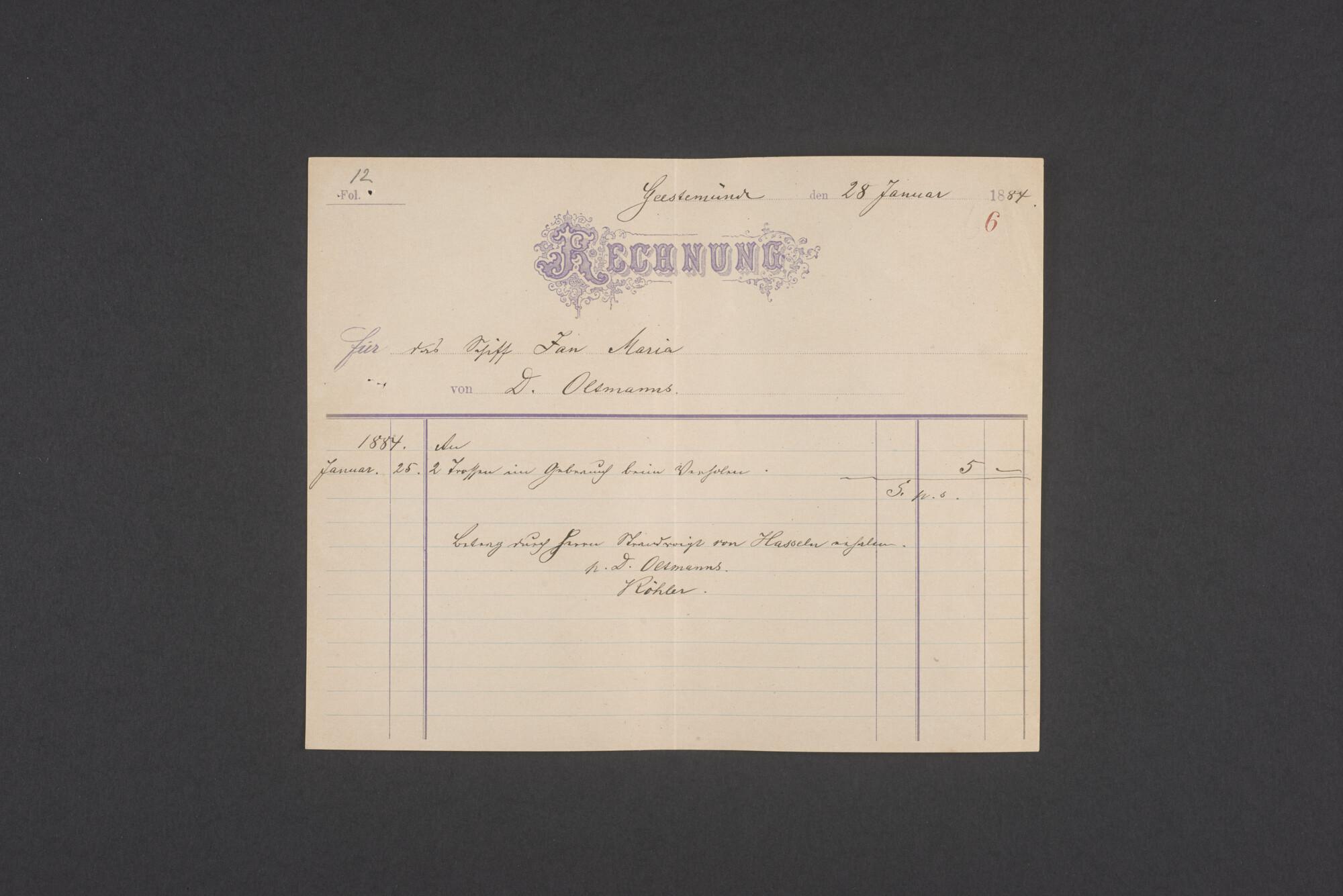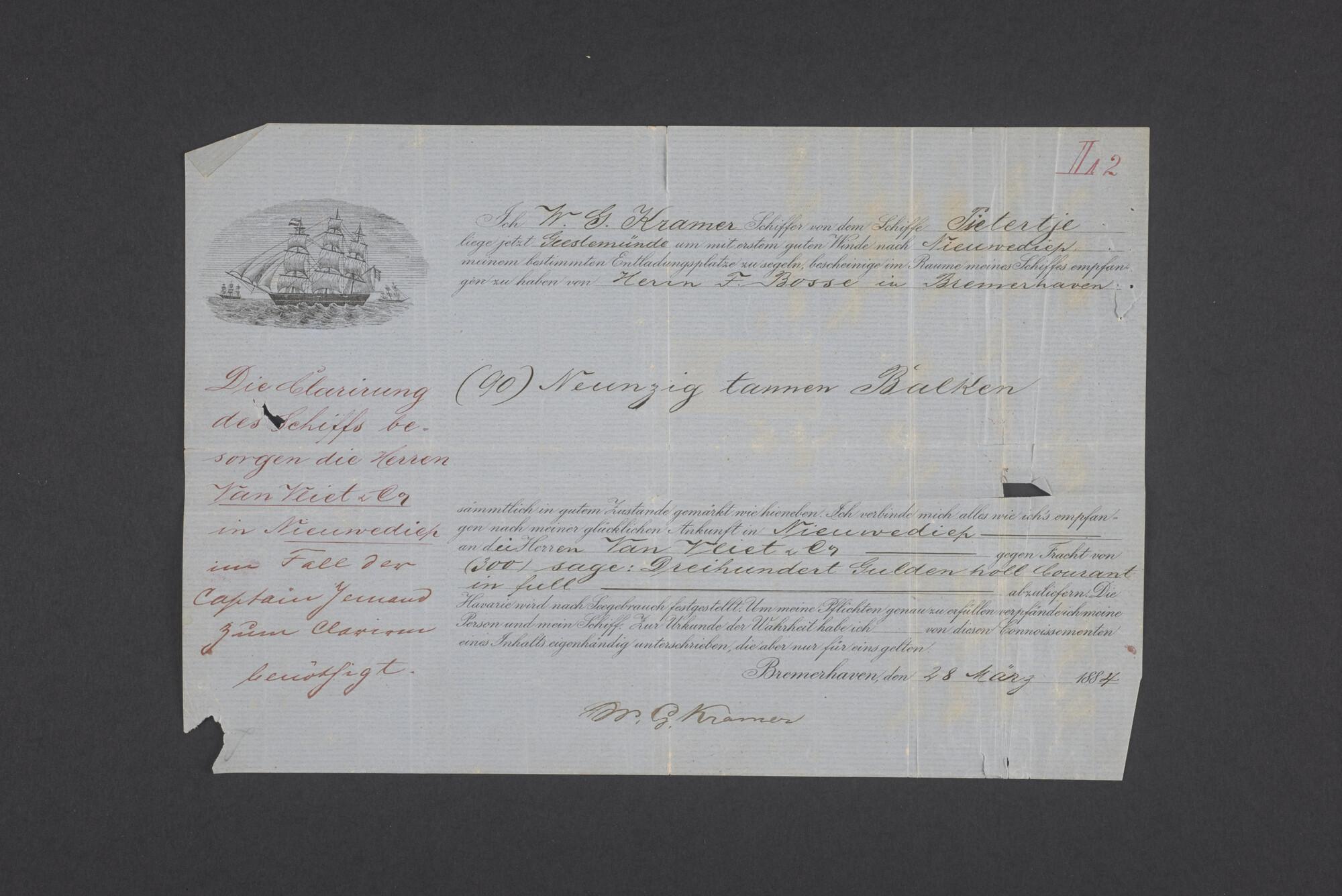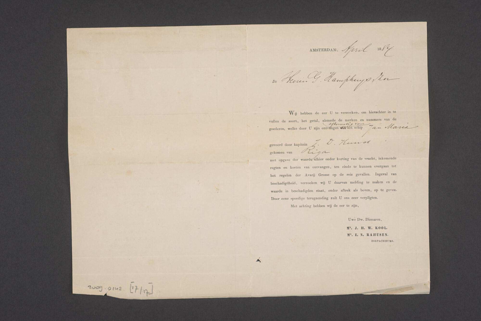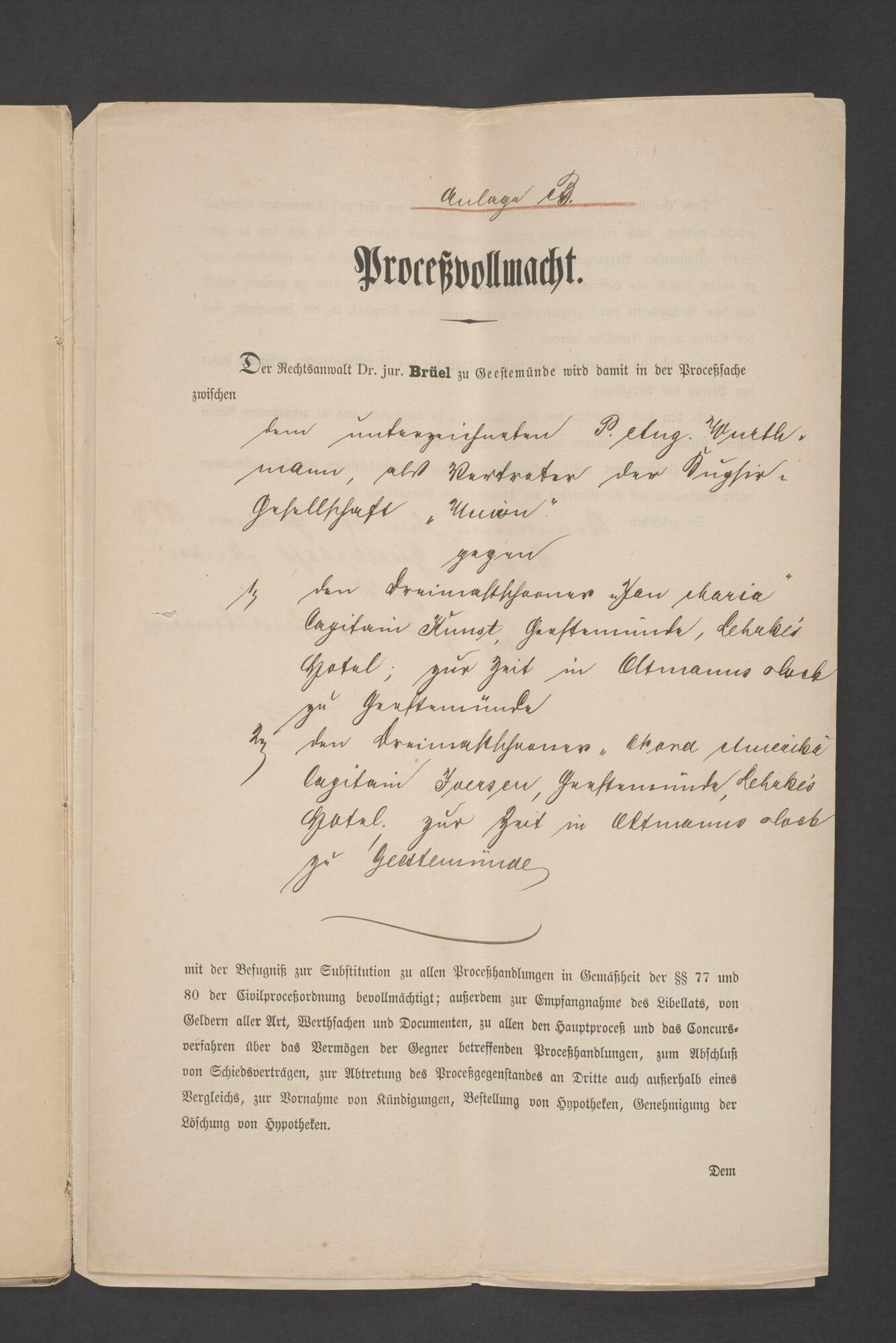 Bewijsstukken behorend bij het Reglement van Averijen over het vaststellen van de schade opgelopen aan het Nederlandse 3/m schoenerschip 'Jan Maria' gevoerd door Kapitein J. D. Kunst op de reis van Riga naar het Nieuwediep verlaten binnengebracht te Geestemünde.