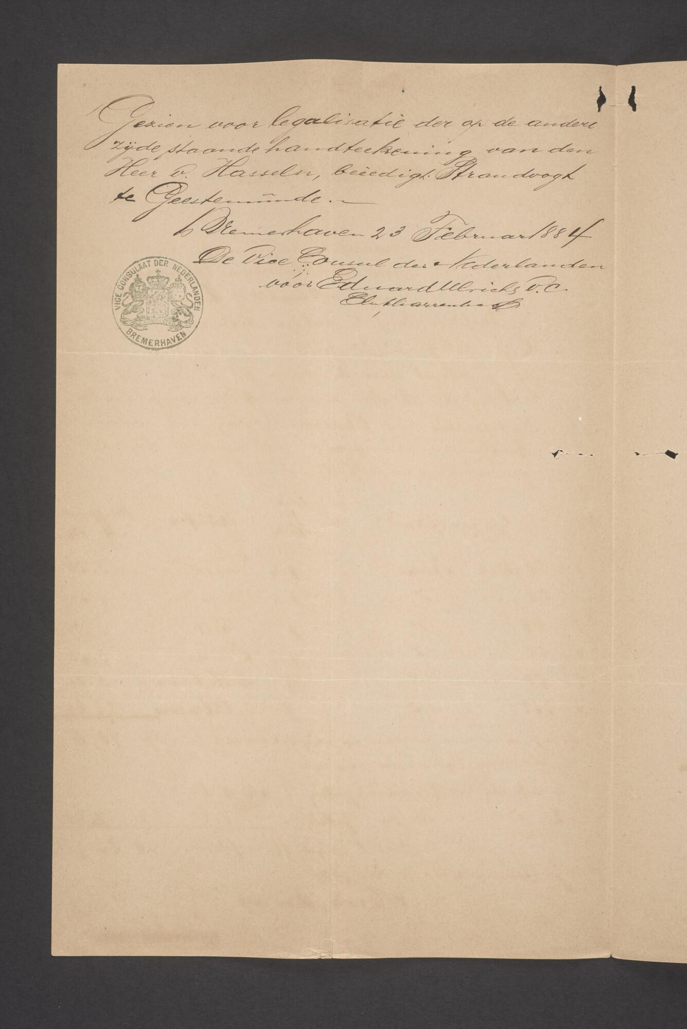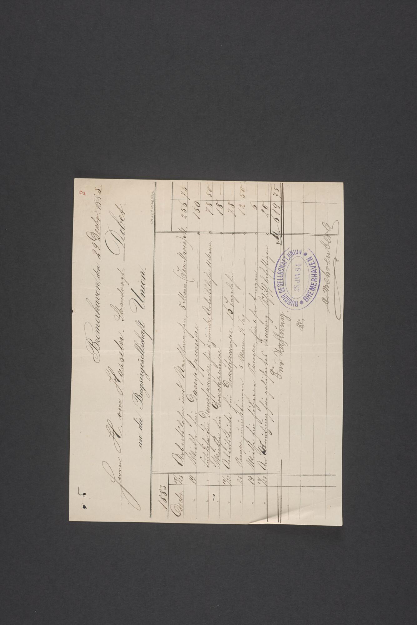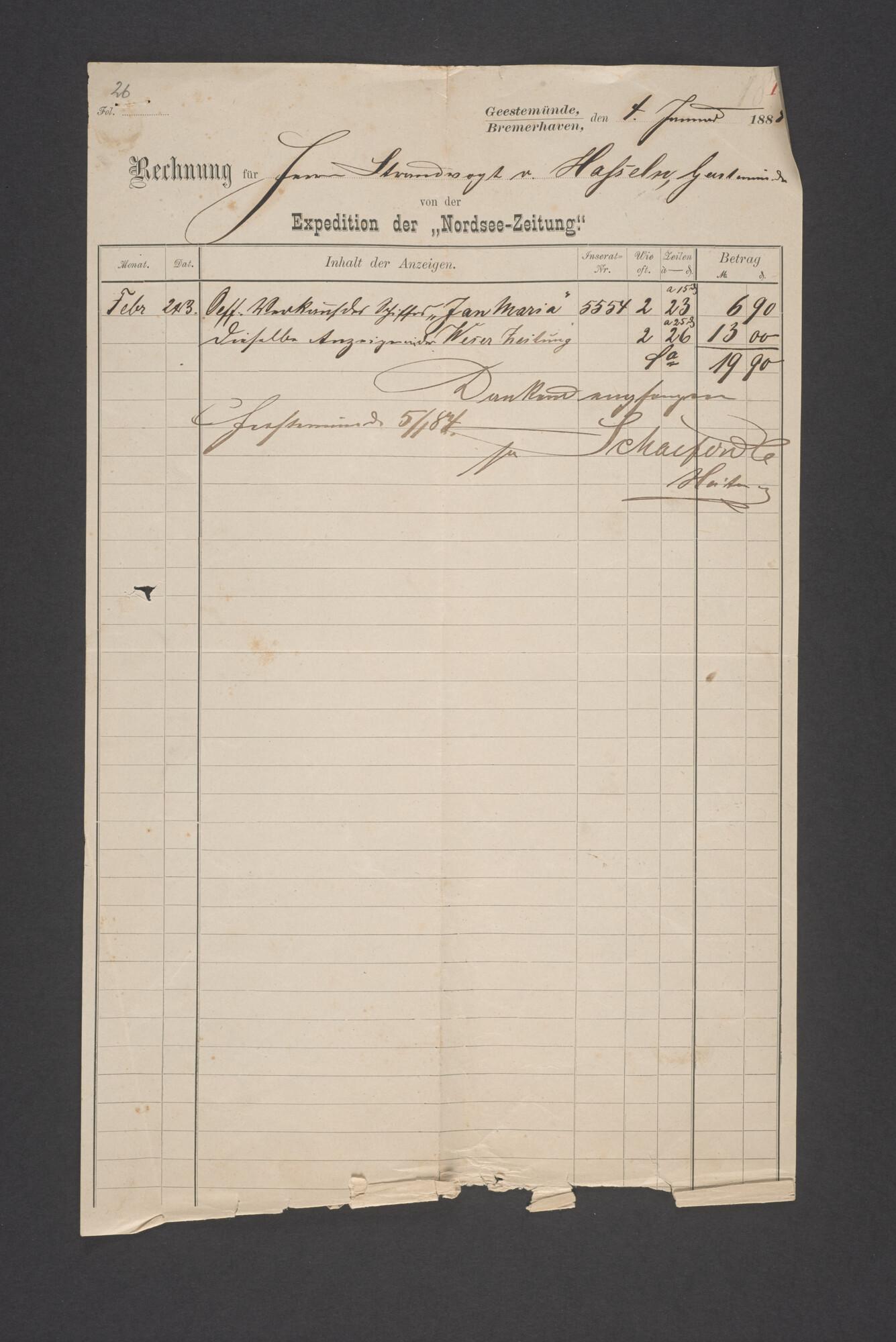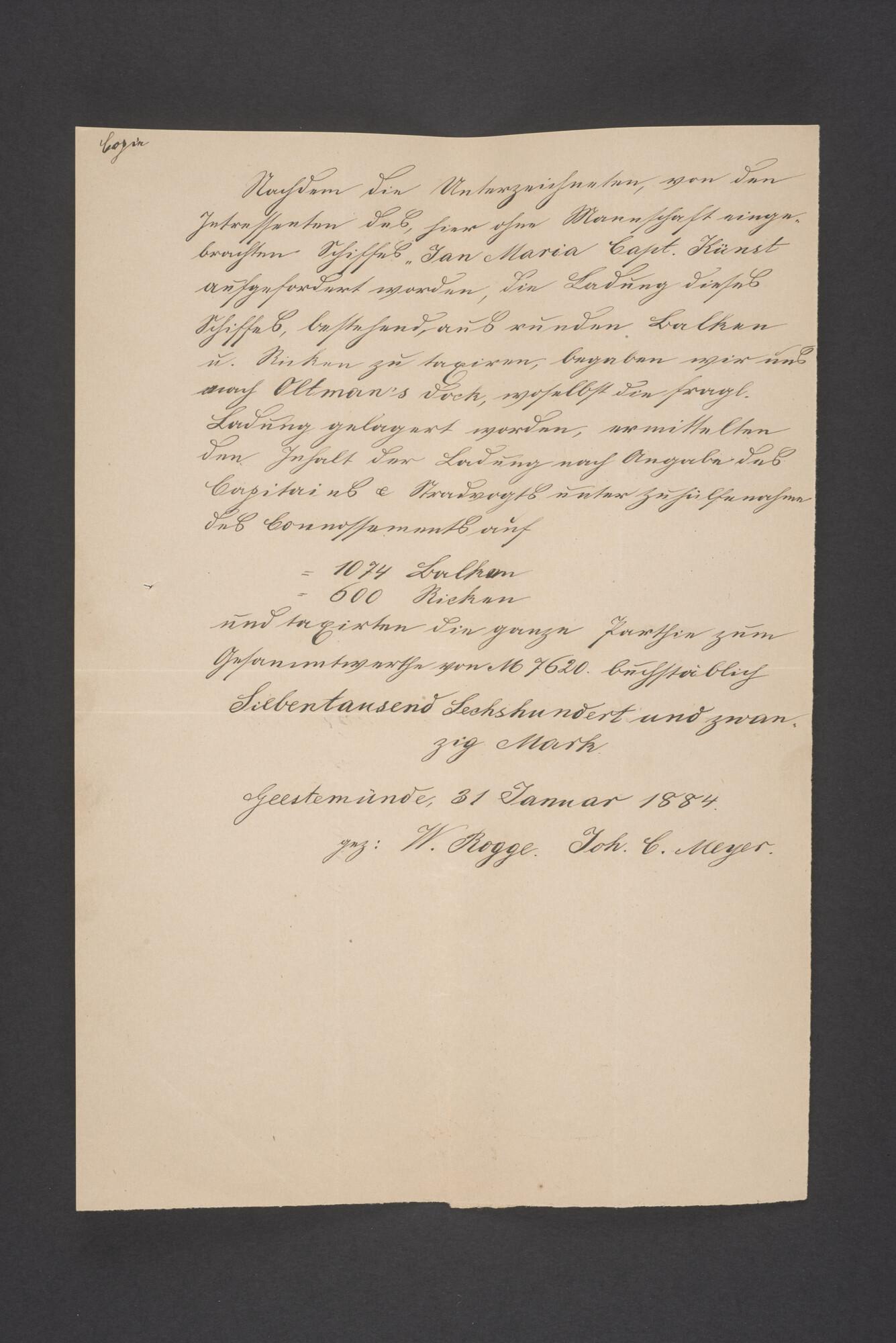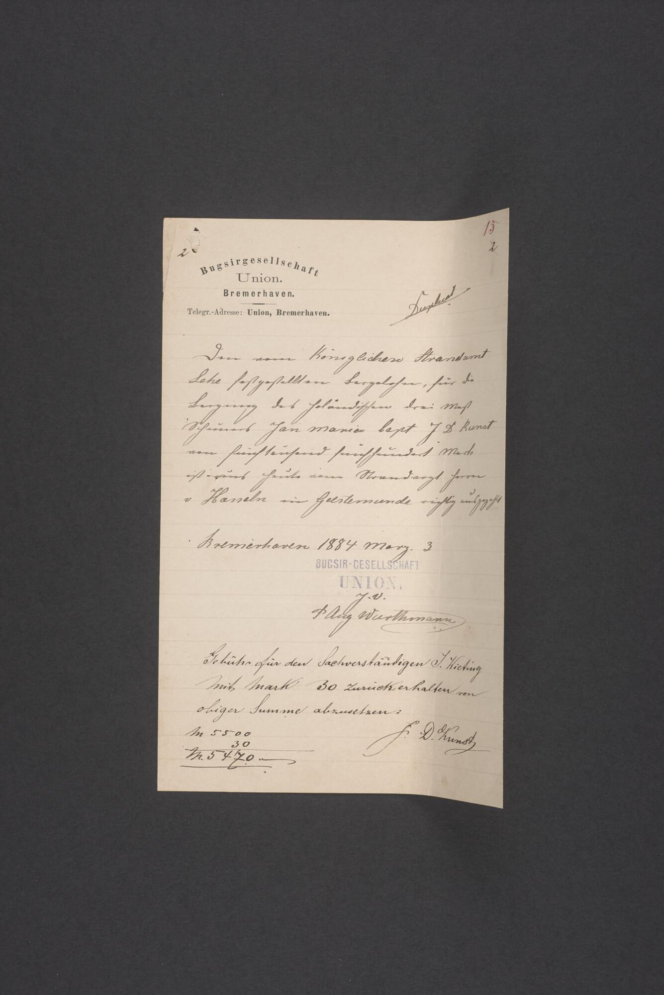 Bewijsstukken behorend bij het Reglement van Averijen over het vaststellen van de schade opgelopen aan het Nederlandse 3/m schoenerschip 'Jan Maria' gevoerd door Kapitein J. D. Kunst op de reis van Riga naar het Nieuwediep verlaten binnengebracht te Geestemünde.