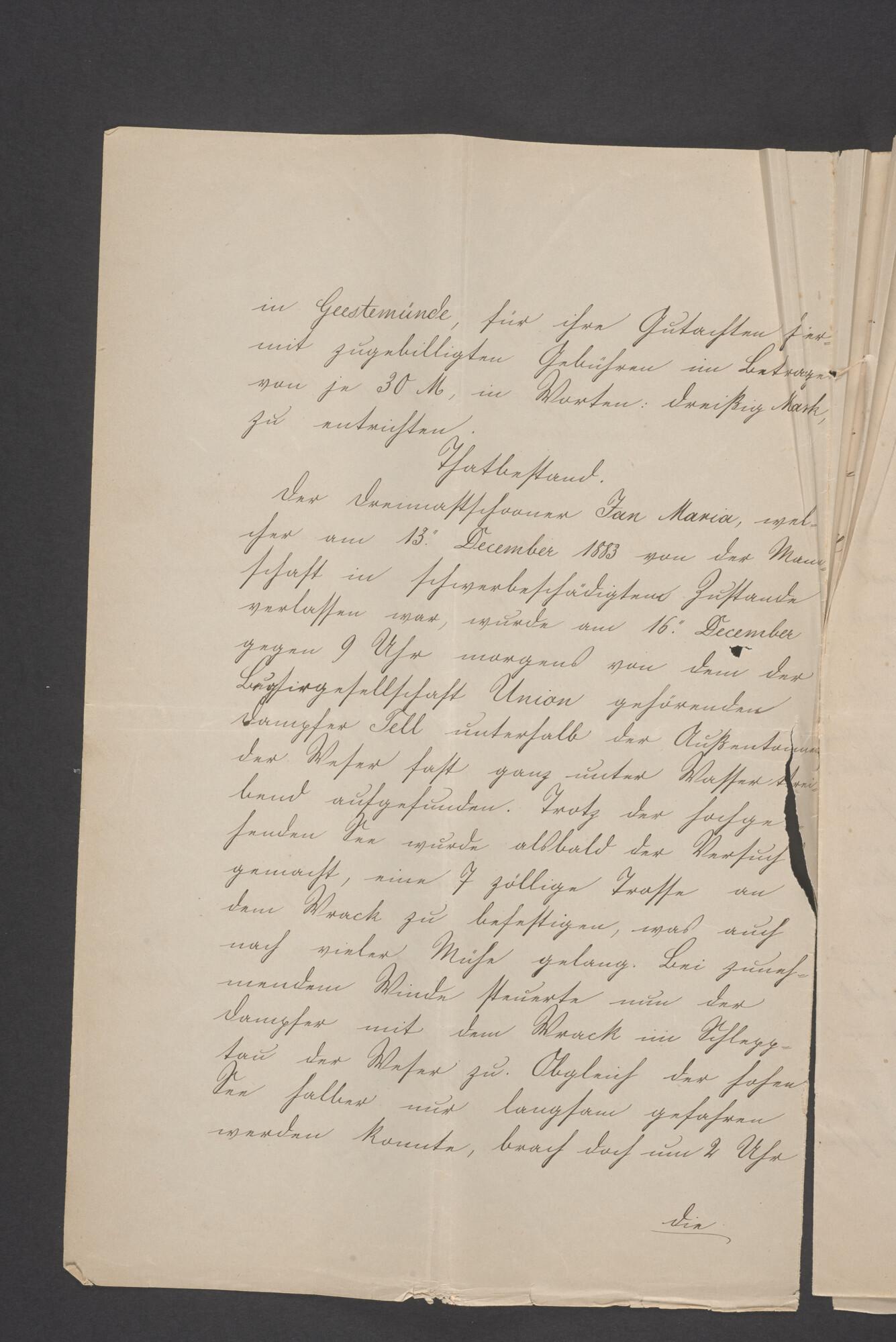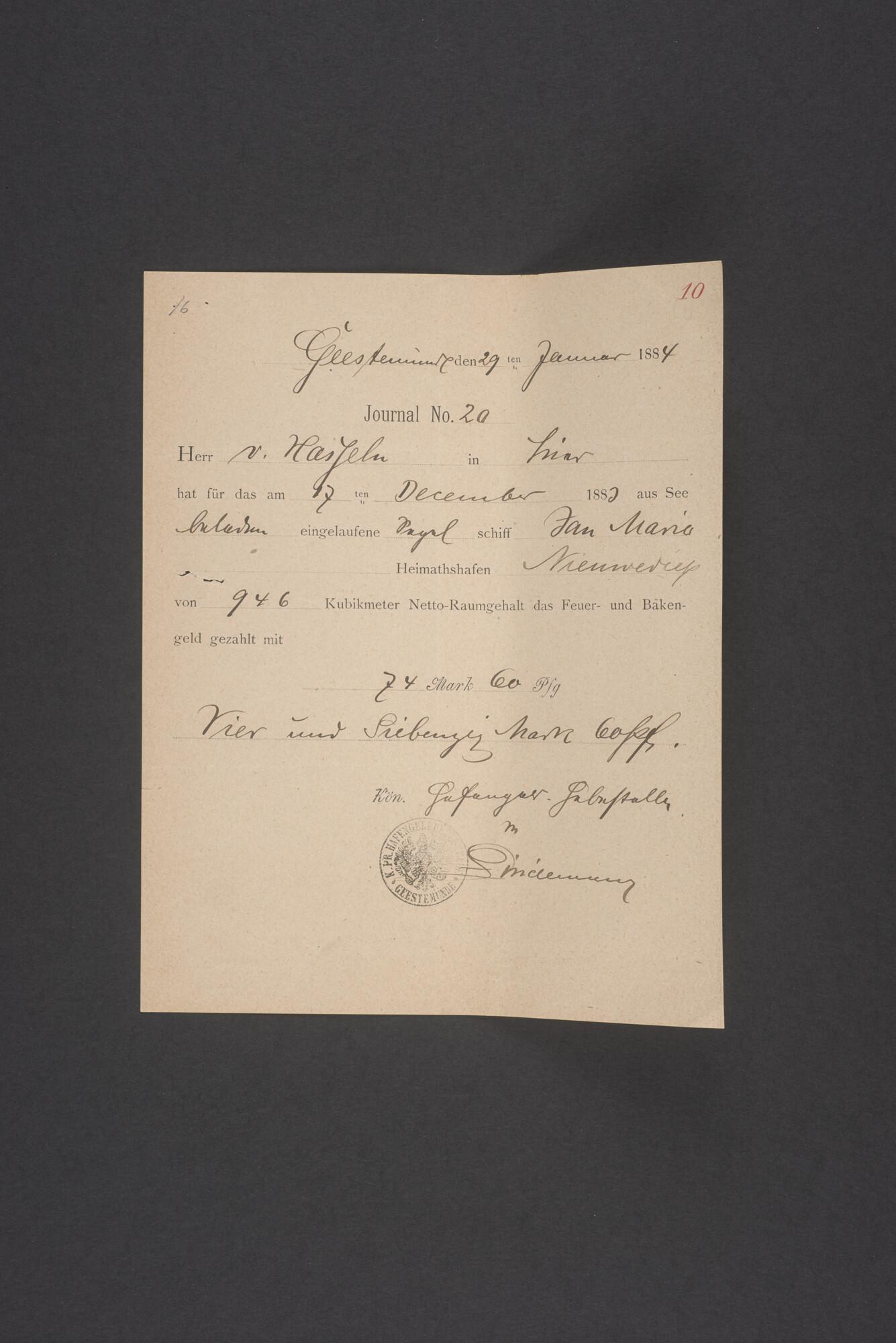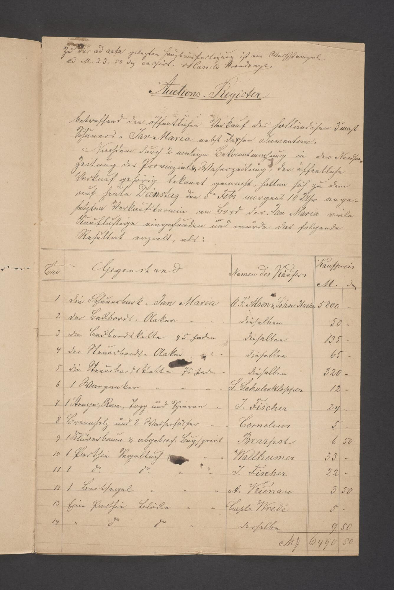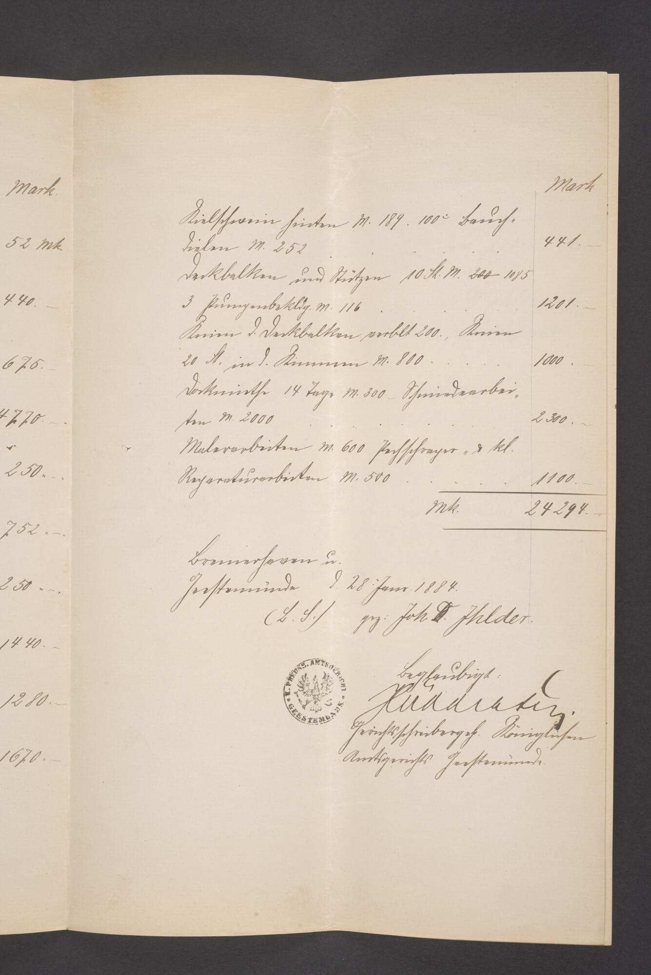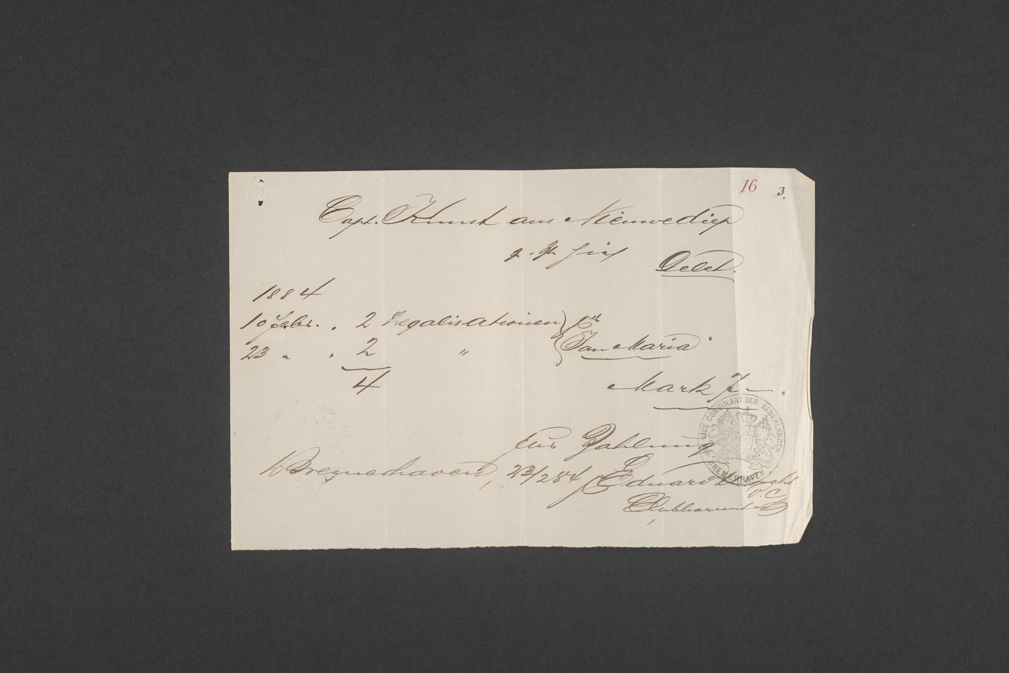 Bewijsstukken behorend bij het Reglement van Averijen over het vaststellen van de schade opgelopen aan het Nederlandse 3/m schoenerschip 'Jan Maria' gevoerd door Kapitein J. D. Kunst op de reis van Riga naar het Nieuwediep verlaten binnengebracht te Geestemünde.