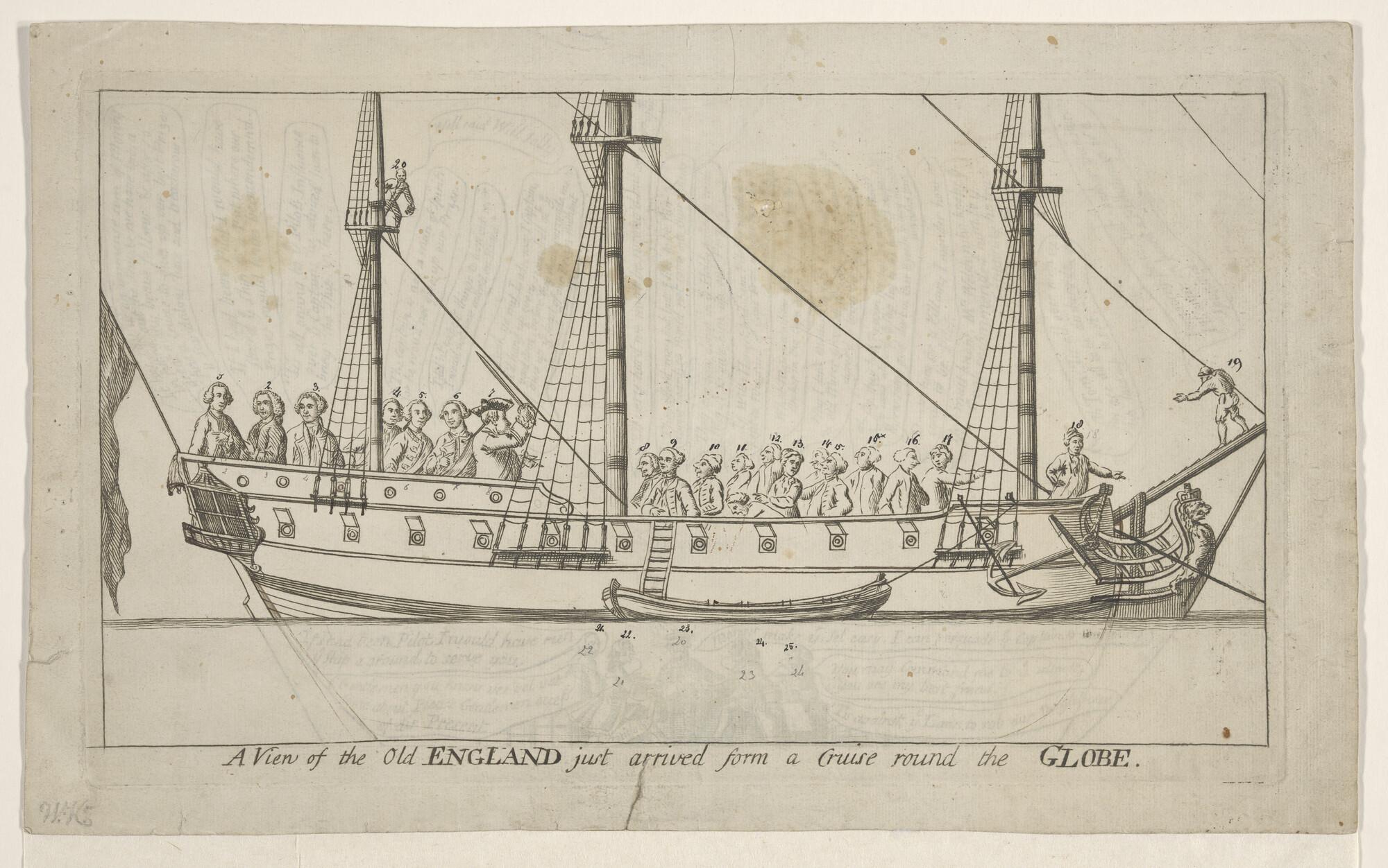 Spotprent "A view of the Old England just arrived from a Cruise around the Globe".