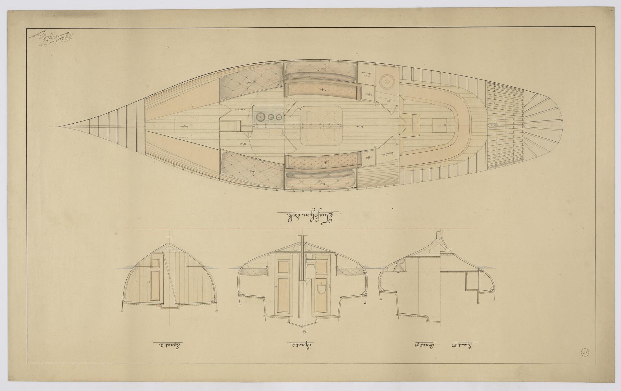 Horizontale langsdoorsnede en drie dwarsdoorsneden van een midzwaard zeiljacht met kajuit. Indeling van het tussendek met salon, hut en logies. Sofa's, kooien, kombuis, tafel en wc. Kajuitdak met bovenlichten. Afmetingen: lengte o.a. 14.70 m, lengte tussen de loodlijnen 10.40 m, breedte 3.80 m (schaal 1:20).