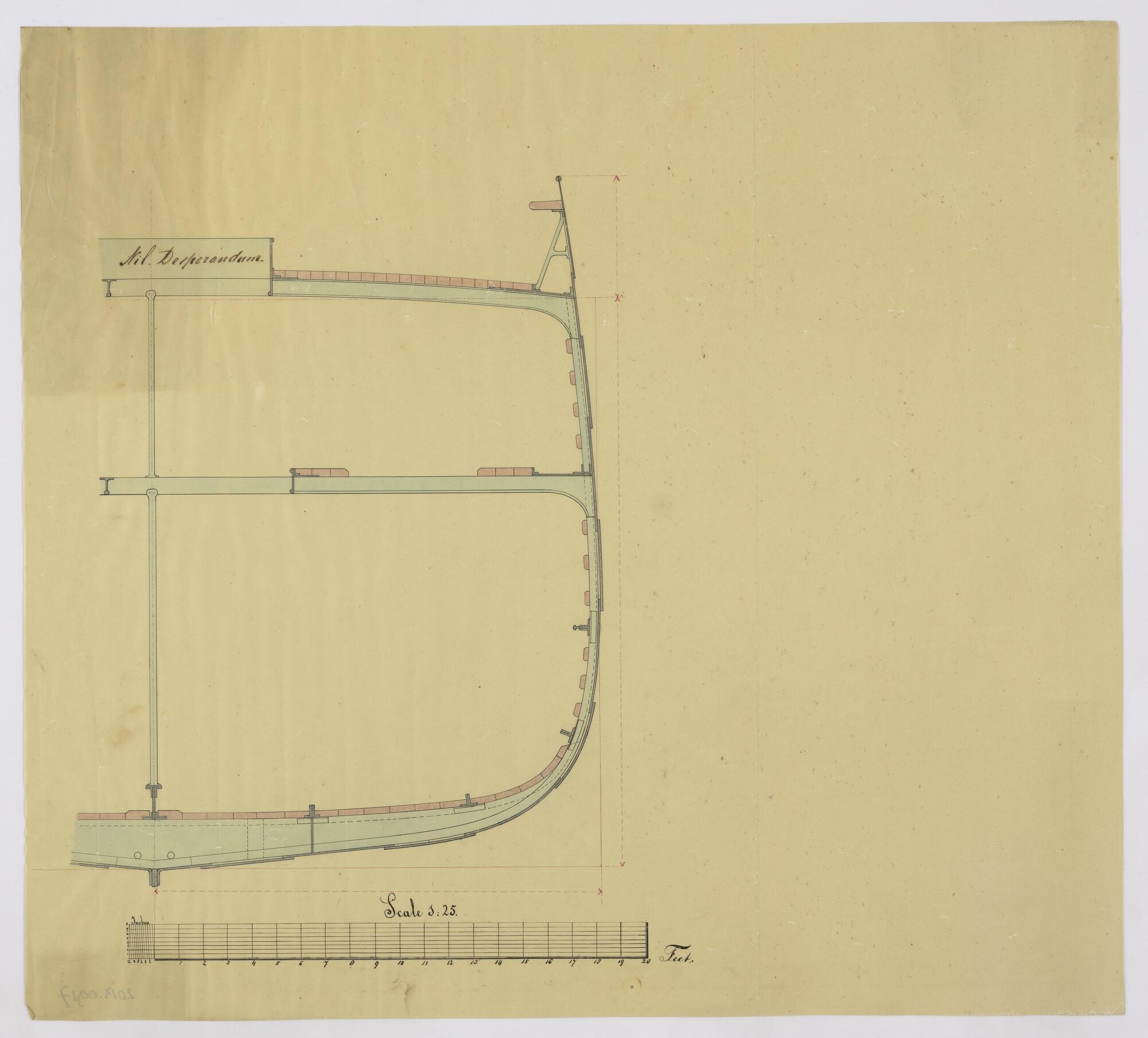 Doorsnede over het grootspant van het stalen barkschip Nil Desperandum (Wanhoop Nooit). Met hout belegd bovendek, -tussendek en -ruim. Afmetingen: lengte tussen de stevens 58.186 m, breedte 11 m, holte 7.25 m (schaal 1:25).