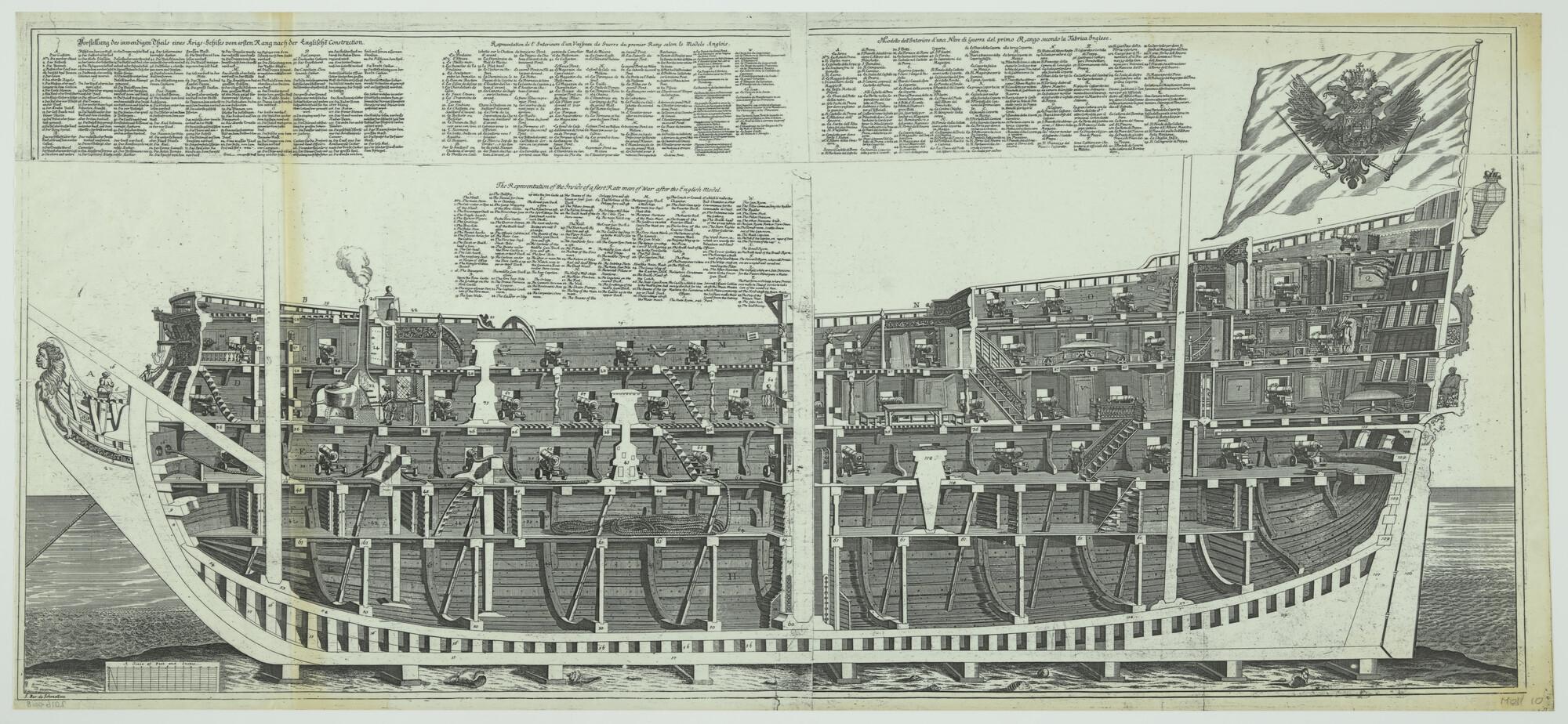 Opengewerkt zijaanzicht over bakboord met zeer veel details van een oorlogsschip naar Engels model. Het schip ligt droog terwijl de kiel op blokken rust, water op de achtergrond. Kampagnedek, halfdek, bakdek, opperdek, bovendek, kuildek, koebrug en ruim. Kanons op rolpaarden en achter geschutspoorten op het bovenste, middelste en onderste geschutsdek alsmede op het halfdek en ...