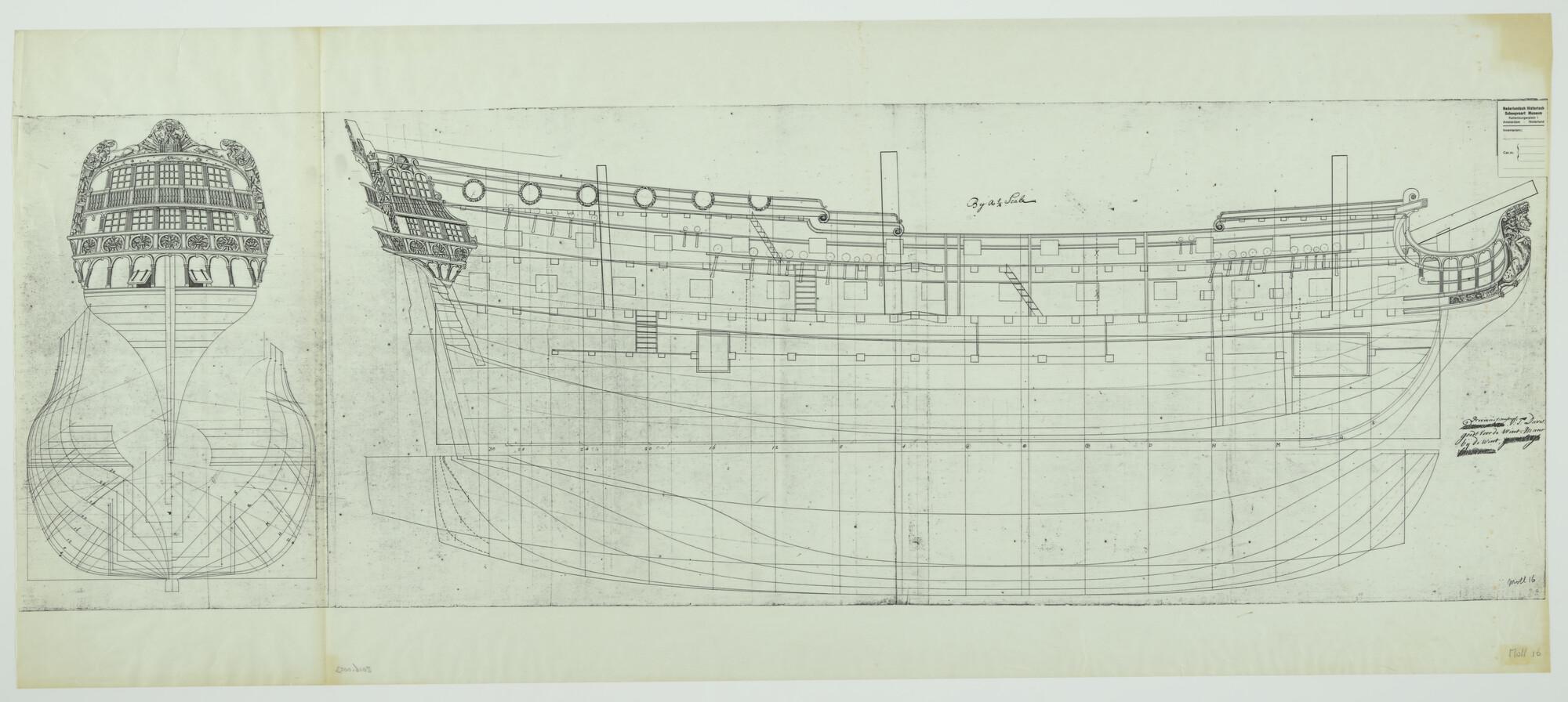 Lijnenplan, spantenraam, aanzicht op de spiegel en zijaanzicht over stuurboord van 's Lands schip van oorlog De Prowentie Uitreght (De Provincie Utrecht) van 64 stukken gebouwd naar Engels model van Thomas Davis op de Amsterdamse Admiraliteitswerf. Halfdek, bakdek, bovendek, benedendek en ruim.