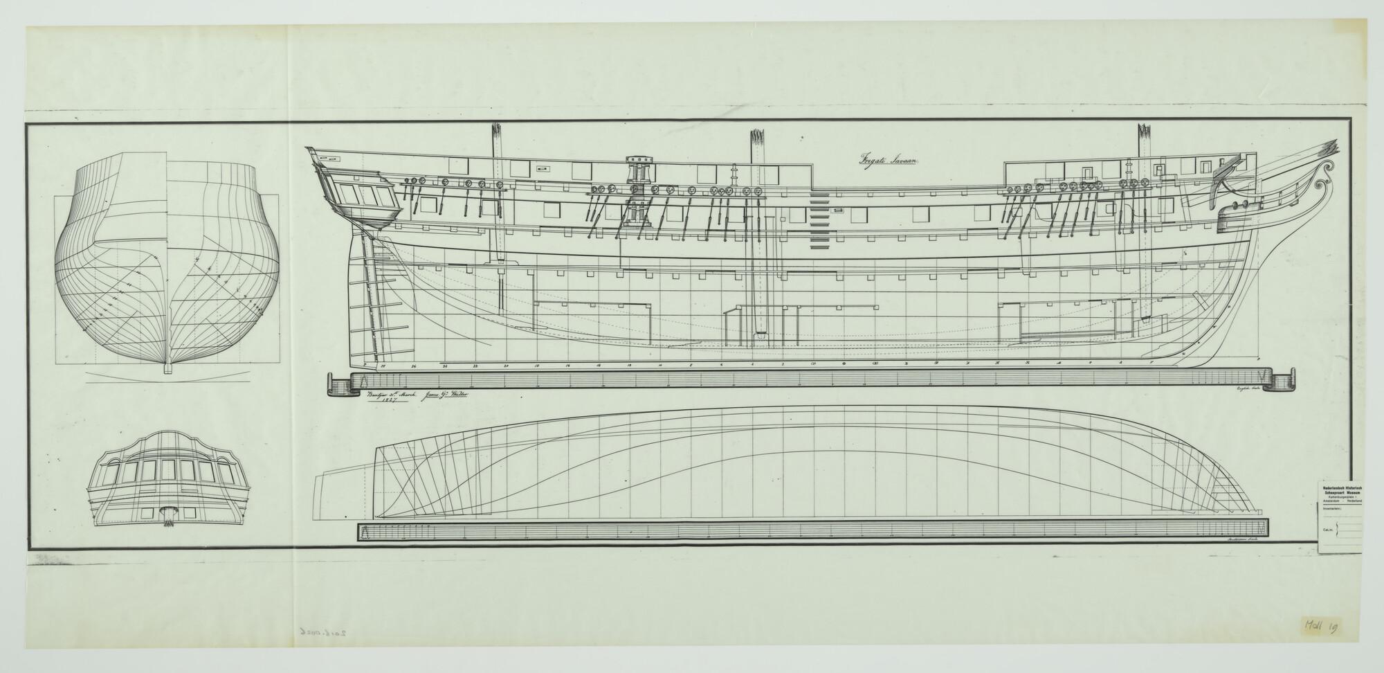 Lijnenplan, spantenraam, aanzicht op de spiegel en zijaanzicht over stuurboord van het fregat Zr.Ms. Javaan van 44 stukken. Halfdek 6 geschutspoorten, bakdek 3 geschutspoorten en bovendek13 geschutspoorten. Afmetingen: lengte tussen de loodlijnen 145 voet 4 duim (41.10 m), breedte 36 voet en 8 duim. Kaapstander op het halfdek. Fokkemast, grote mast en bezaansmast. Het fregat ...