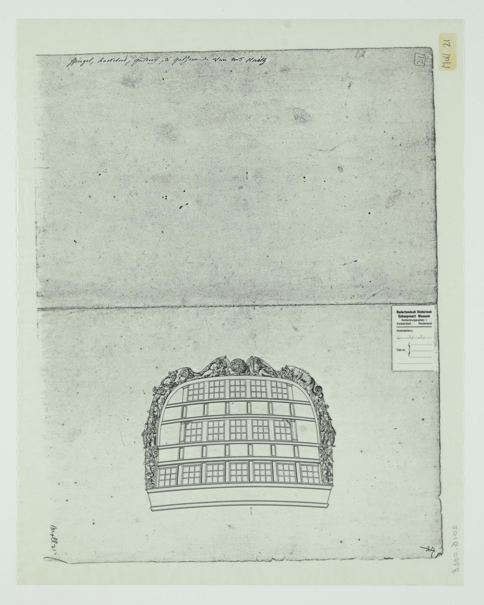 Aanzicht van de bewerkte spiegel met hakkebord van een oorlogsschip uit de achttiende of negentiende eeuw waarbij drie dekken zijn afgebeeld.