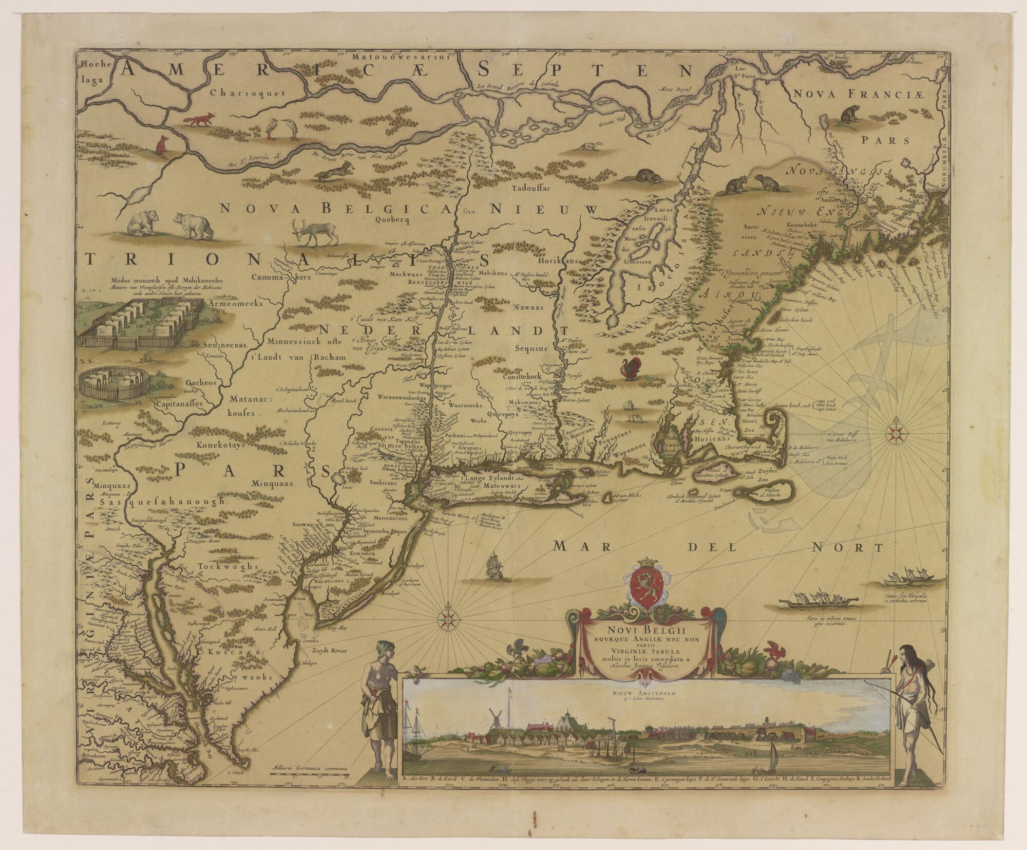 Met de hand gekleurde kaart van Nieuw Belgie, Nieuw Nederland en een deel van Virginia. Uitgave Nicolaas Visscher (1639 - 1709), Amsterdam, 1684. Vierde staat met aanzicht van Nieuw-Amsterdam (met Philadelphia & privilege Staten Generaal).