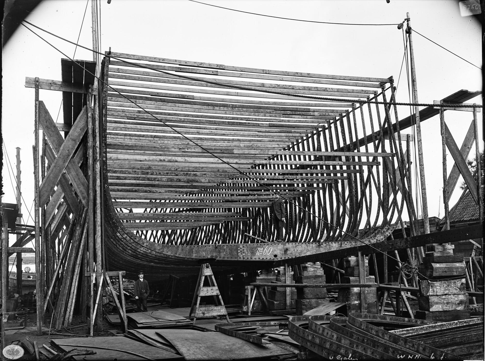 Het stalen barkschip Van Galen in aanbouw op de werf De Nachtegaal te Amsterdam. Het overeind zetten van de spanten. Spant nummer 60 staat, juli 1890.