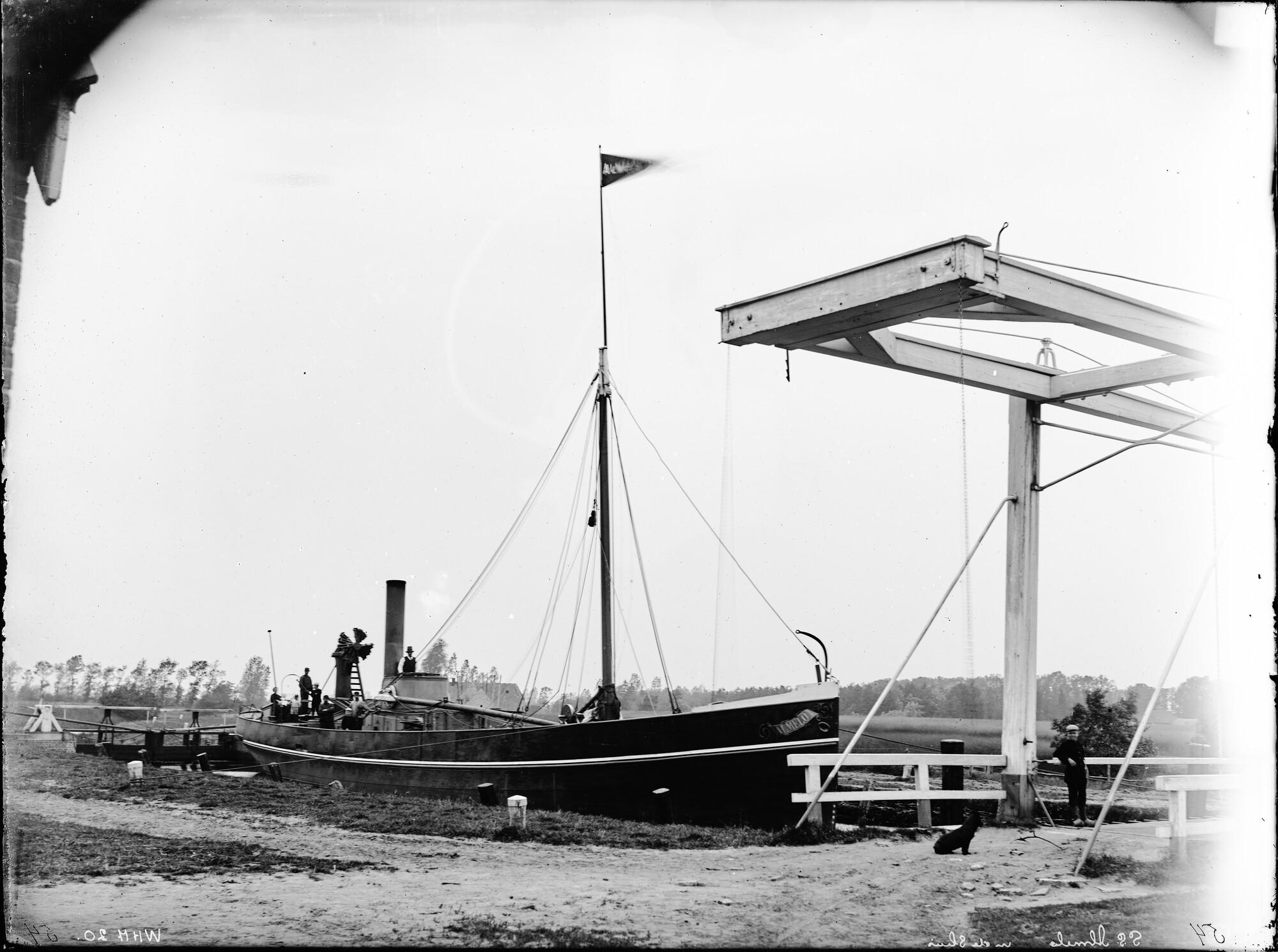 Het ss. Almelo I ligt afgemeerd in een sluis bij Almelo, gezien van stuurboord voor, 1891.