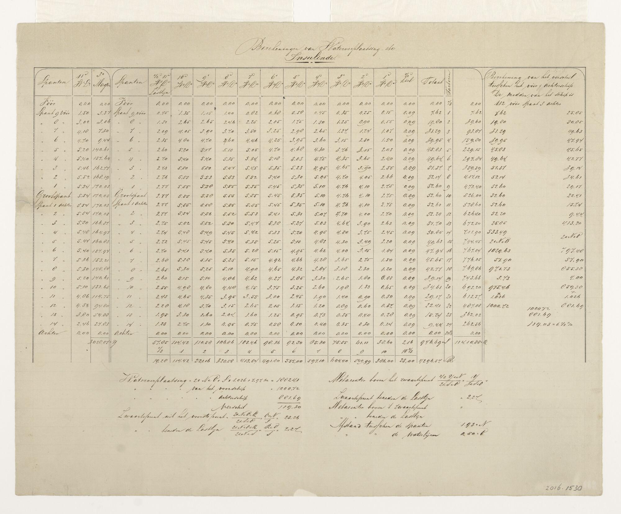 Berekeningen van waterverplaatsing van kiel tot lastlijn (11de waterlijn) van het houten driemast koopvaardij-fregat Insulinde met klippersteven. Afmetingen: lengte over de stevens 49.95 el, wijdte binnen de huid 10.90 el, holte van bovenkant kiel tot bovendekse balken 6.79 el. Te water gelaten: omstreeks 1865. Waterverplaatsing: 1882.41 Nederlandse tonnen. Met foto afgebeeld in De Glorietijd van ...