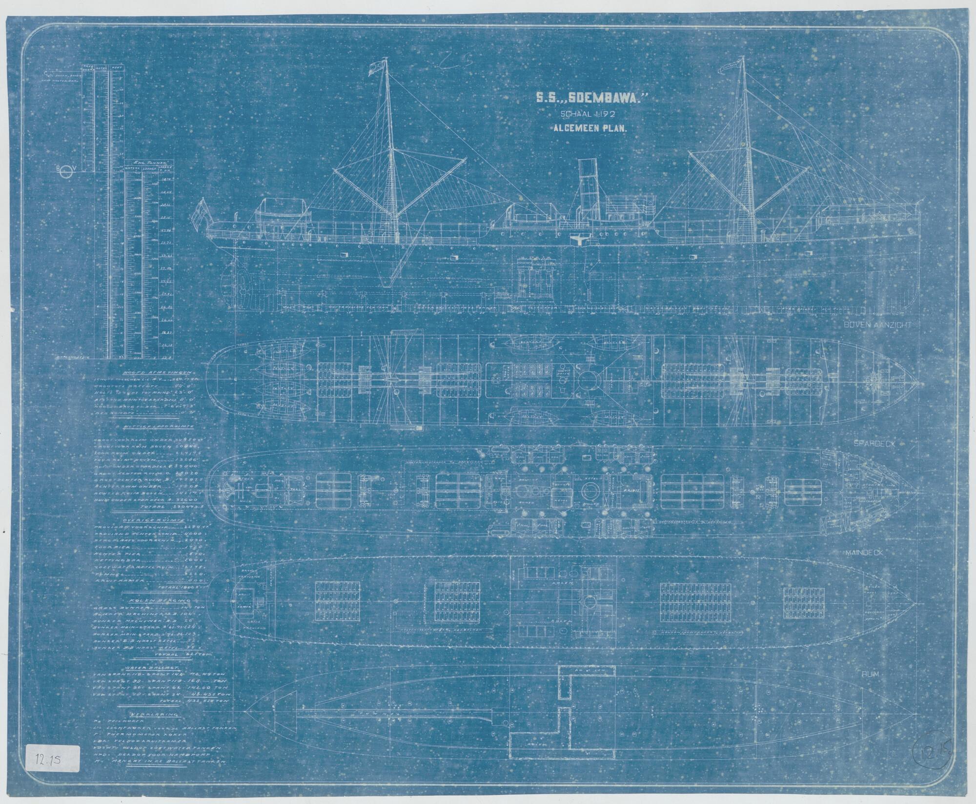 Algemeen plan van het vrachtschip ss. Soembawa van de Stoomvaart-Maatschappij Nederland (SMN).