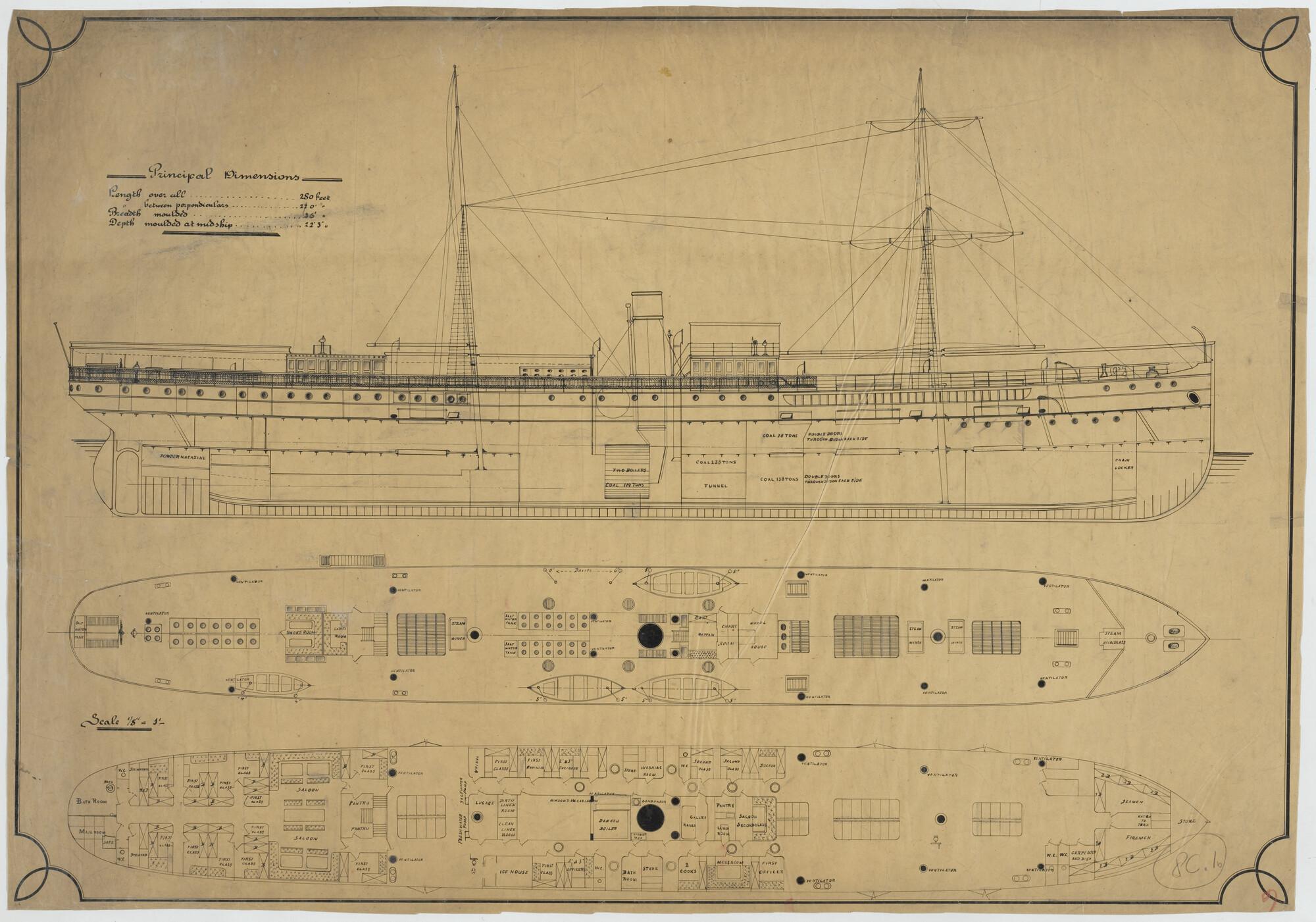 Zijaanzicht en dekplannen van het passagiersschip ss. Prins Willem V voor de KWIM
