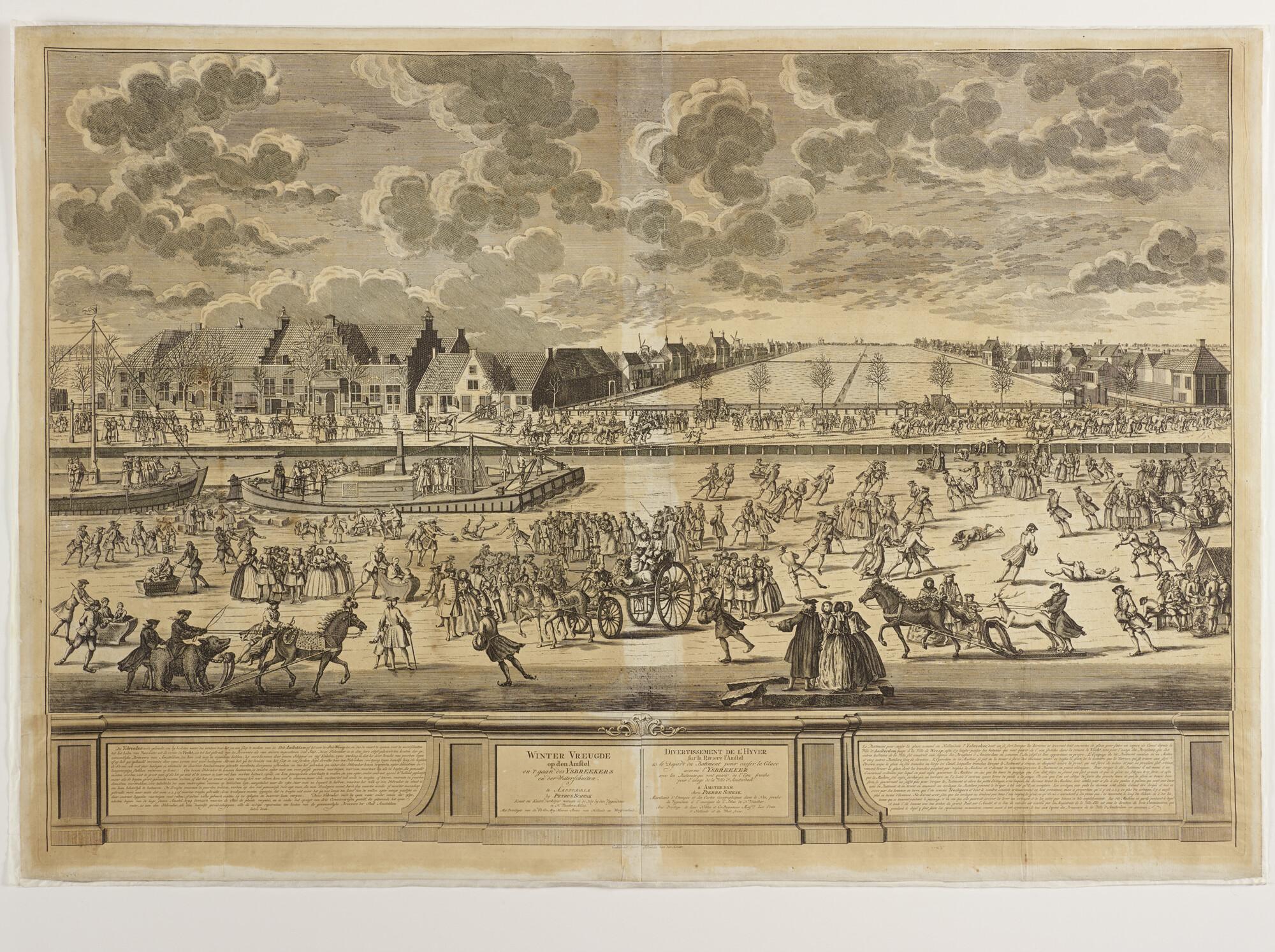 Prent met een afbeelding van de Amstel waarop allerlei vormen van ijspret plaatsvinden. Tegelijkertijd wordt er een vaargeul opengebroken door de ijsbreker van de brouwers van Amsterdam, met daarachter een waterschuit om vers water vanuit Weesp naar Amsterdam te brengen.