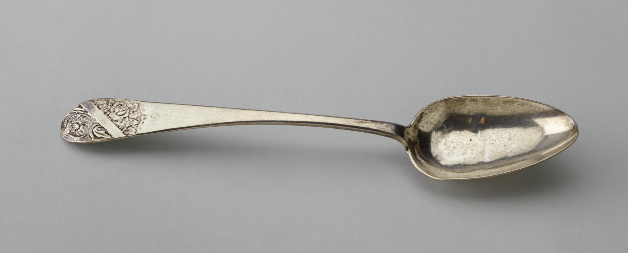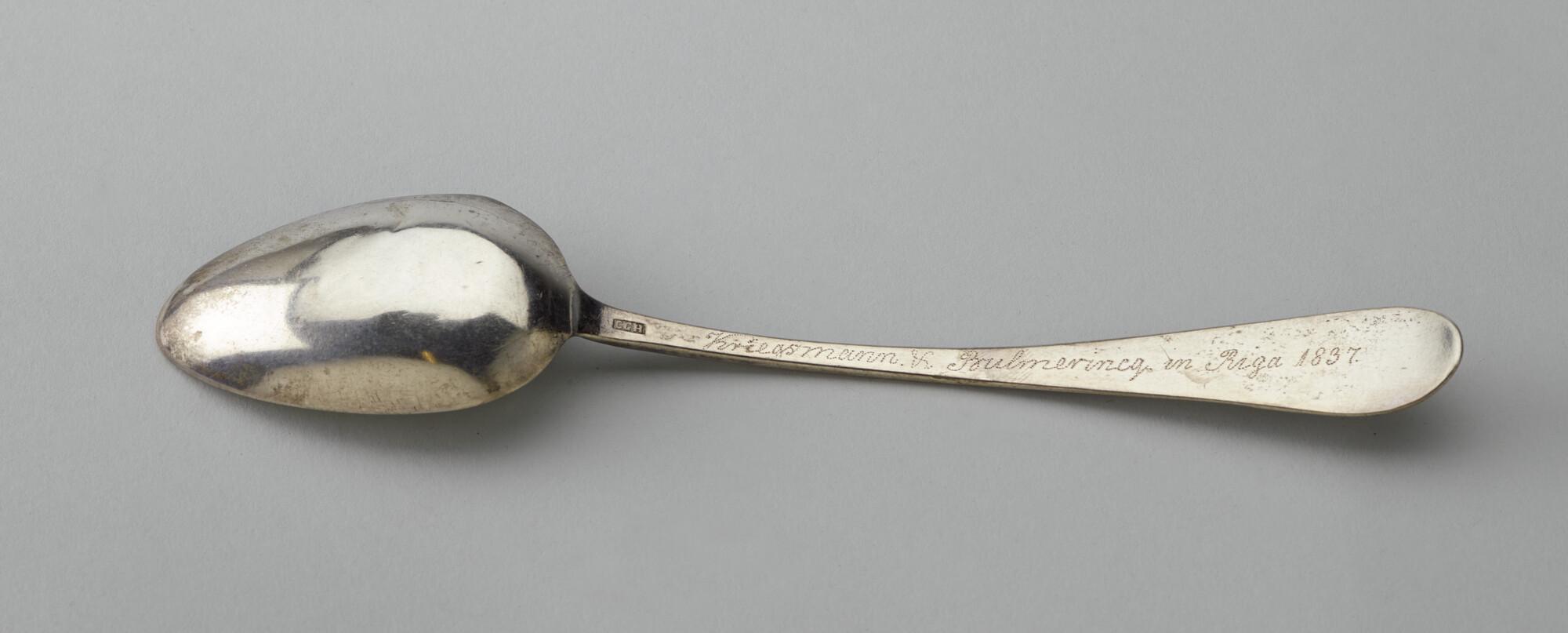 Zilveren Riga- of cargadoorslepel van de handelsonderneming Kriegsmann & Bulmerincq te Riga, 1837. Met de bedrijfsnaam en het jaartal in stippelgravure op de steel.