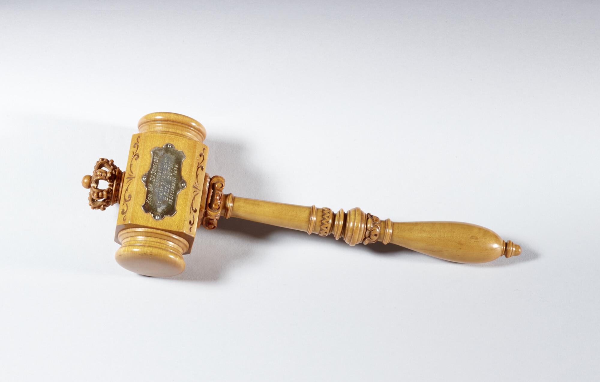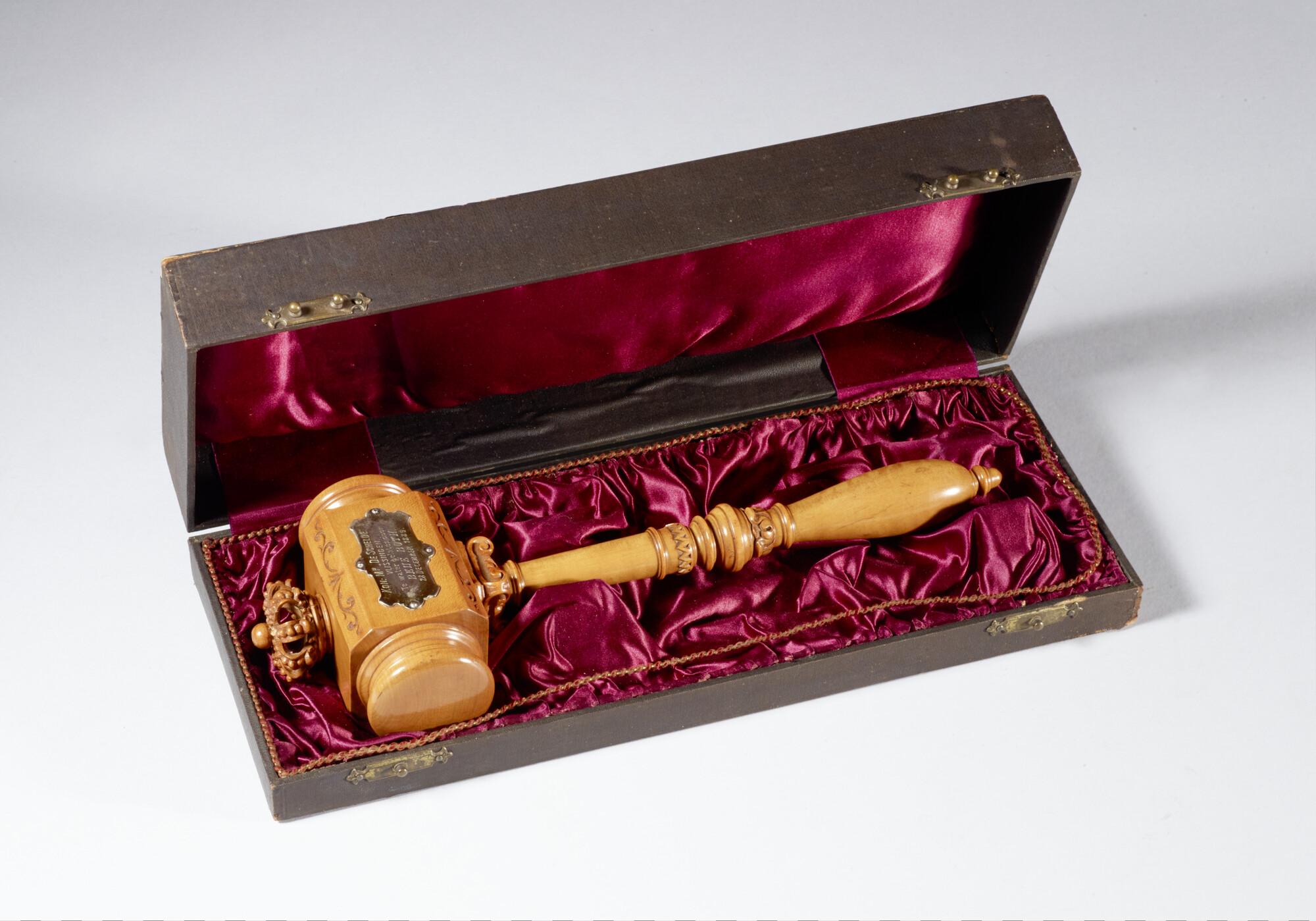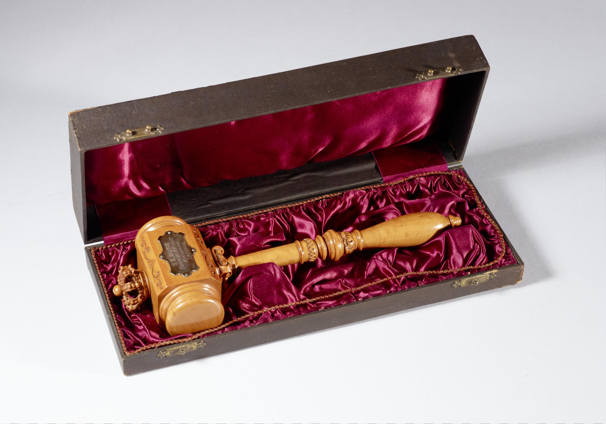 Gekroonde herdenkingshamer, gebruikt bij de tewaterlating door Beije Both van ss. Both van de Koninklijke Paketvaart-Maatschappij op 28 december 1889, in kist.