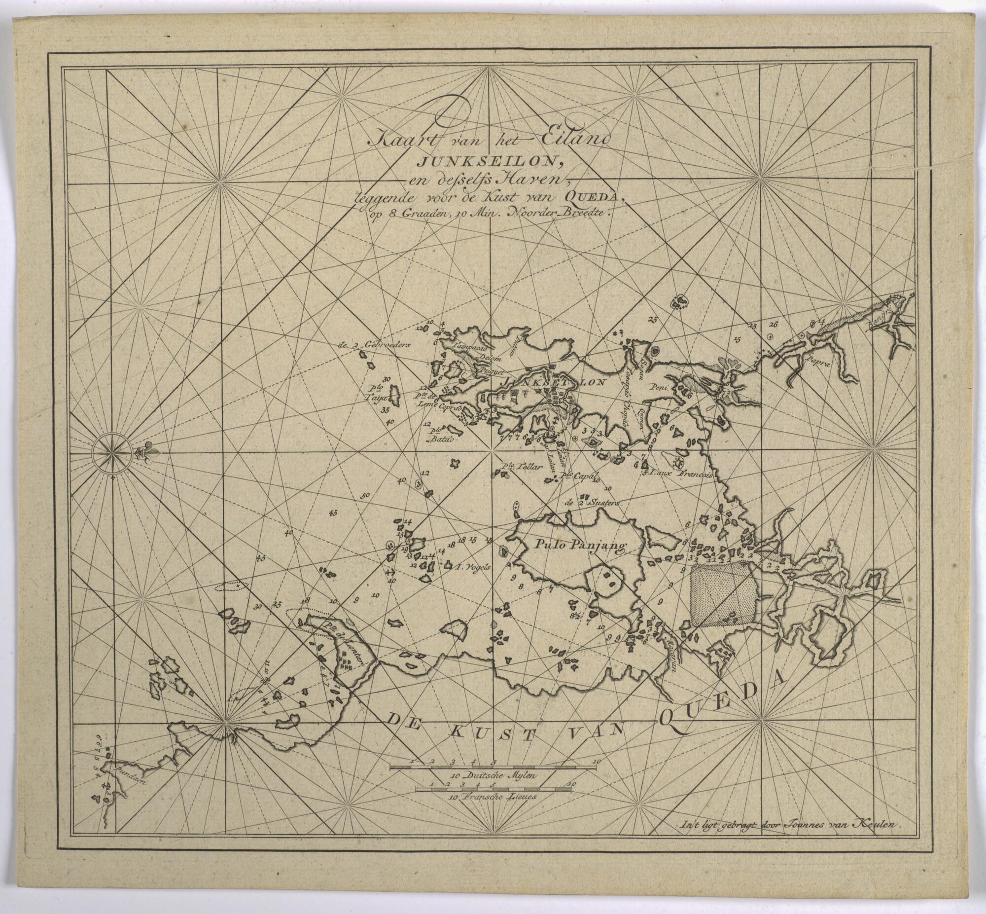 Detailkaart van het eiland Junkseilon (het huidige Phuket, Thailand) voor de kust van Queda (nu Kedah, Maleisië). Opgenomen in van Keulen's atlas Het Oost-Indisch Zeeboek, Amsterdam, 1753.