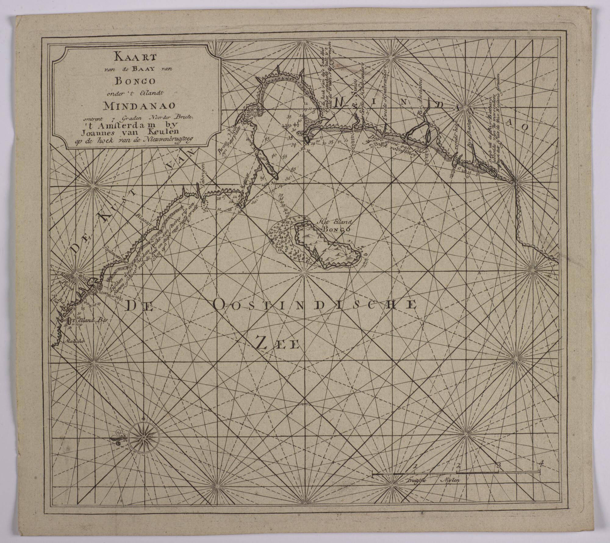 Detailkaart van het eiland Bongo voor de kust van Mindanao in de Filippijnen. Met een aanduiding waar het VOC jacht de Bruinvis is geëxplodeerd. Opgenomen in van Keulen's atlas Het Oost-Indisch Zeeboek, Amsterdam, 1753.