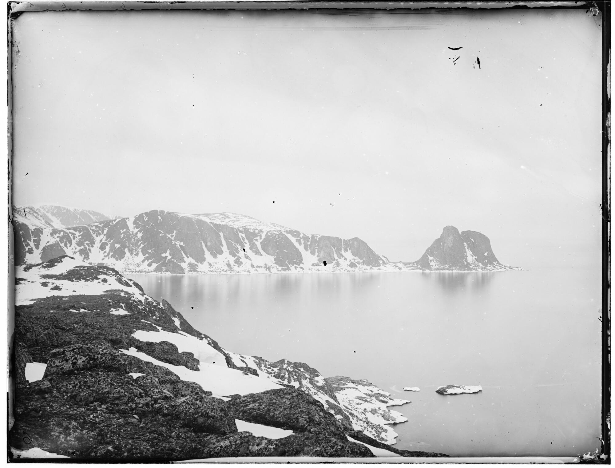Glasnegatief van de 'Gekloofde Klip', gezien vanaf Ganzeneiland. Gemaakt tijdens de eerste reis van de Willem Barents naar Spitsbergen en Nova Zembla in 1878. De 'Gekloofde Klip' was de naam van een klif in het noordoosten van het eiland 'Vogelezang' nabij Spitsbergen.