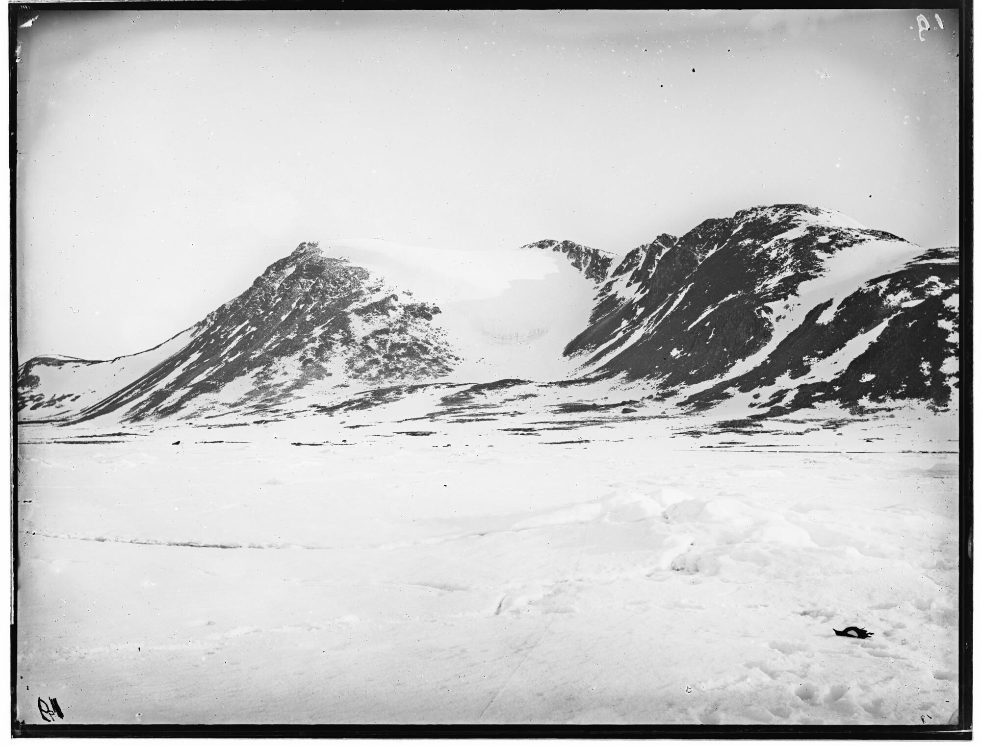 Glasnegatief van baai-ijs op Deeneneiland in Spitsbergen, gemaakt tijdens de eerste reis van de Willem Barents naar Spitsbergen en Nova Zembla in 1878.