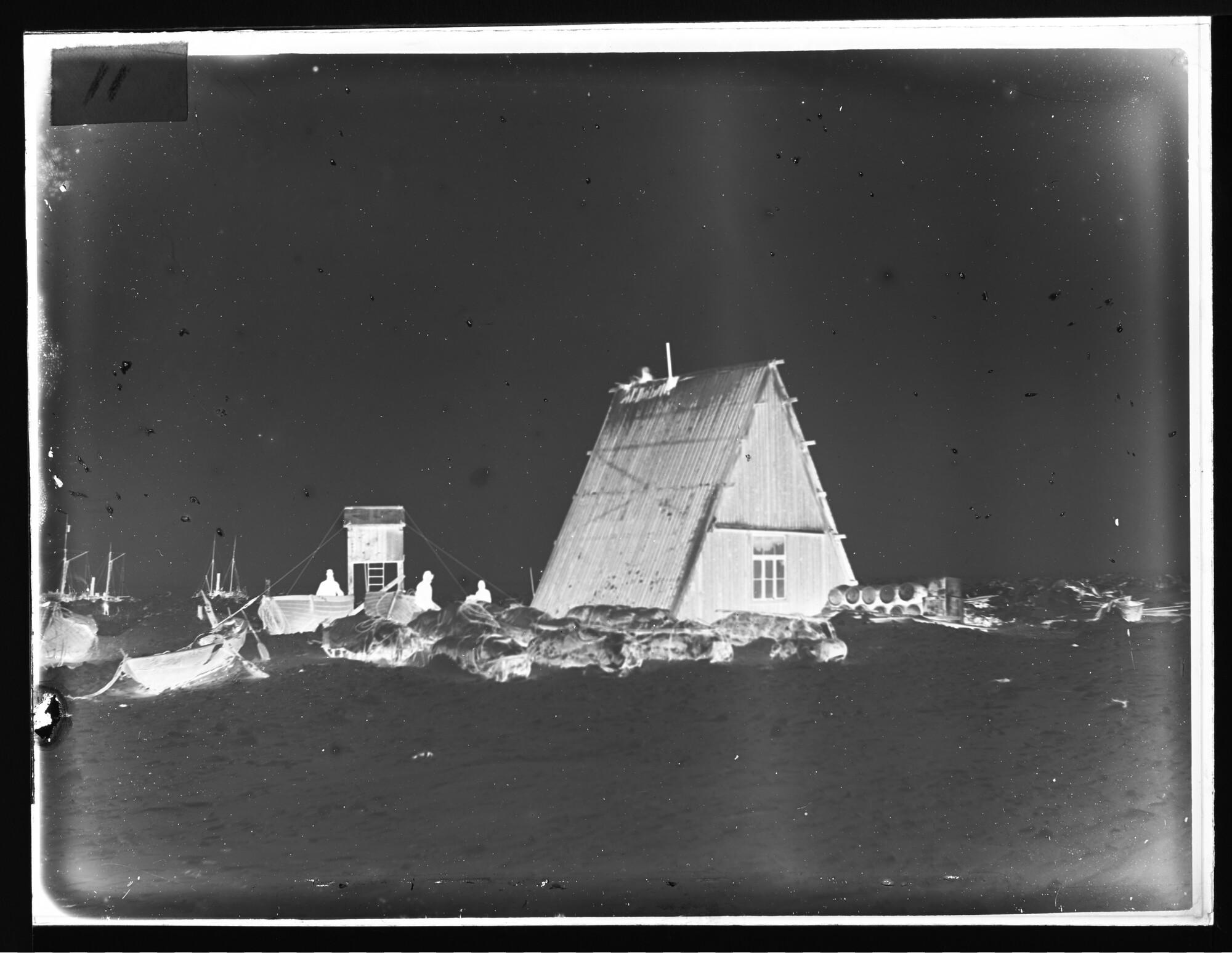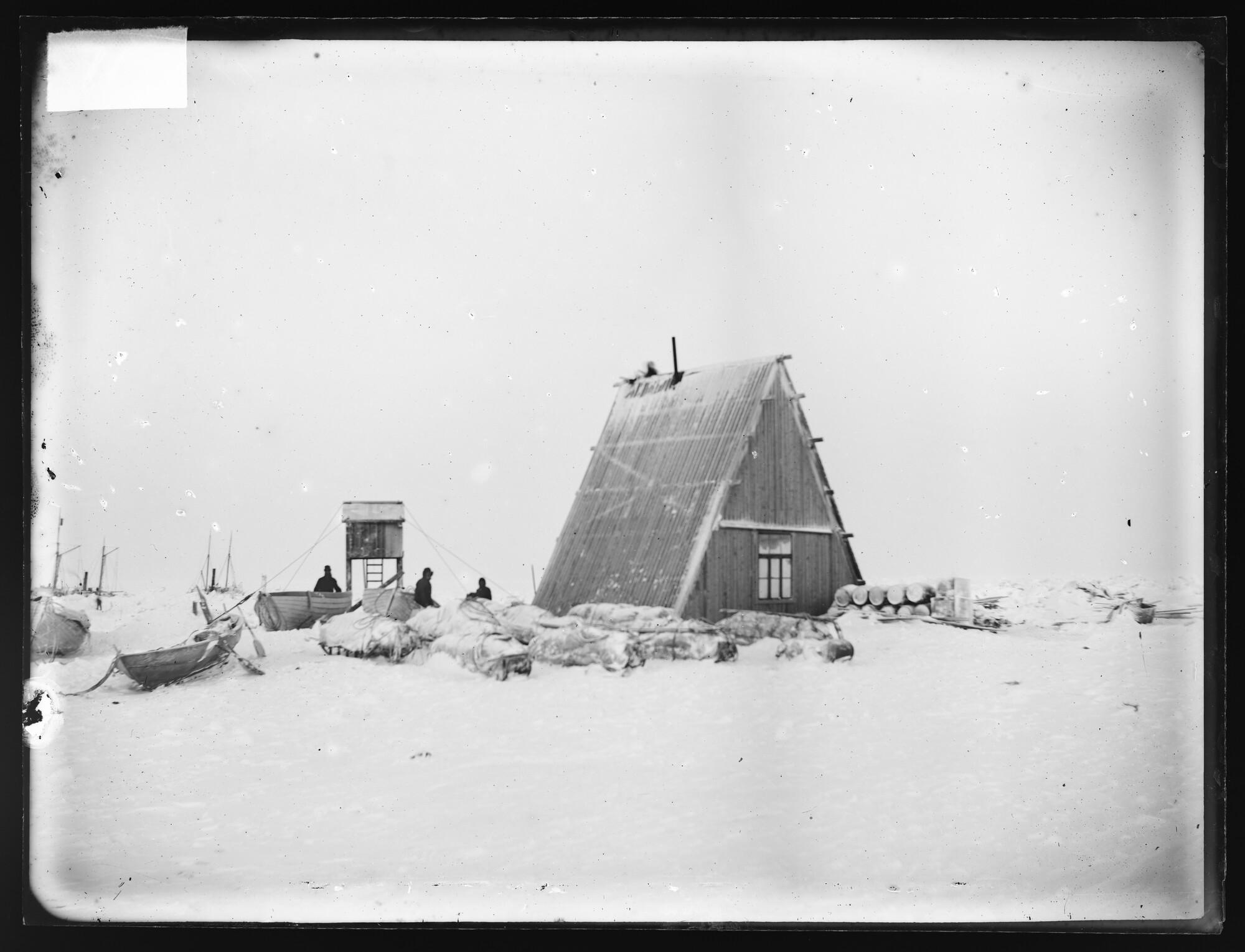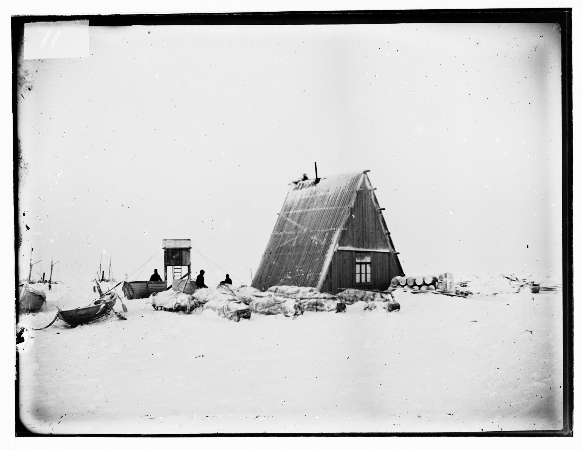 Glasnegatief van het huis en de thermometerhut op ijsschots Nieuw Holland in de Karazee op 16 januari 1883. Van het resterende hout van het oorspronkelijke prefab huis, werd door timmerman Svend Pedersen dit onderkomen gebouwd. De bouw startte op 7 december 1882. Het huis mat 6 bij 8 meter. Deze foto is kort na de ...