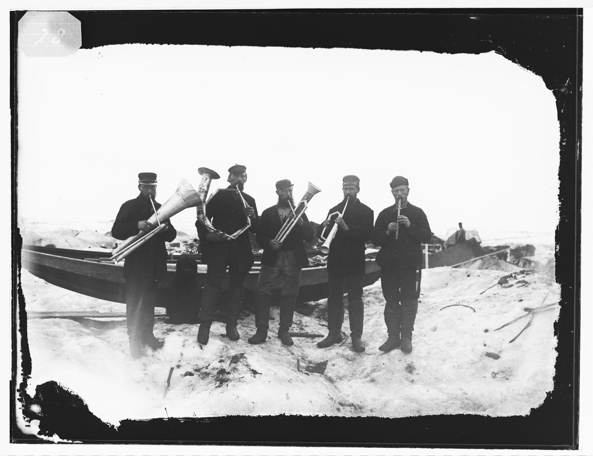 Glasnegatief van een muziekcorps bestaande uit vermoedelijk Deense expeditieleden van de Dijnmphma op 25 juli 1883. De instrumenten werden vervaardigd uit weggeworpen blikjes en deden dienst bij het afscheid op 31 juli. Ook een hond poseert voor de foto.