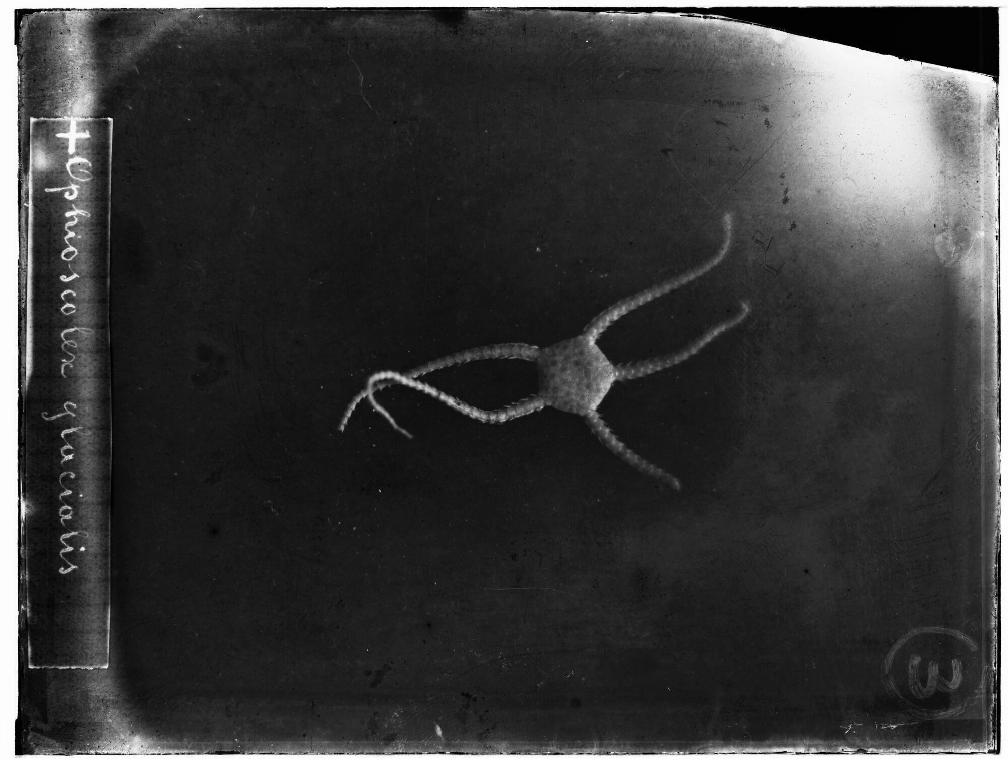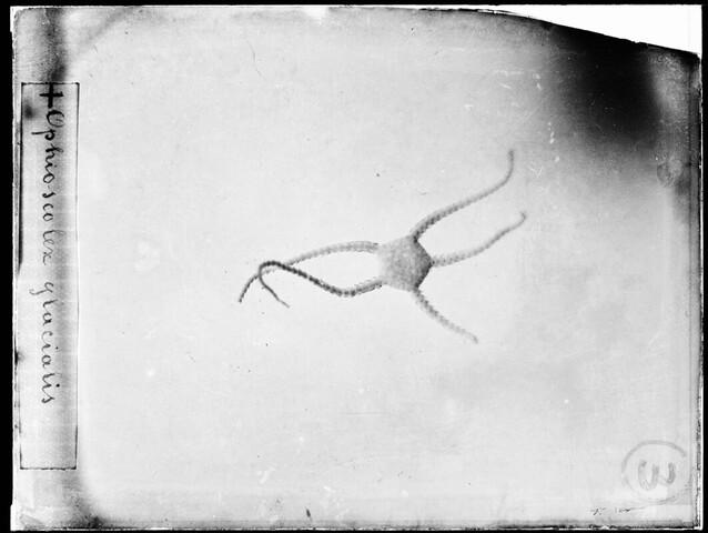 Glasnegatief van een Ophioscolex glacialis, een slangster uit de familie Ophiomyxidae, in de Karazee gevangen door Johannes Marinus Ruijs tijdens de Nederlandse Poolexpeditie van 1882 - 1883.