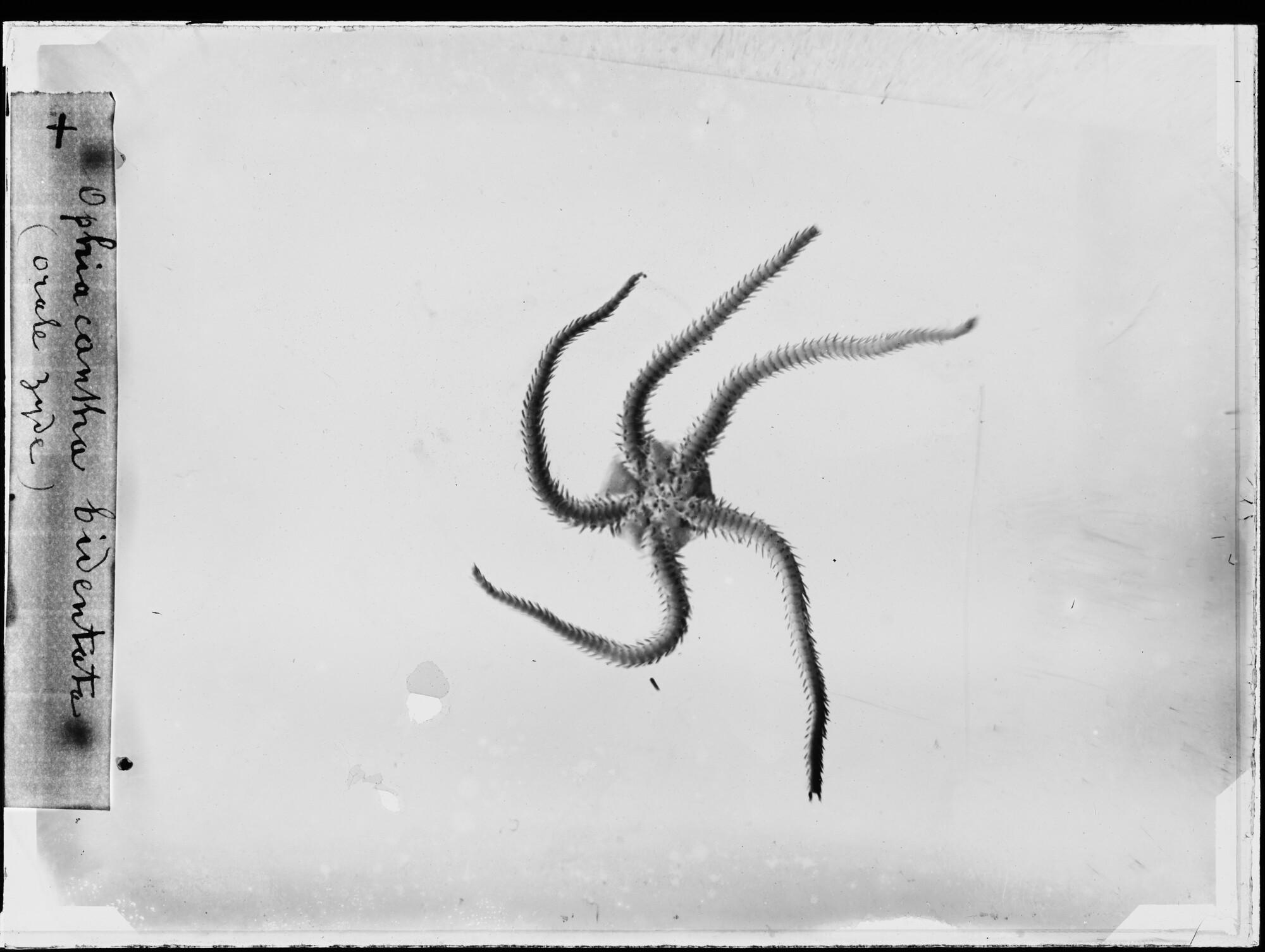 Glasnegatief van een Ophiacantha bidentata, een slangster uit de familie Ophiacanthidae, in de Karazee gevangen door Johannes Marinus Ruijs tijdens de Nederlandse Poolexpeditie van 1882 - 1883.