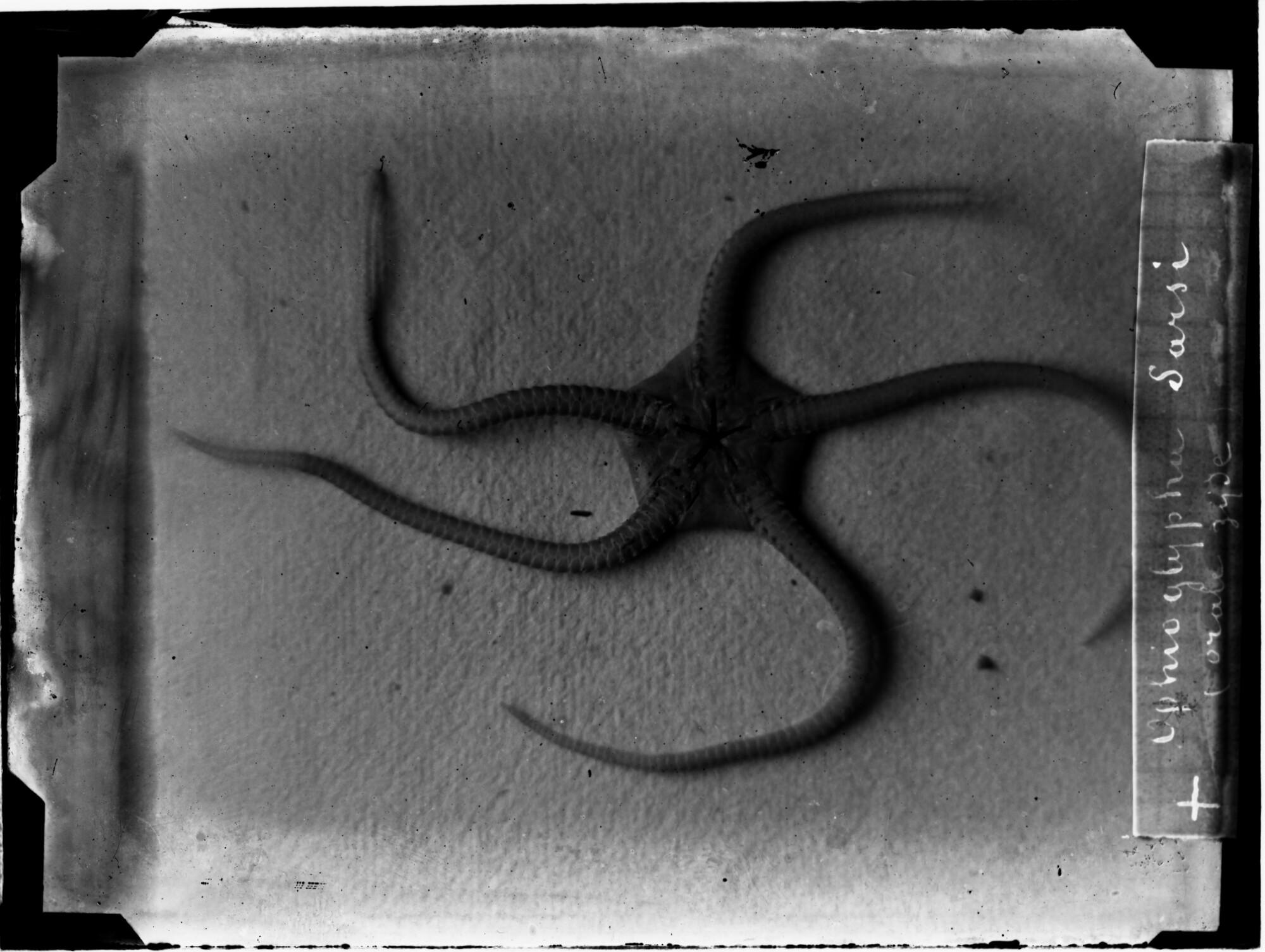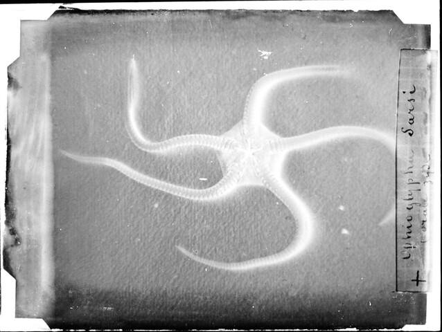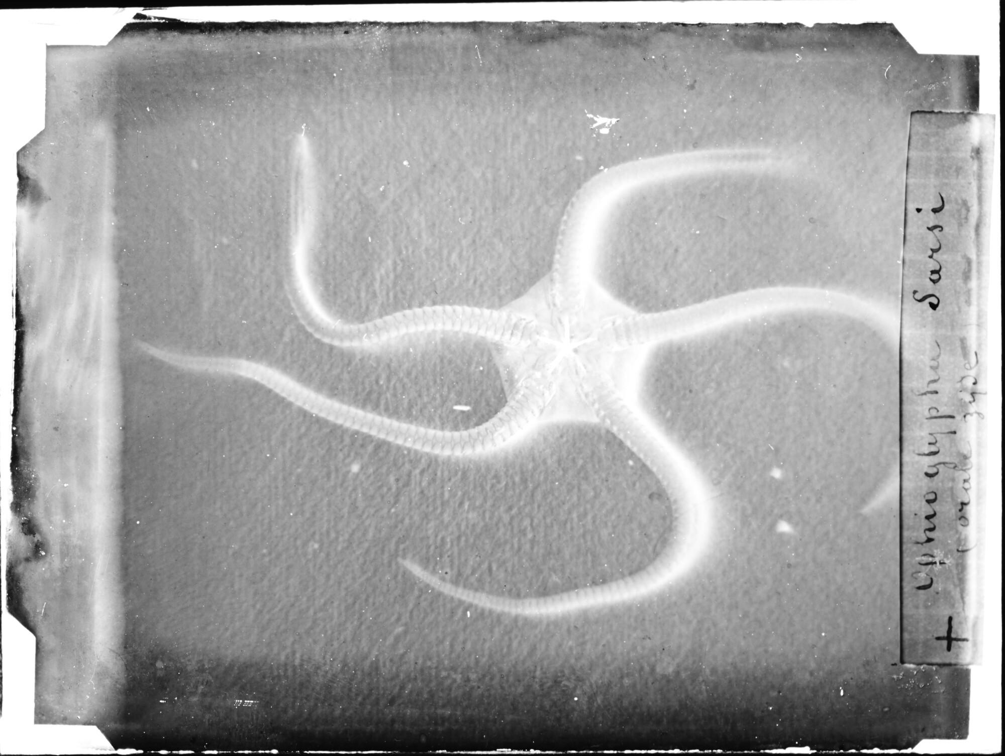 Glasnegatief van een Ophiura sarsii, een slangster uit de familie Ophiuridae, in de Karazee gevangen door Johannes Marinus Ruijs tijdens de Nederlandse Poolexpeditie van 1882 - 1883.