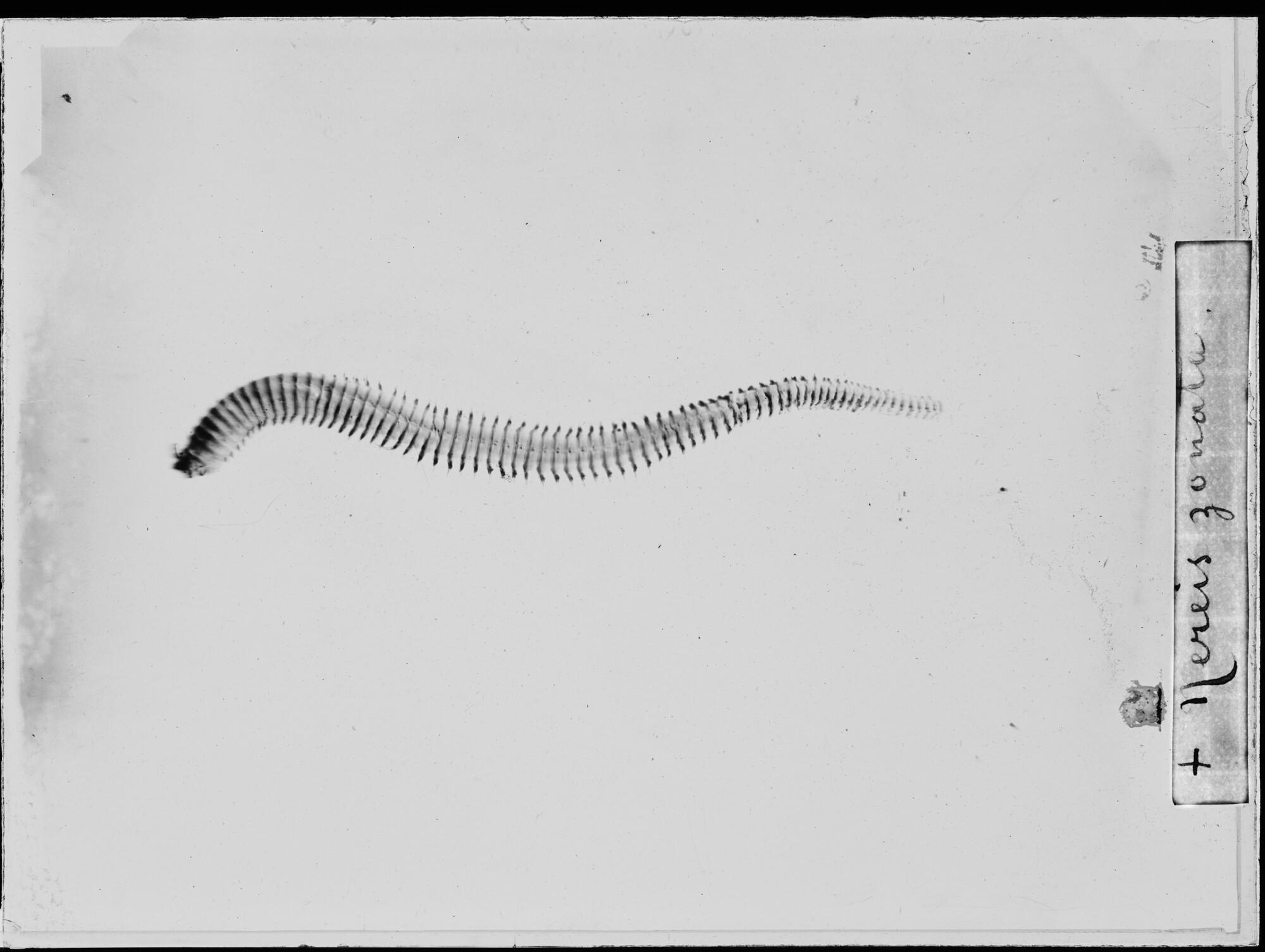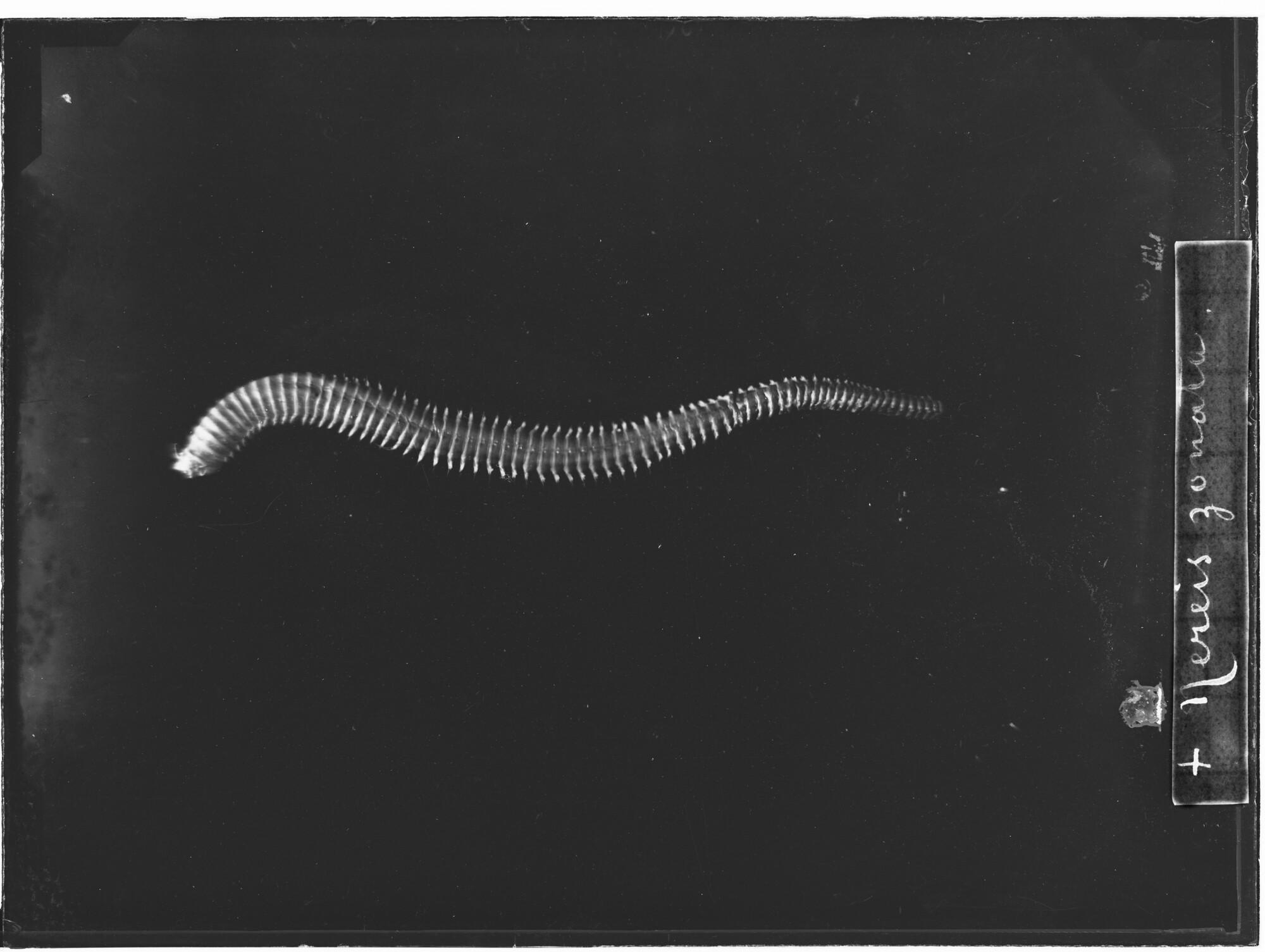 Glasnegatief van een Nereis zonata, een borstelworm uit de familie Nereididae, in de Karazee gevangen door Johannes Marinus Ruijs tijdens de Nederlandse Poolexpeditie van 1882 - 1883.