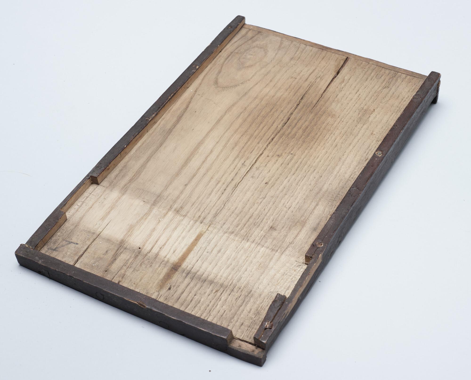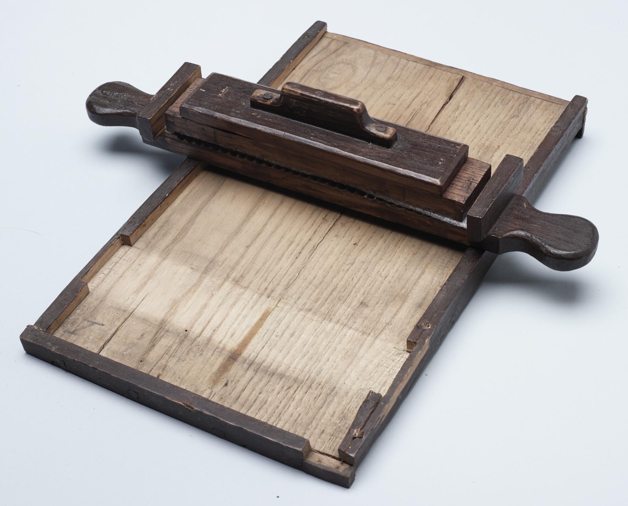 Houten pillen plankje bestaand uit die delen om pillen te draaien. Onderdeel uit de medicijnkist van de Nederlandse Noordpool Expeditie 1882 - 1883.