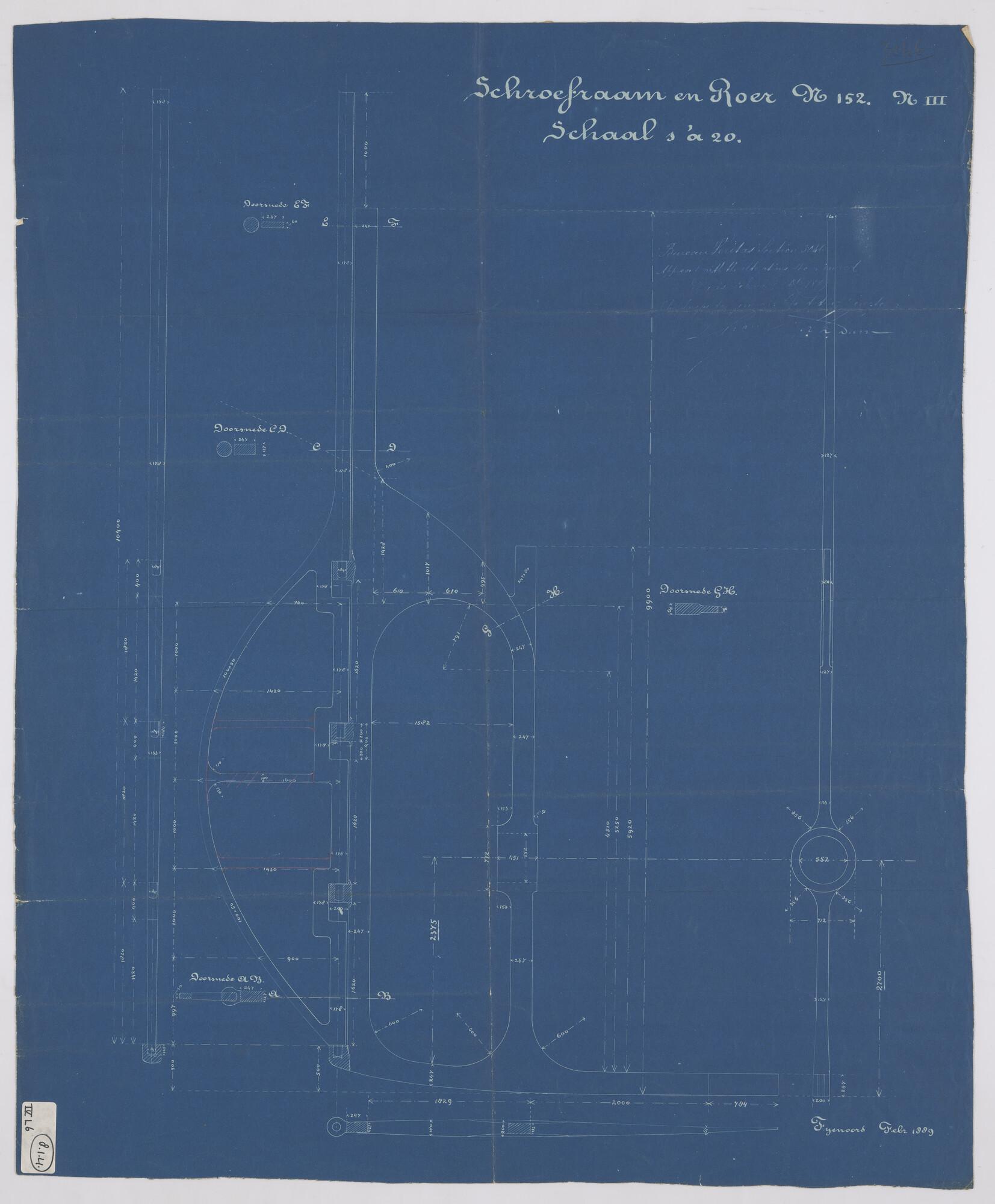 Technische tekening van schroefraam en roer voor passagiersschip ss. Prins Willem III.