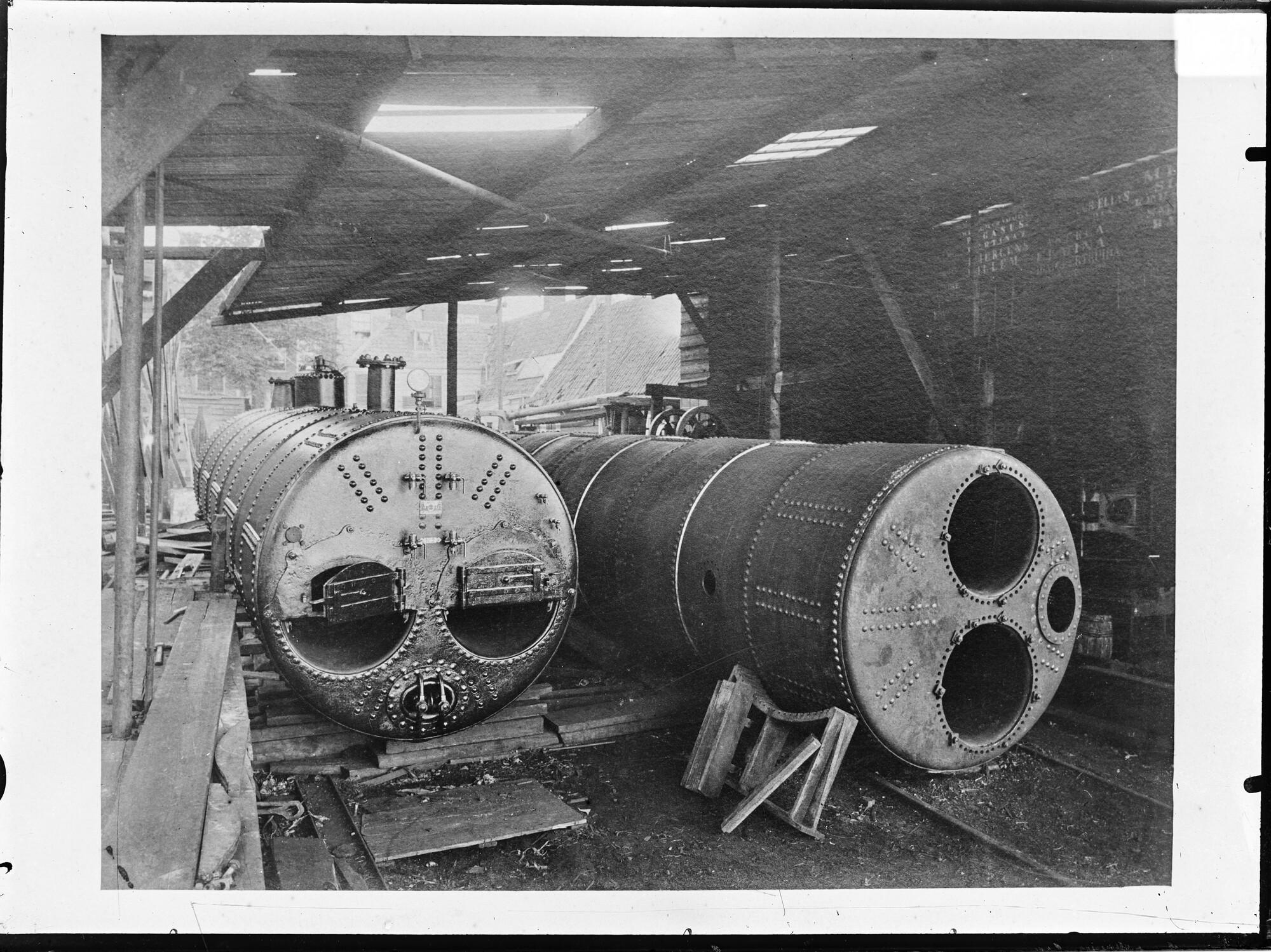 Reproductie glasnegatief van twee ketels voor het stoomgemaal van het Hoogheemraadschap Rijnland te Gouda, vervaardigd in de Fabriek van Werktuigen en Ketels van J.F. Meursing te Amsterdam.