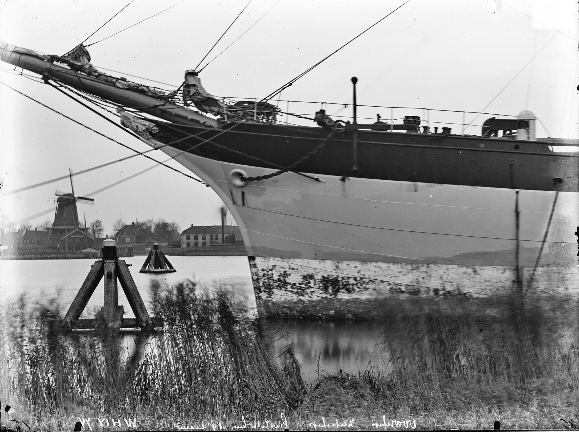 Glasnegatief van de driemast stalen bark Port Patrick, voorschip, afgemeerd aan een kade in Amsterdam met op de voorgrond riet.