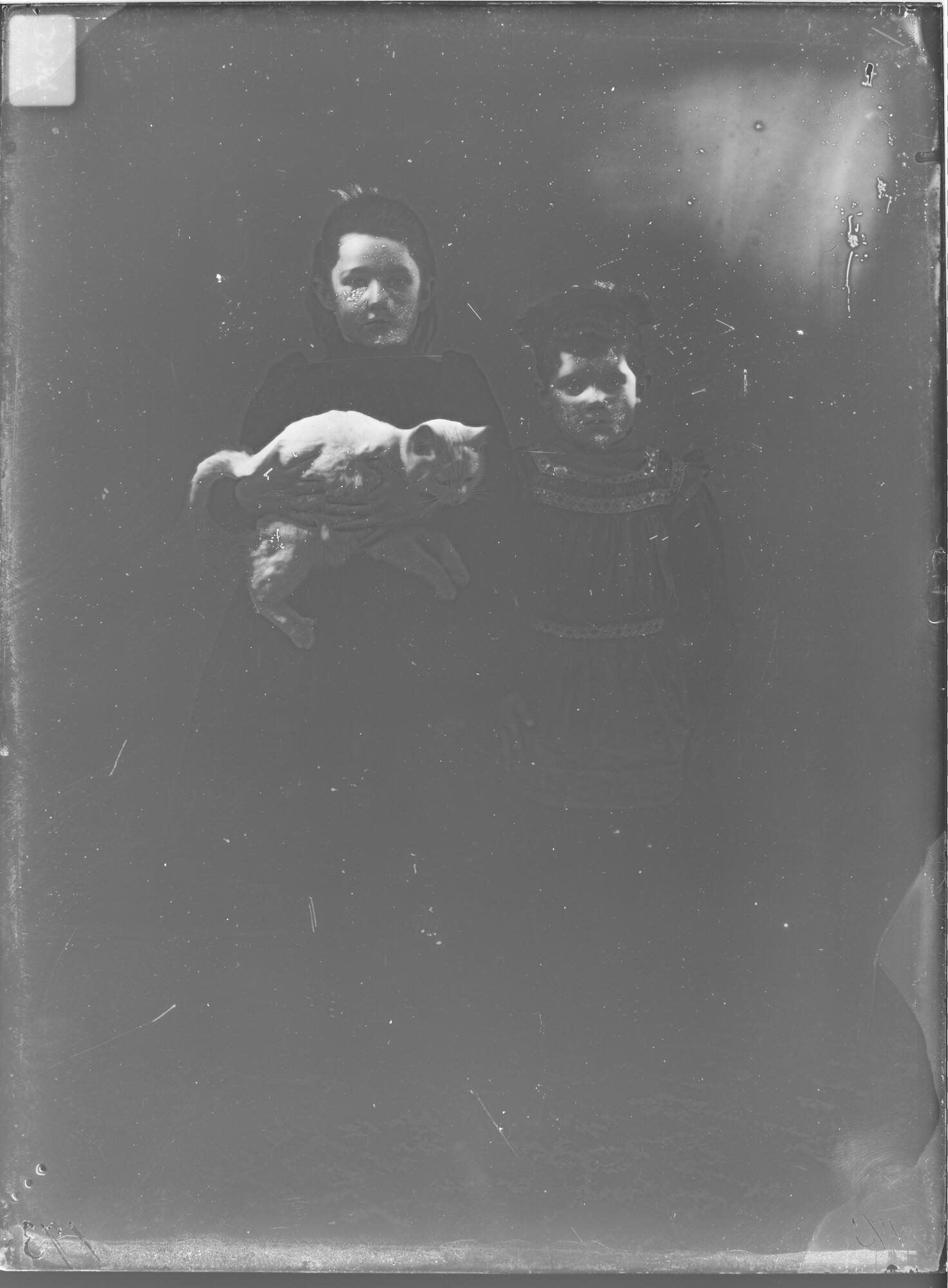 Negatief van een portret van vermoedelijk Maria (1885), met kat in haar armen, en Metta Johanna Meursing (1888), dochters van Jan Frederick Meursing en Anthonia Korthals Altes.