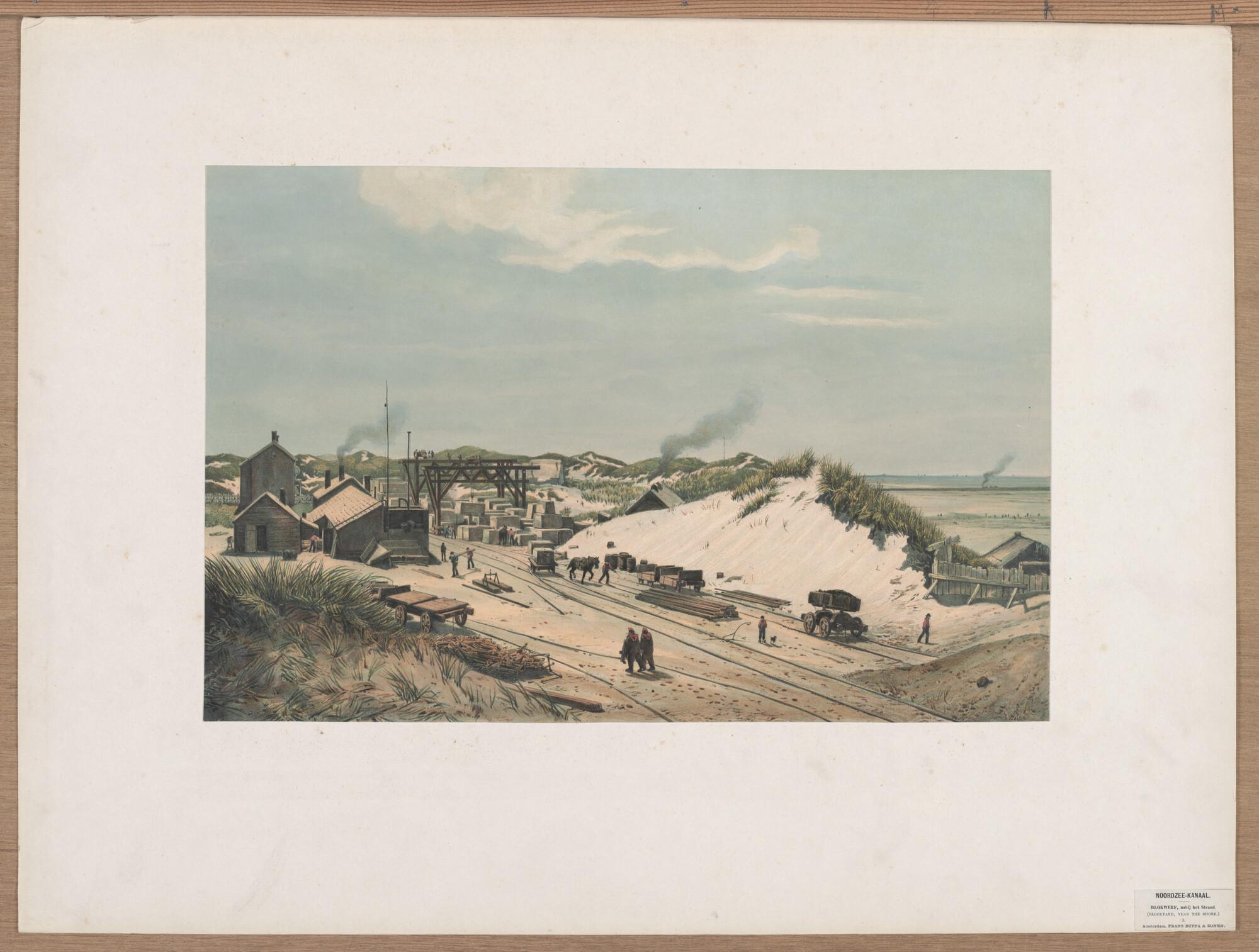 Lithografie Noordzee-Kanaal, Blokwerf, nabij het strand