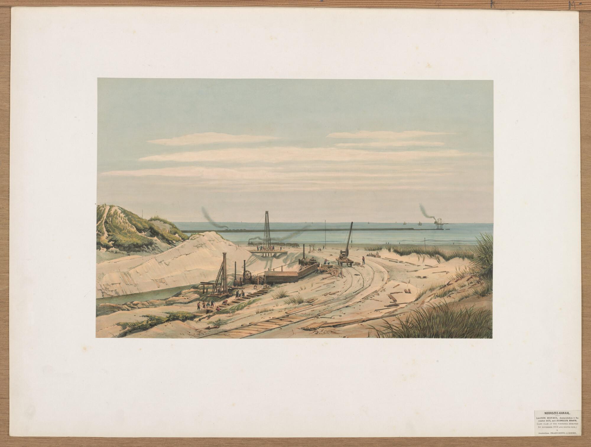 Lithografie Noordzee-Kanaal, Laatste Duinrug, doorgestoken 1 November 1872, met Zuidelijk hoofd
