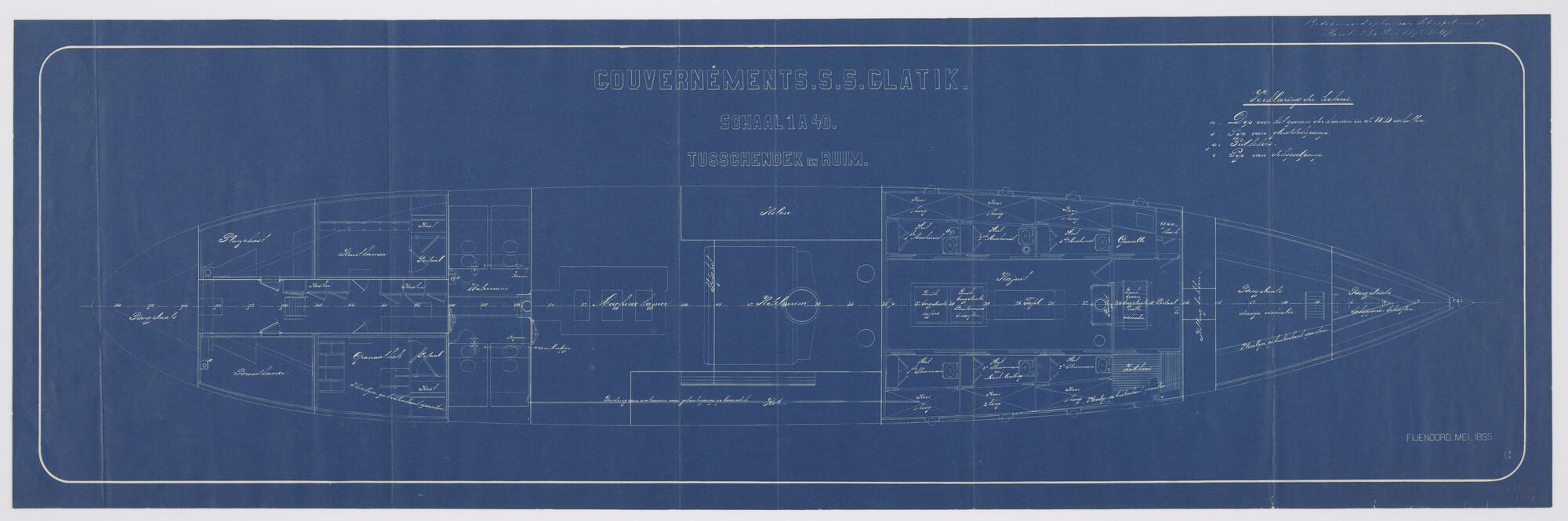 Indelingstekening van het tussendek en het ruim van het stoomschip voor de Gouvernementsmarine Hr.Ms. 'Glatik'