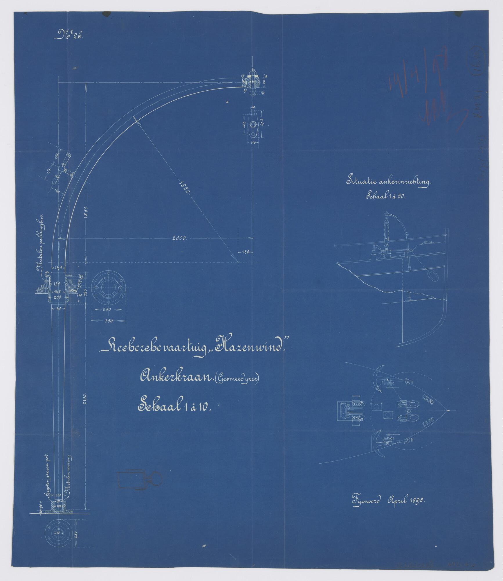 Doorsnede van de gesmeed ijzeren ankerkraan van het stoomschip voor de gouvernementsmarine Hr.Ms. Hazewind