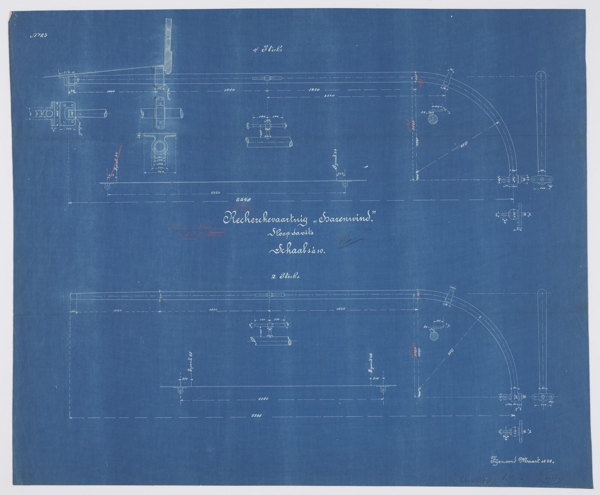 Doorsneden van de sloepdavits van het stoomschip voor de gouvernementsmarine Hr.Ms. Hazewind (recherchevaartuig voor Nederlands-Indië - gewest Atjeh) (schaal 1:10).
