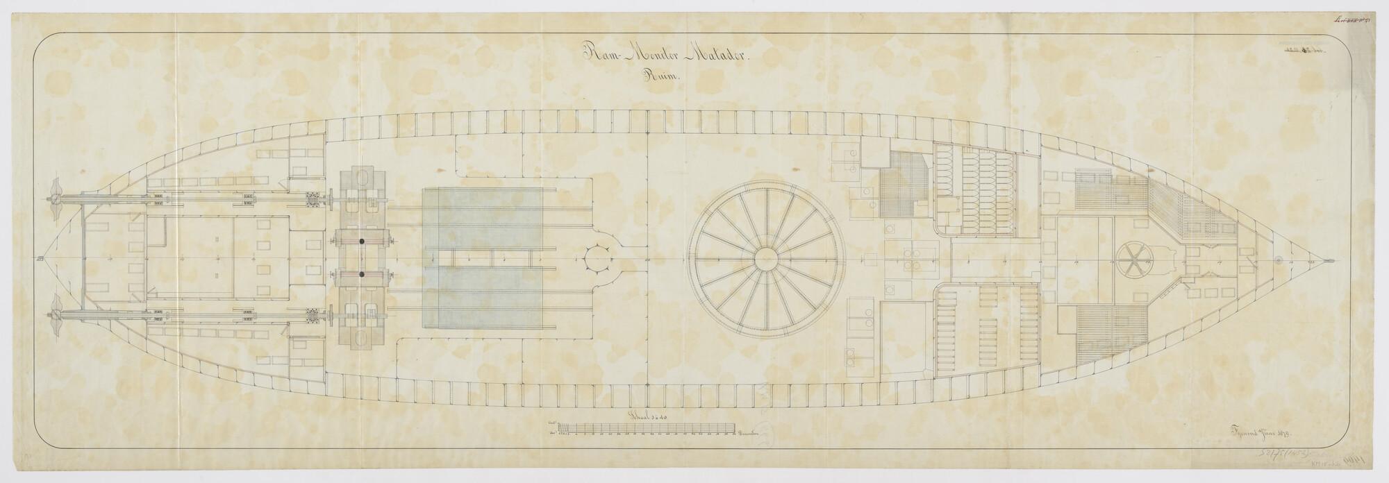 Indelingstekening van het ruim van de rammonitor der 1ste klasse Zr.Ms. 'Matador'