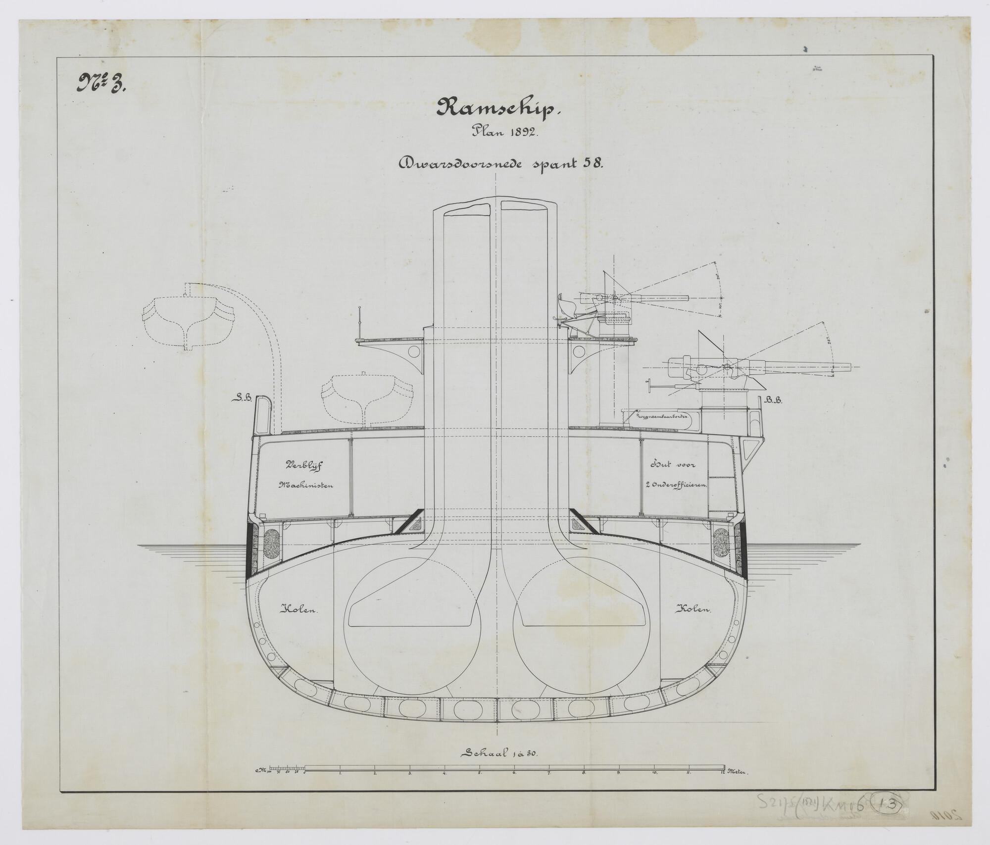 Dwarsdoorsnede spant 58 van het ramschip plan 1892, model voor de pantserschepen Hr.Ms. "Kortenaer", Hr.Ms. "Piet Hein" en Hr.Ms. "Evertsen". Kanon van 7.5 cm, kanon van 15 cm. Verblijf machinisten, hut onderofficieren. Kolenhokken. 2 stoomketels met schoorsteen (schaal 1:50).